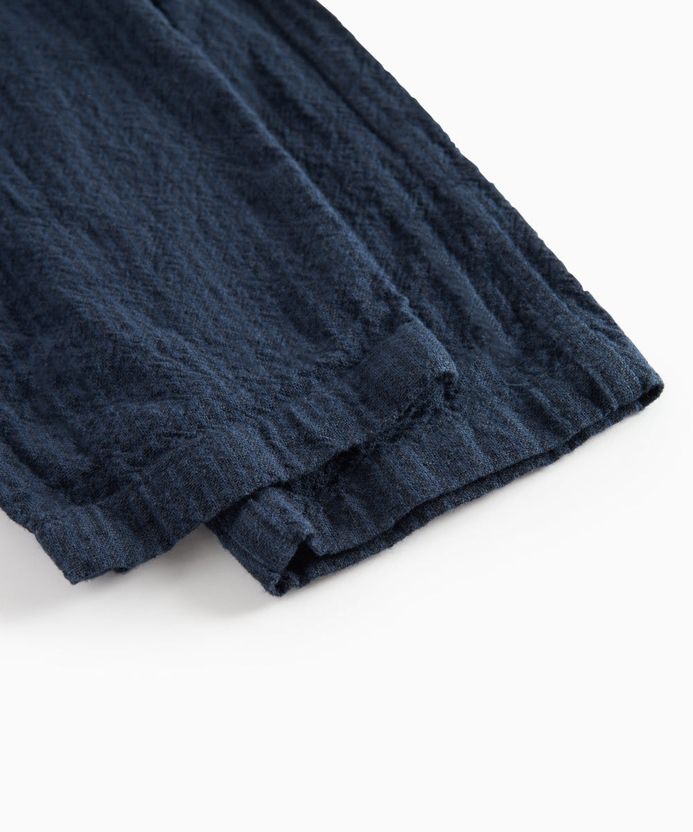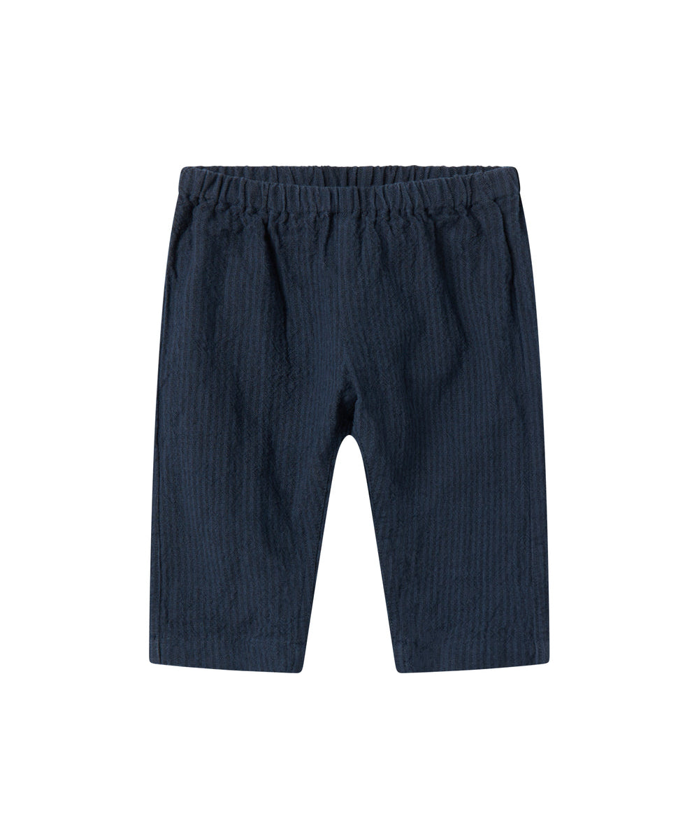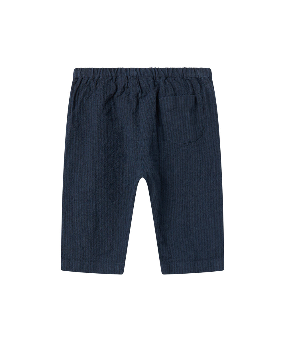 Mørkeblå bukser med elastisk talje og bindebånd i blødt stof til baby