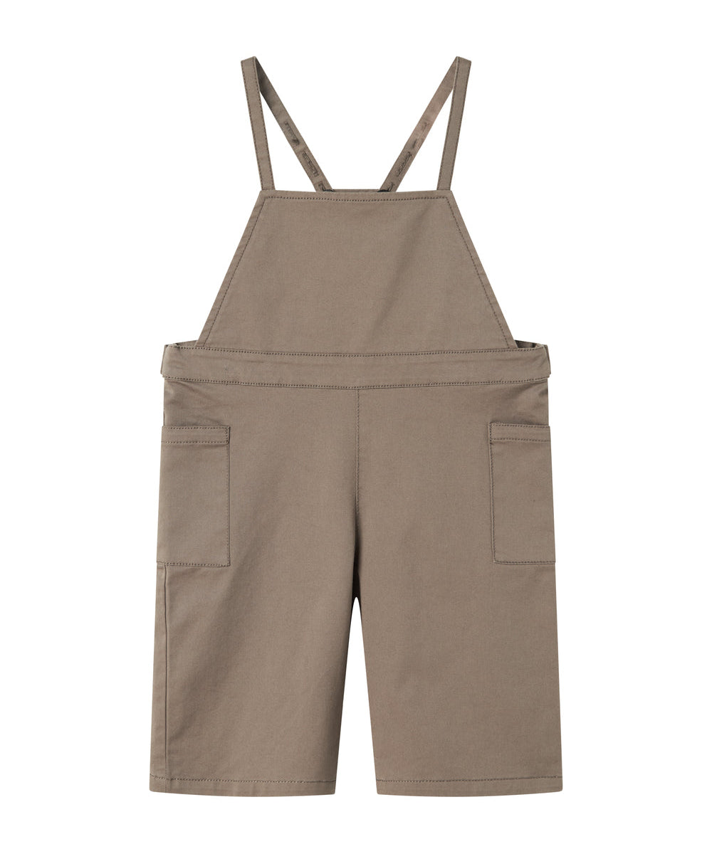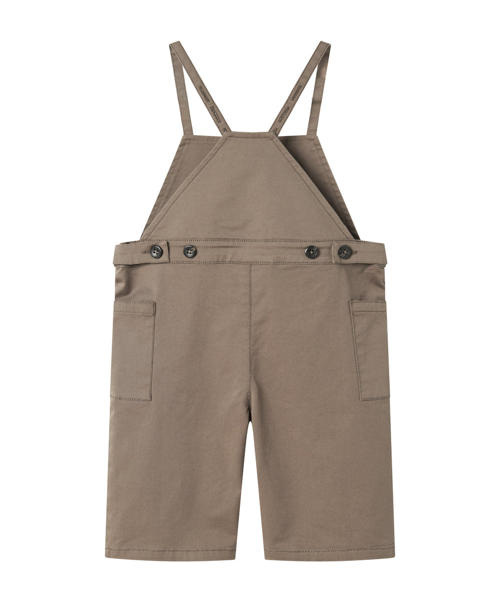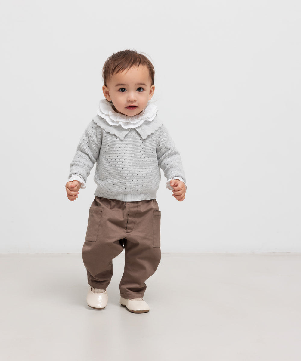 Baby iført mørkegrønne strikkede bukser med seler og grå bluse