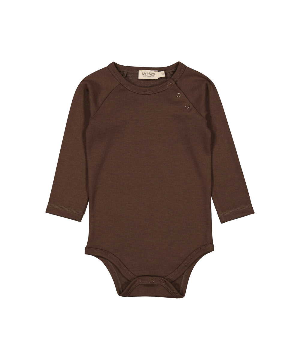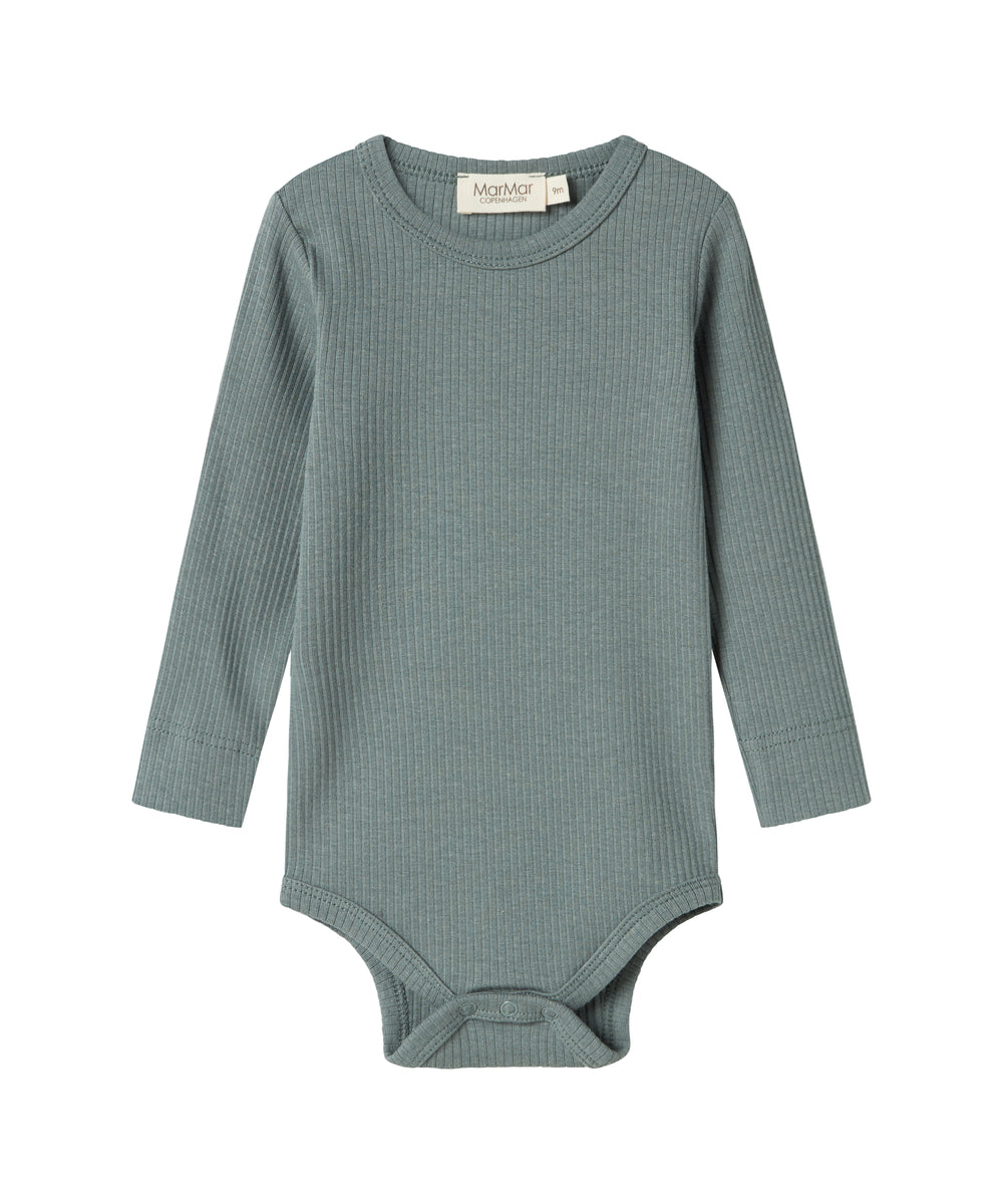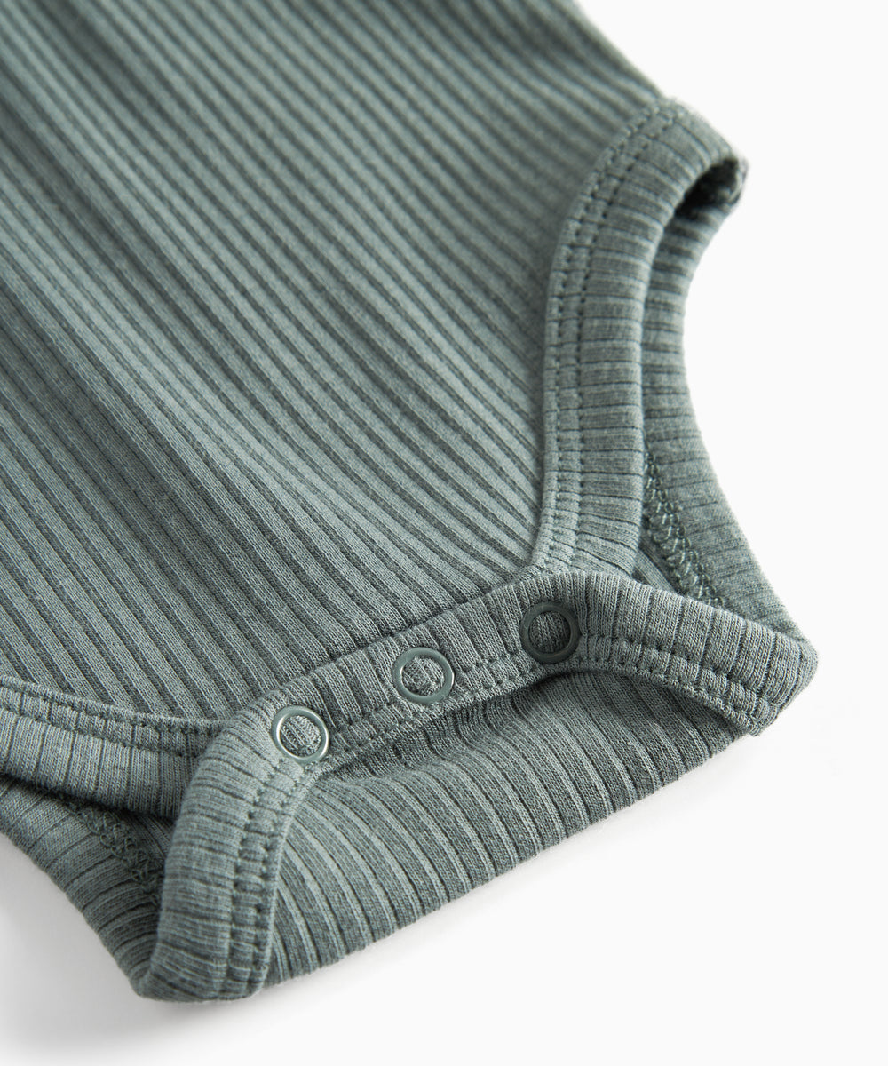 Baby iført mørkegrøn ribbet body med stolpeknapper
