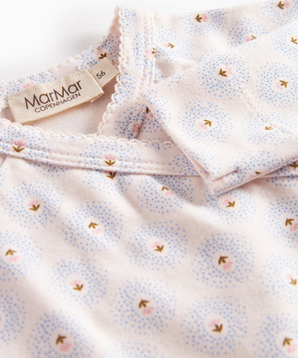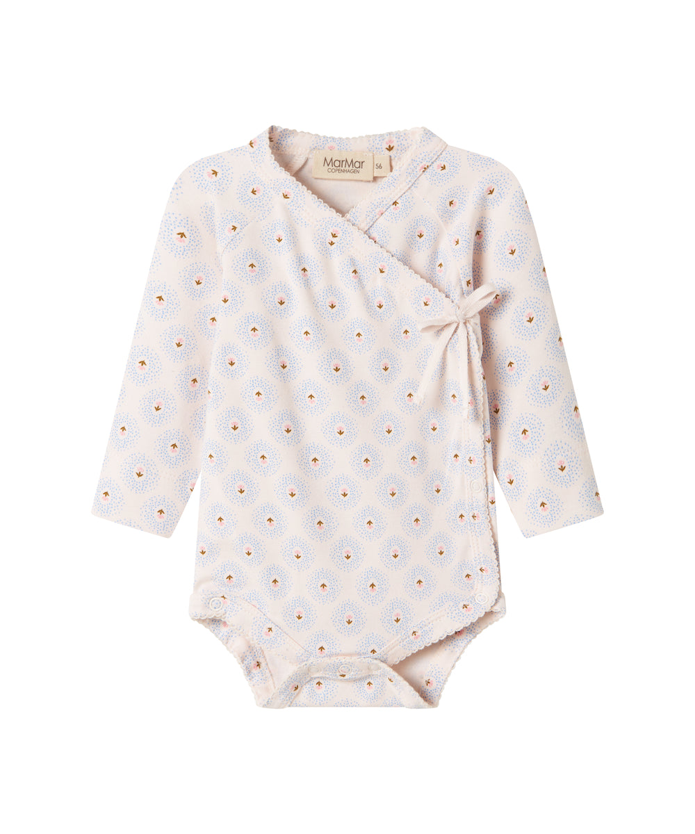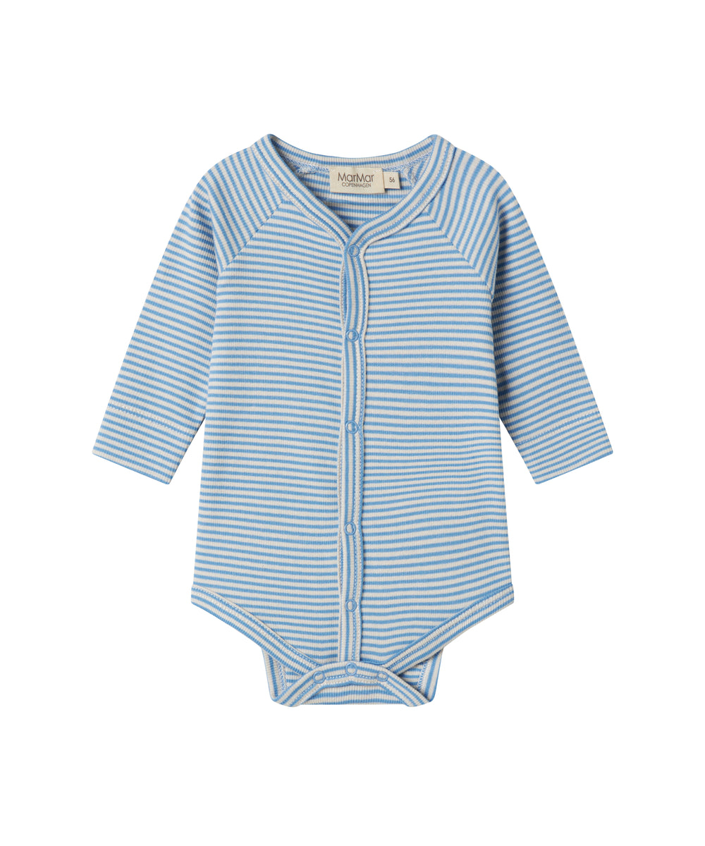 Blå langærmet body til baby med enhjørningemønster og flæsekrave