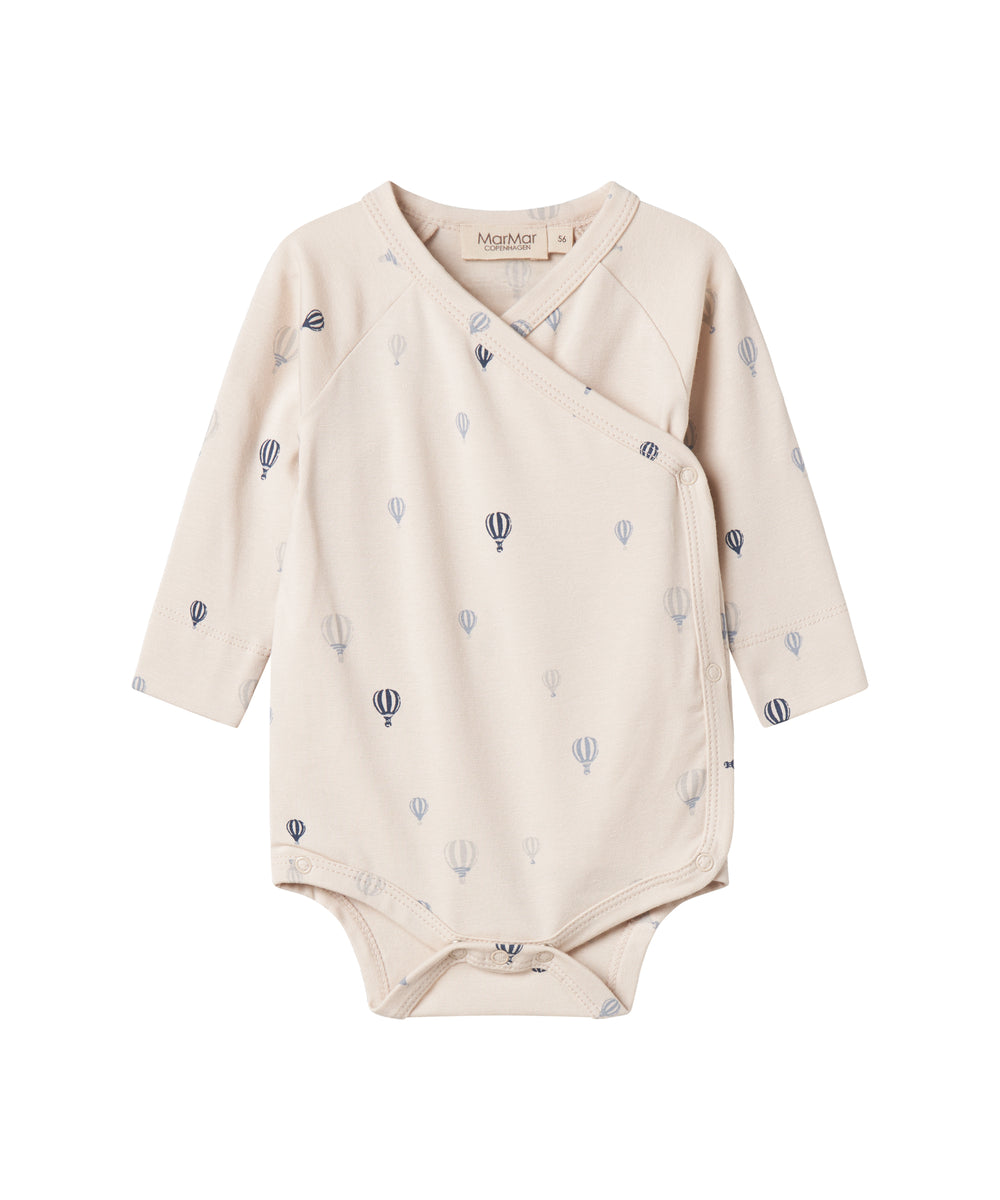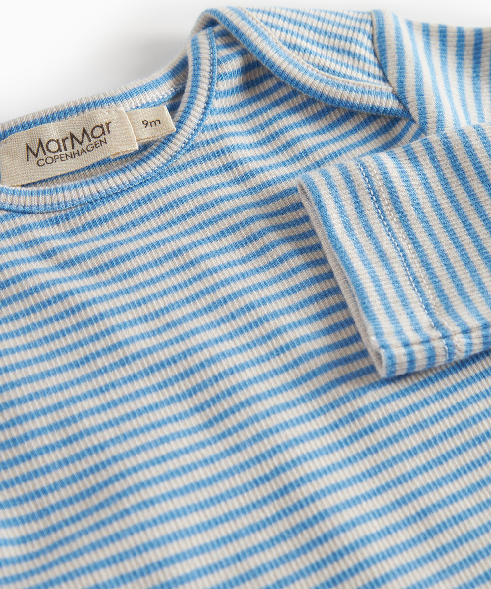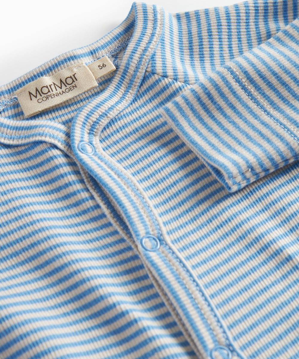 Blå langærmet body til baby med enhjørningemønster og flæsekrave