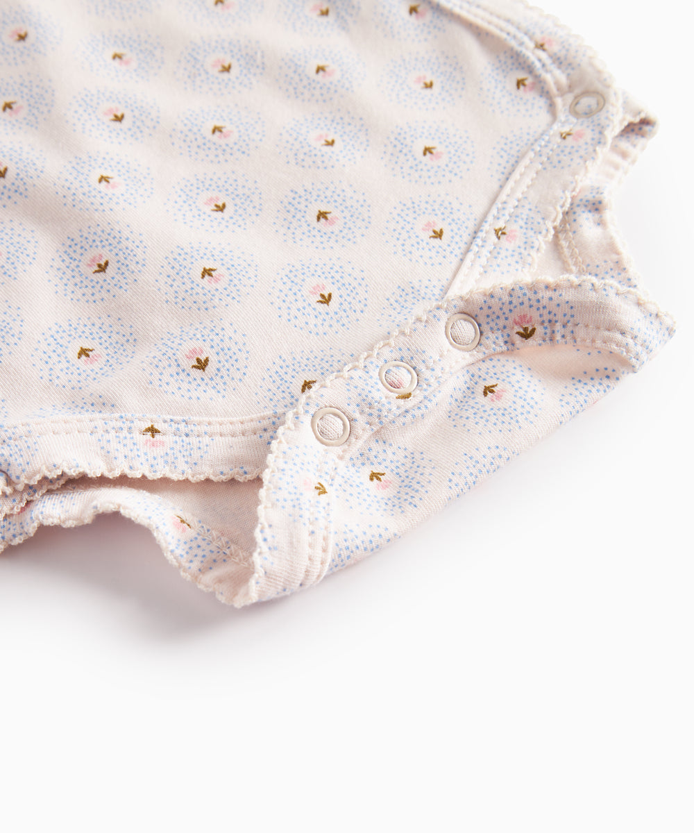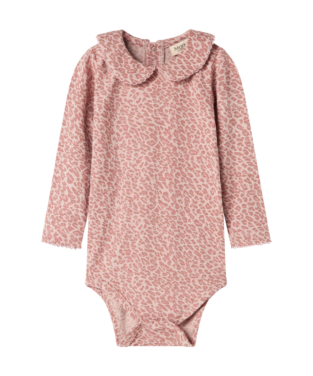 Støvet rosa ribstrikket babybody med flæsekrave og lange ærmer