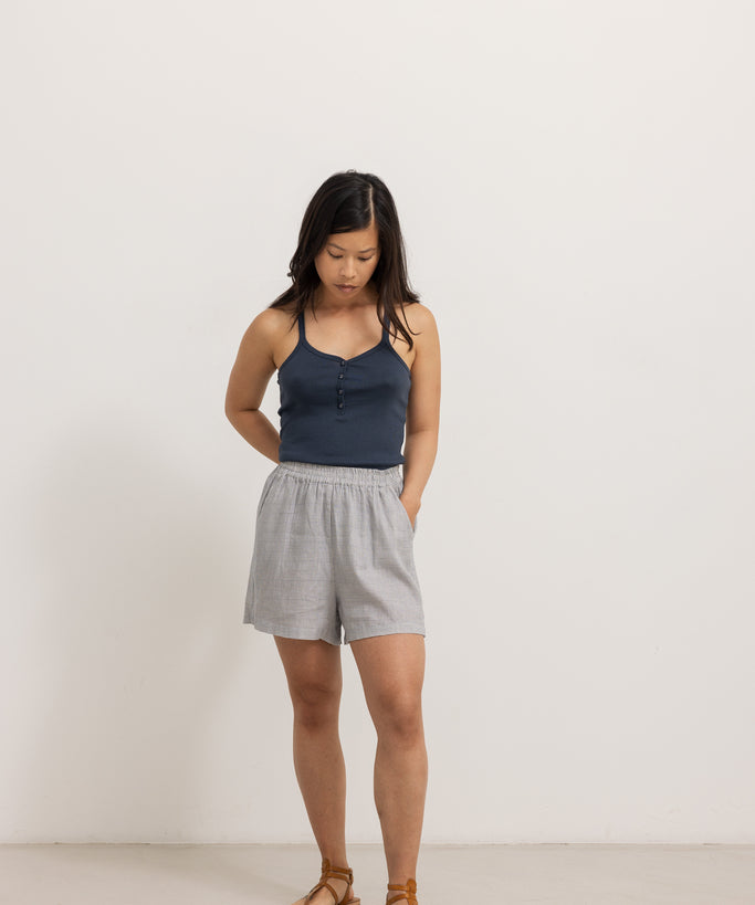 Kvinde iført grå strikvest i uld stylet med skjorte og bukser