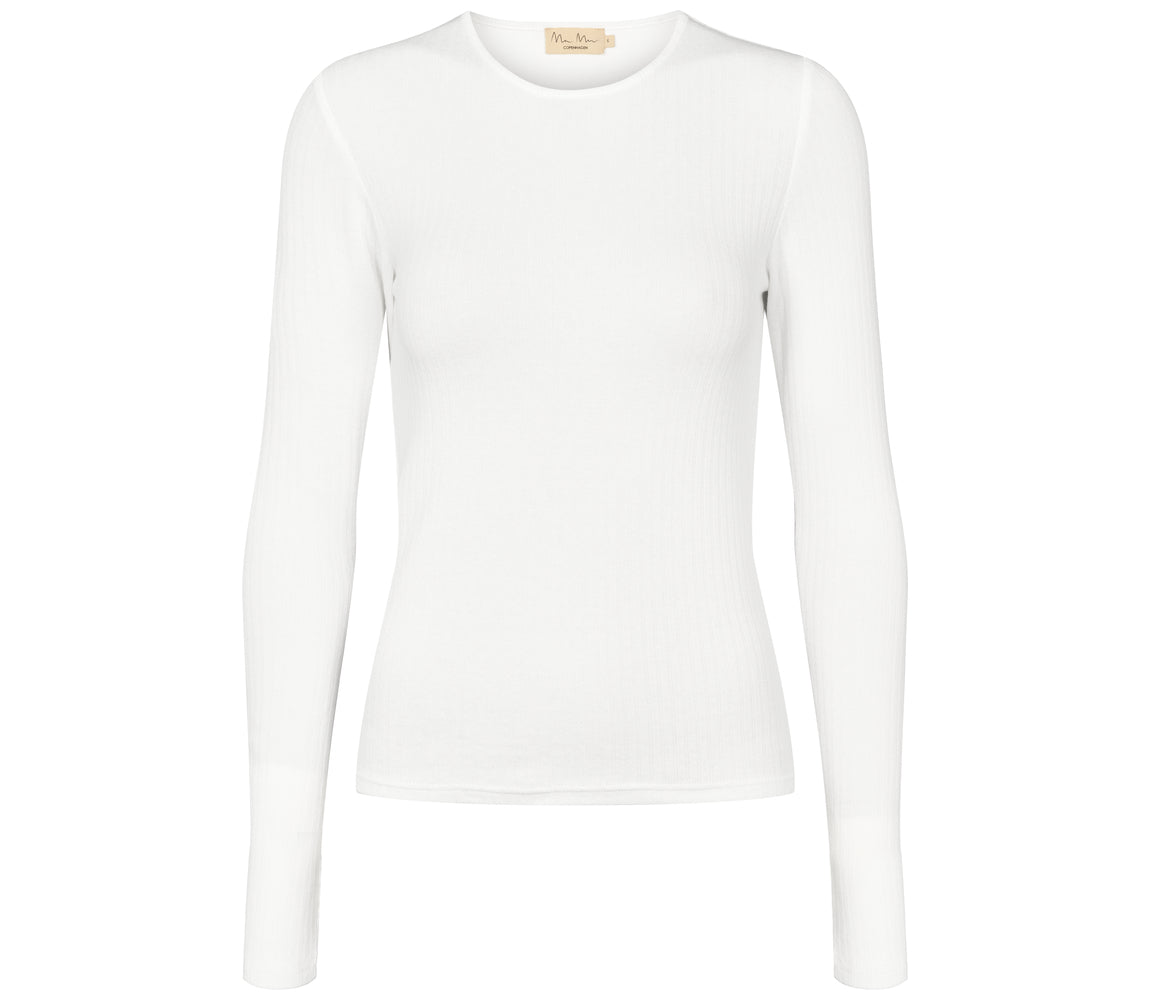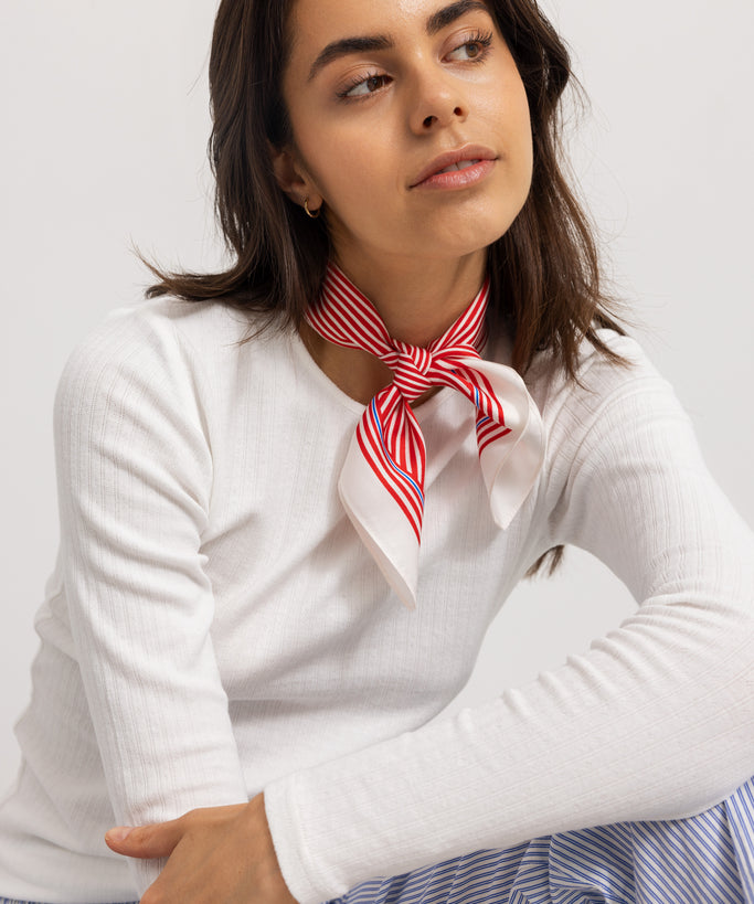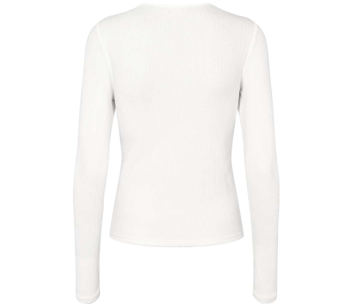 Kvinde iført cremefarvet bluse med lange ærmer og klassisk krave