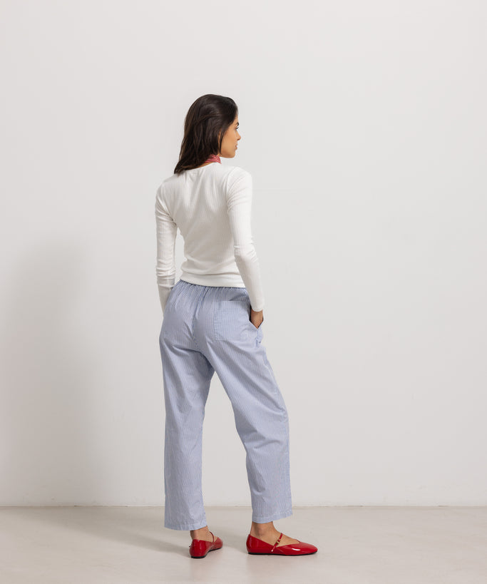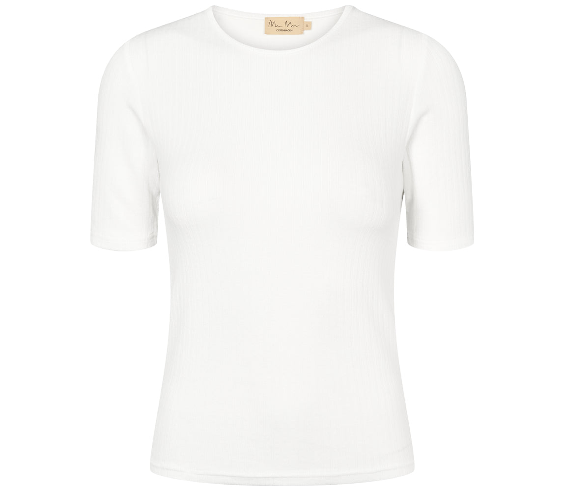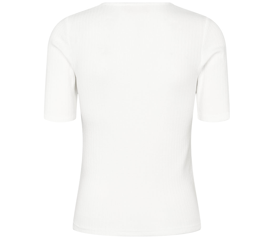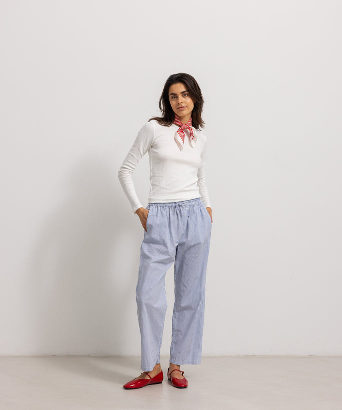 Kvinde iført cremefarvet bluse med lange ærmer og klassisk krave