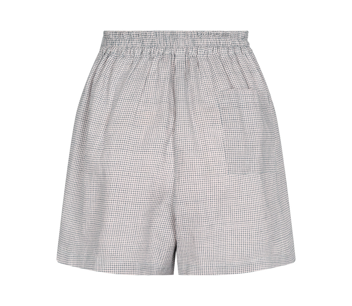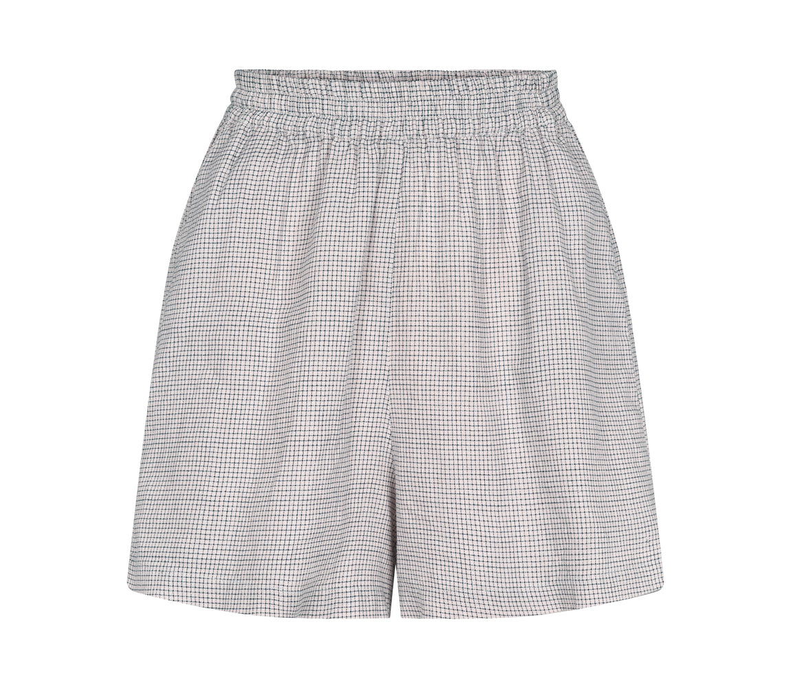 Kvinde iført brun ternet tørklæde bundet om halsen