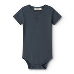 Kortærmet baby modal bodystocking med stolpe knaplukning, der bliver lukket med trykknapper mellem benene for nem bleskiftning.