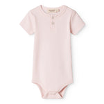 Kortærmet baby modal bodystocking med stolpe knaplukning, der bliver lukket med trykknapper mellem benene for nem bleskiftning.