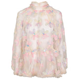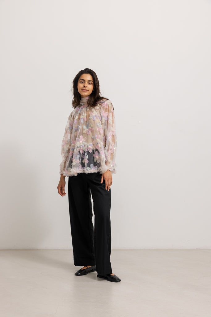 Bluse til kvinder i et let og gennemsigtigt tyl materiale, dekoreret med store blomsterapplikationer i smukke pastelnuancer. Hver blomst er udsmykket med en skinnende paillet i midten, som giver blusen et elegant og festligt udtryk. Blusen har en høj hals med en let rynket kant, som tilfører en sofistikeret stil. Den løse pasform skaber en let og luftig effekt, mens kanten forneden afsluttes med en fin tyl flæsekant for ekstra elegance. Ærmerne er lange og gennemsigtige, hvilket bidrager til det feminine og romantiske design. Blusen er perfekt til særlige lejligheder eller festlige begivenheder og kan nemt styles med en nederdel eller bukser for at fuldende looket