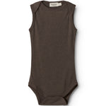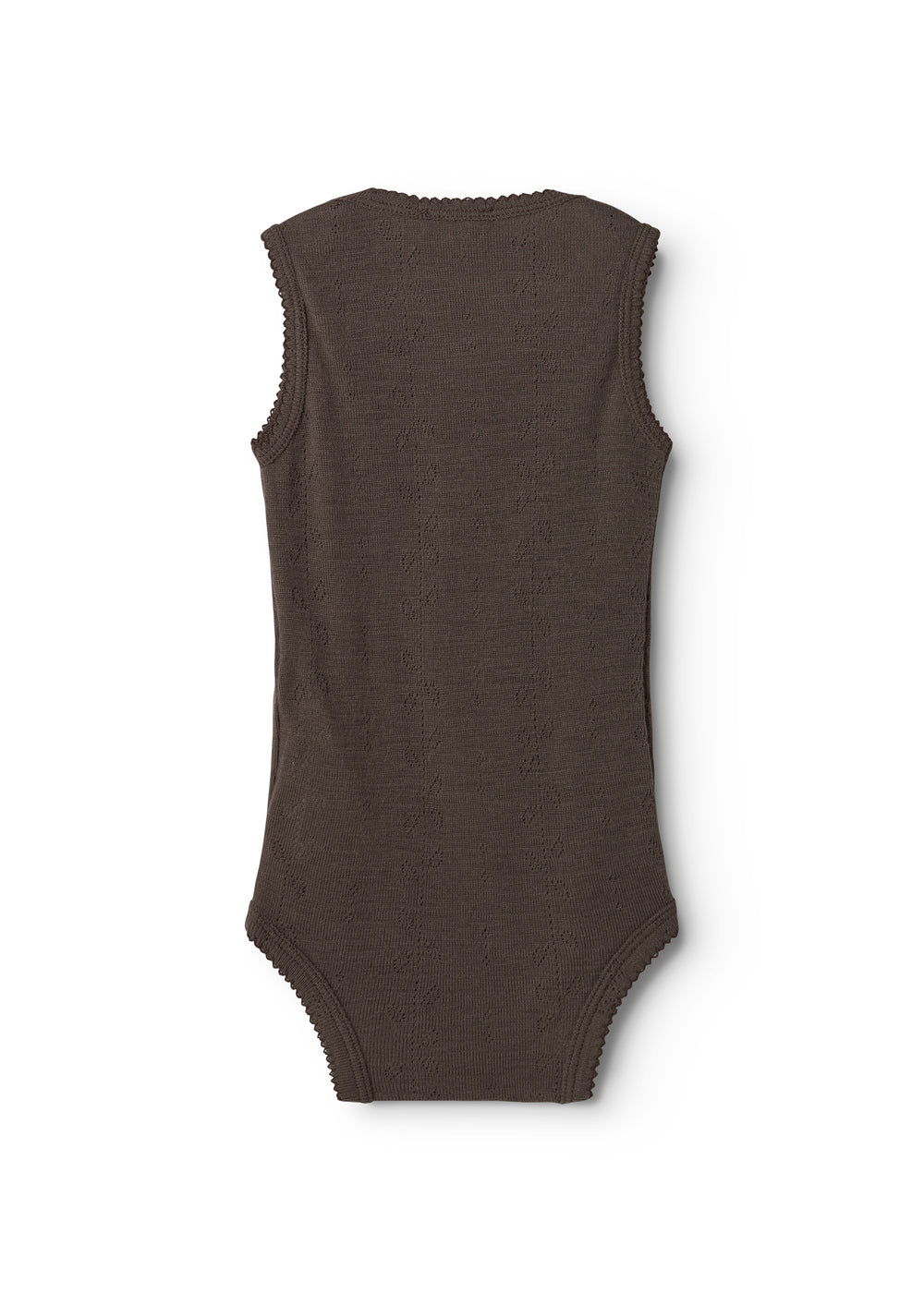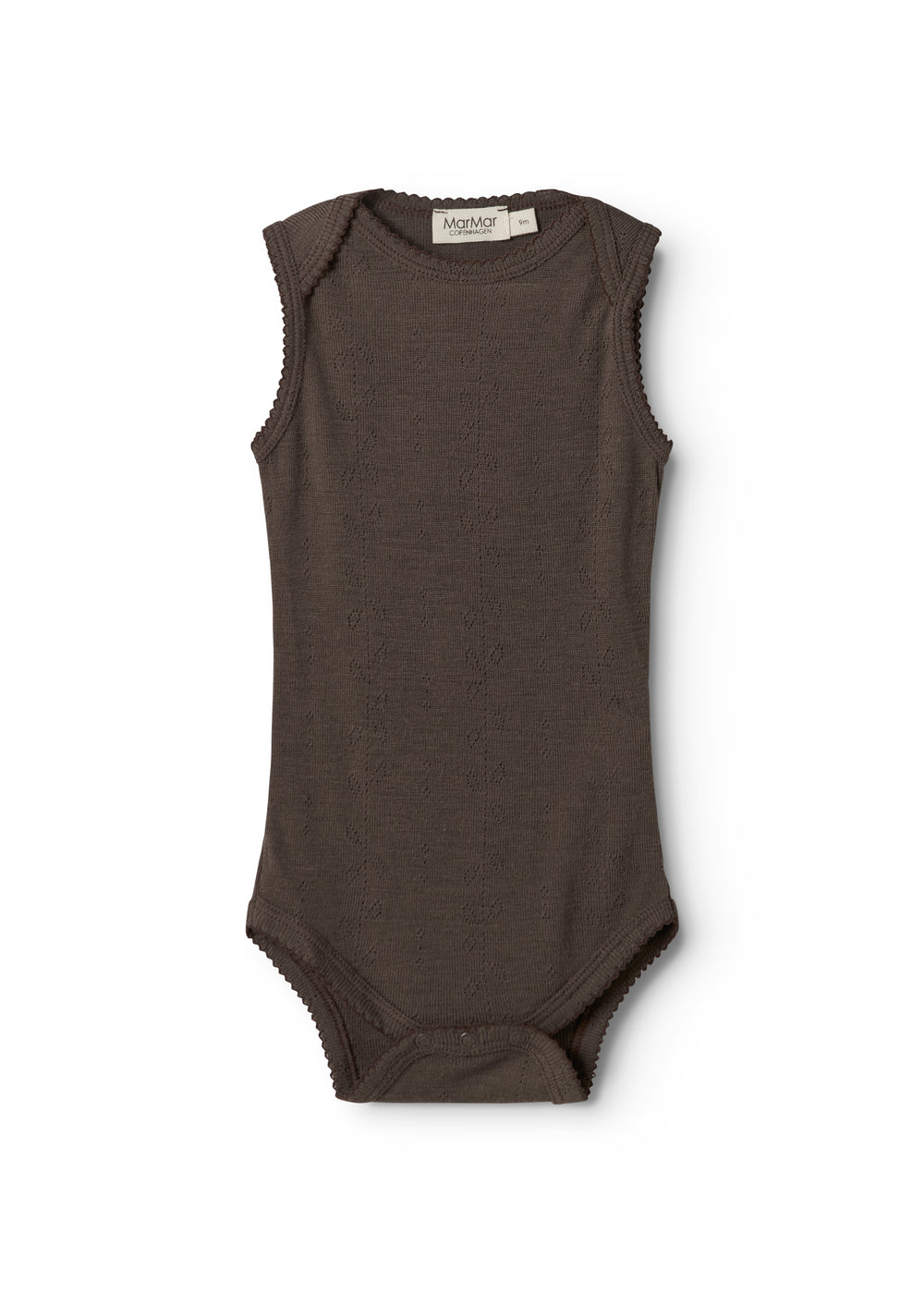 Bodystocking uden ærmer, med smart halsåbning uden knapper som let kan trækkes nedover kroppen. Lukkes med trykknapper på mellem benene for nem bleskiftning.