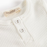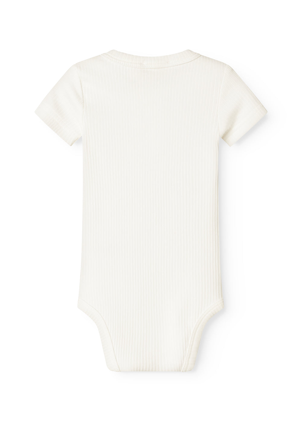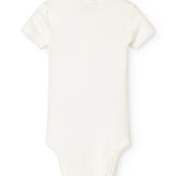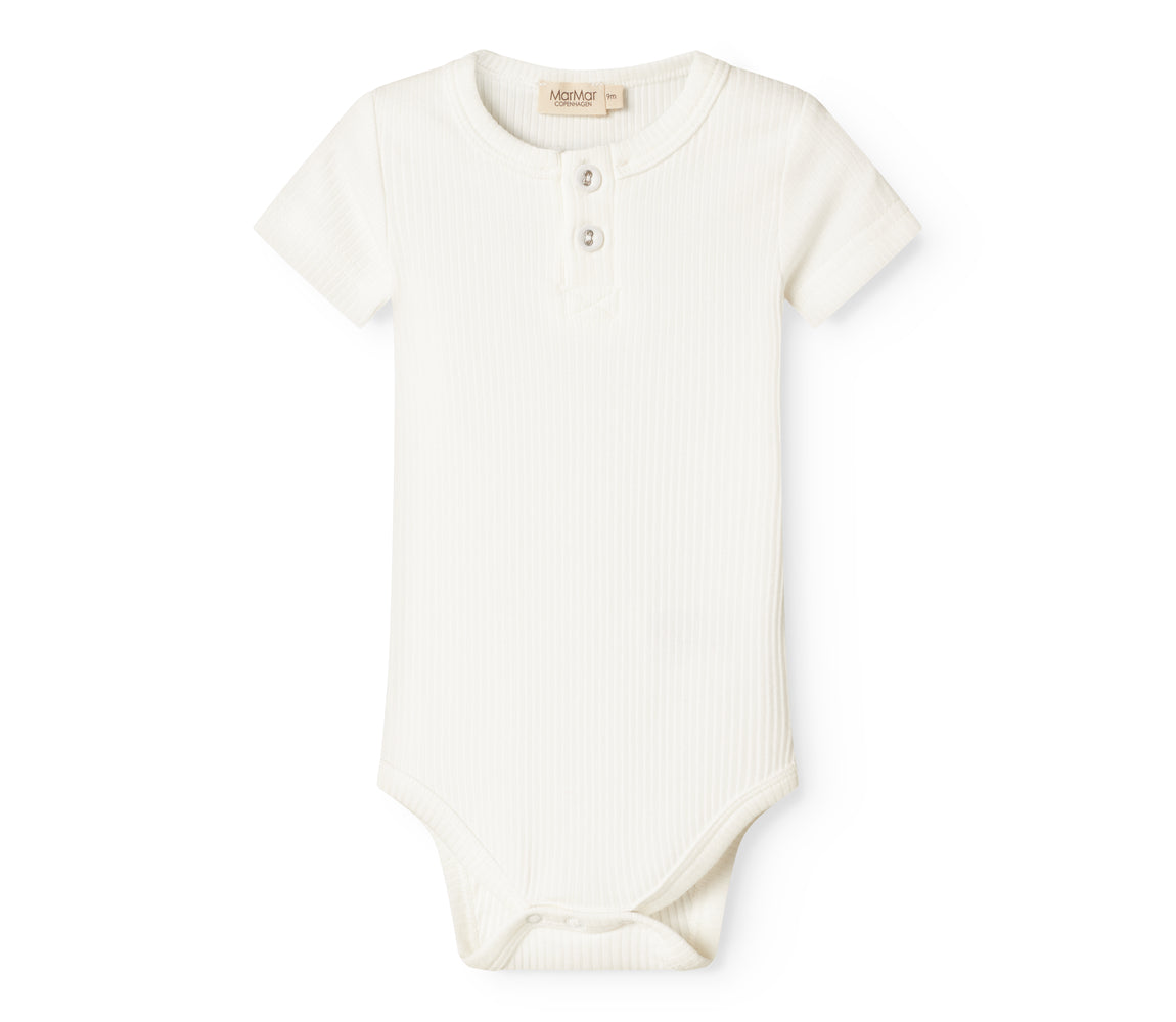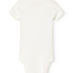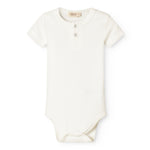 Kortærmet baby modal bodystocking med stolpe knaplukning, der bliver lukket med trykknapper mellem benene for nem bleskiftning.