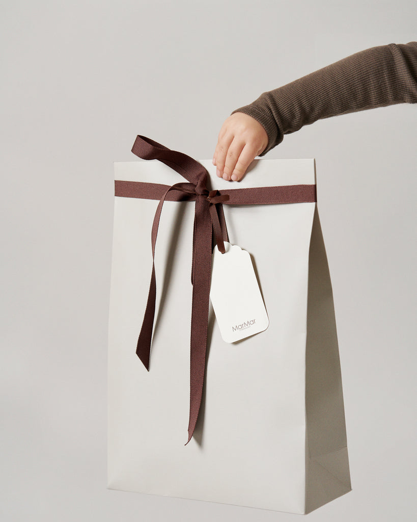 Fin gavepose lavet af papir i MarMar Copenhagens signatur farve med tilhørende stofbånd samt til og fra manillamærker. Gaveposen kommer usamlet. Mål: 29x12x42 cm