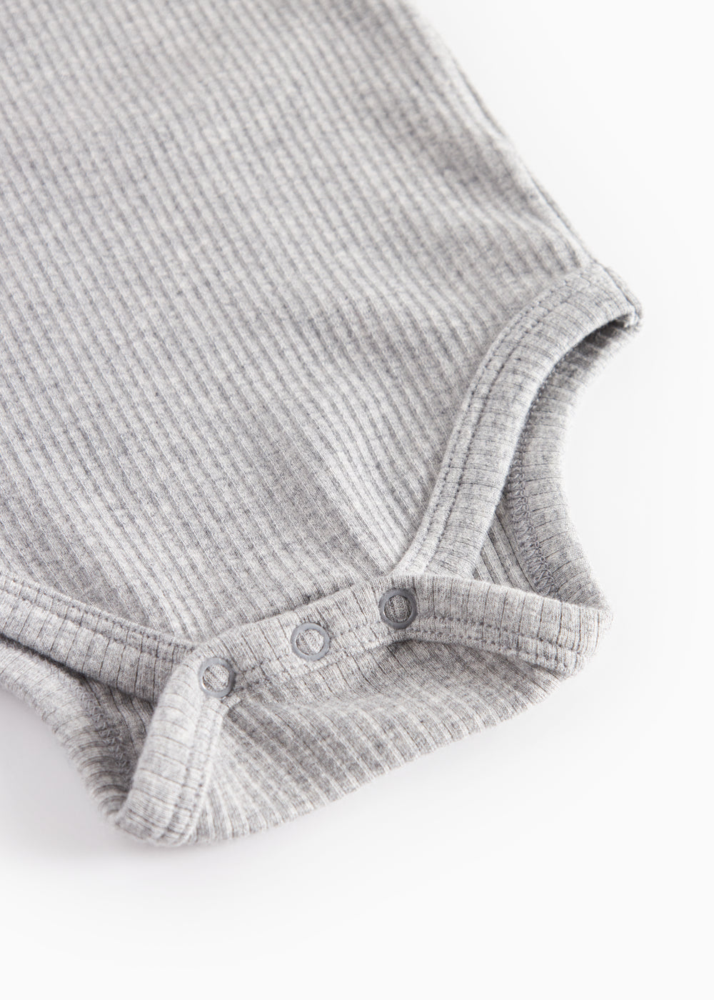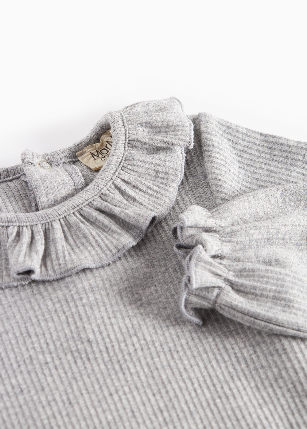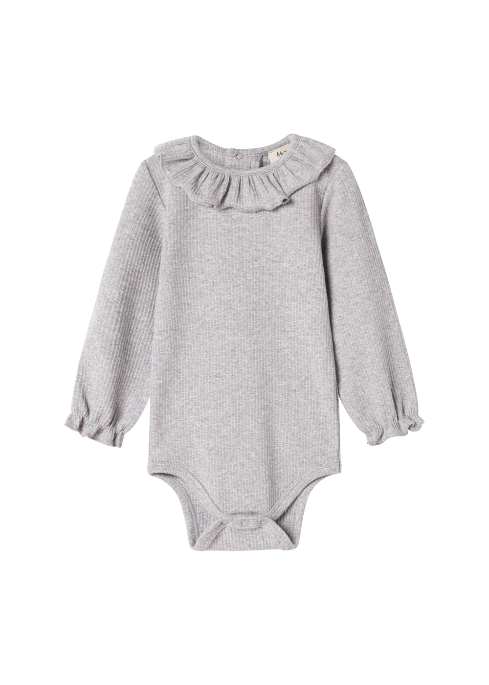 Langærmet baby bodystocking med flæsekrave samt flæsekant på ærmer. Bodystockingen bliver lukket bagpå med trykknapper samt mellem benene for nem bleskiftning. Bodystockingen er både ribstrikket, blød, holder form og farve og har elastan i sig som gør den strækbar og behagelig at have på.