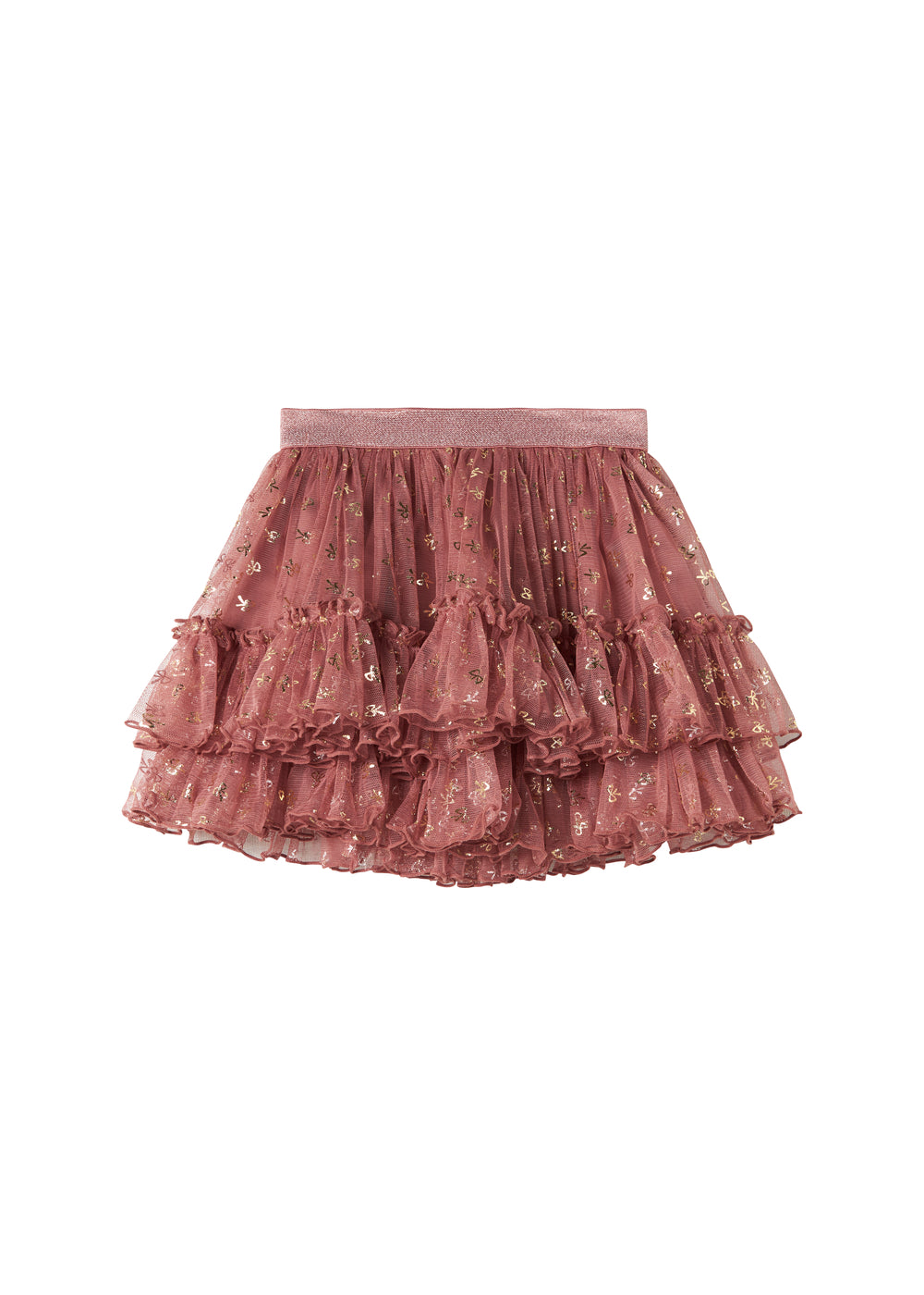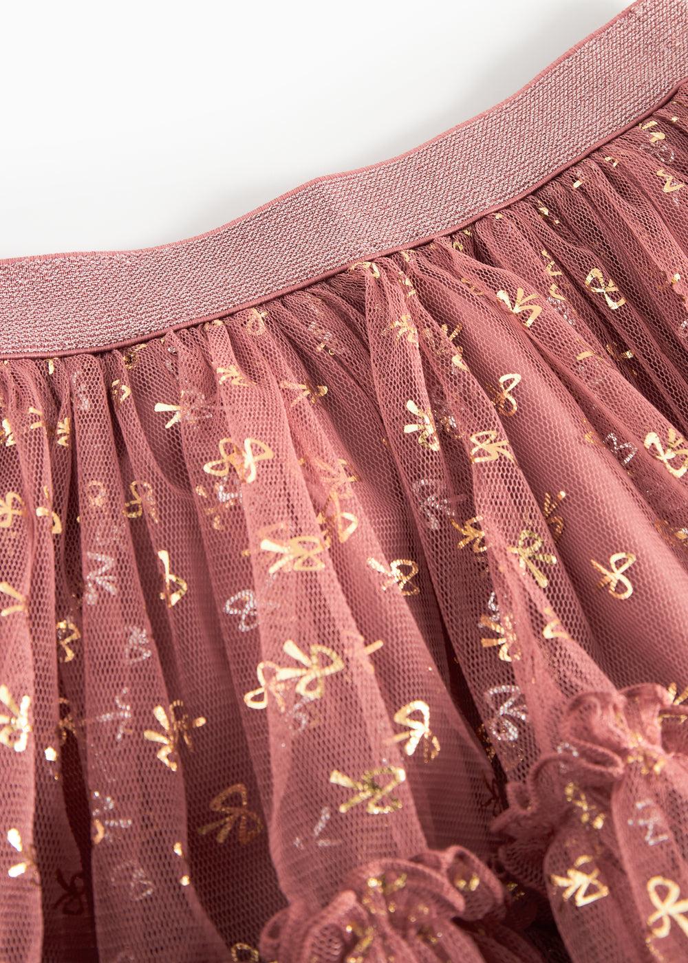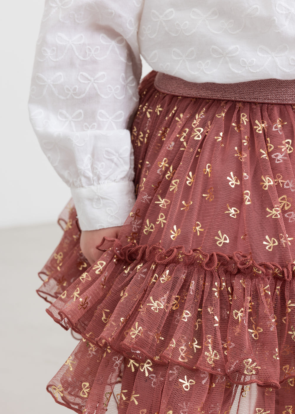 Ballerina skørt pyntet med guld sløjfer, elastik i taljen og mange lag tyl for volumen. Nederdelens længde går til over knæet.