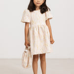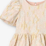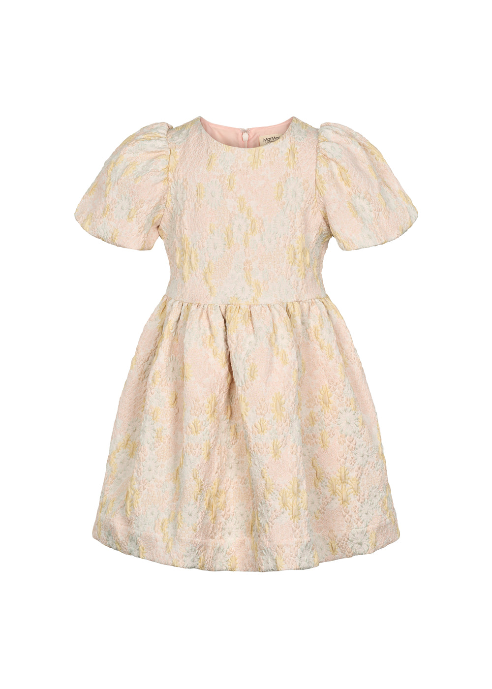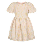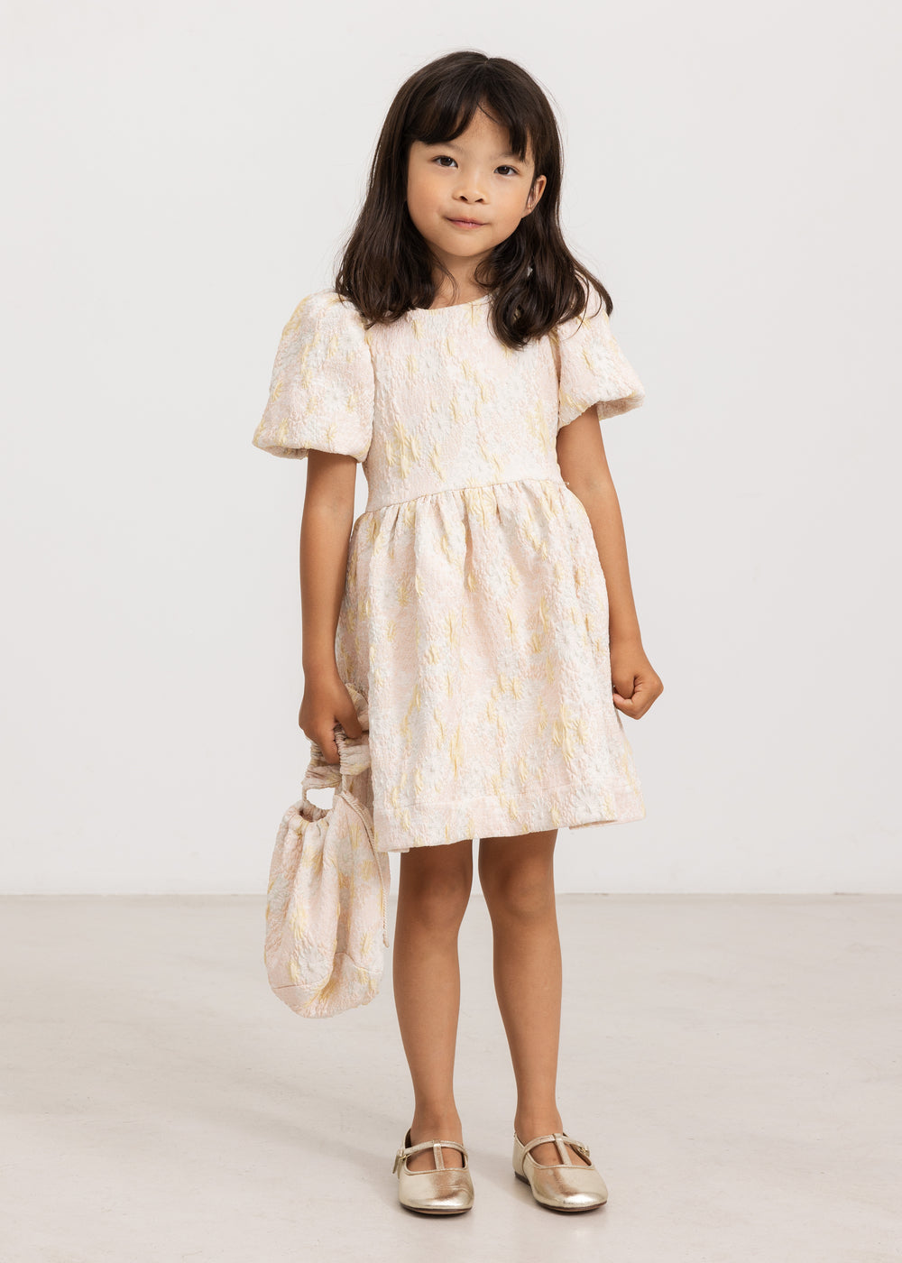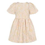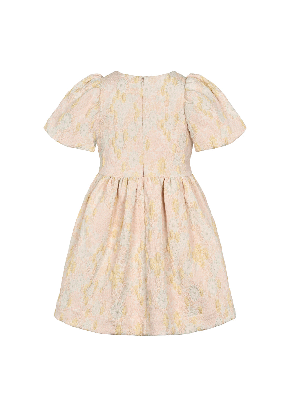 Figursyet elegant kjole til børn i en smuk, tekstureret jacquard-kvalitet i bløde pastelfarver med fine blomsterdetaljer. Kjolen har korte puffærmer, en let rynket talje og en luftig A-form, der giver et eventyrligt udtryk. Stoffets struktur tilfører kjolen et eksklusivt look, perfekt til både særlige anledninger og finere hverdagsbrug. Kjolen lukkes med lynlås bagpå. Kjolens længde går til over knæet
