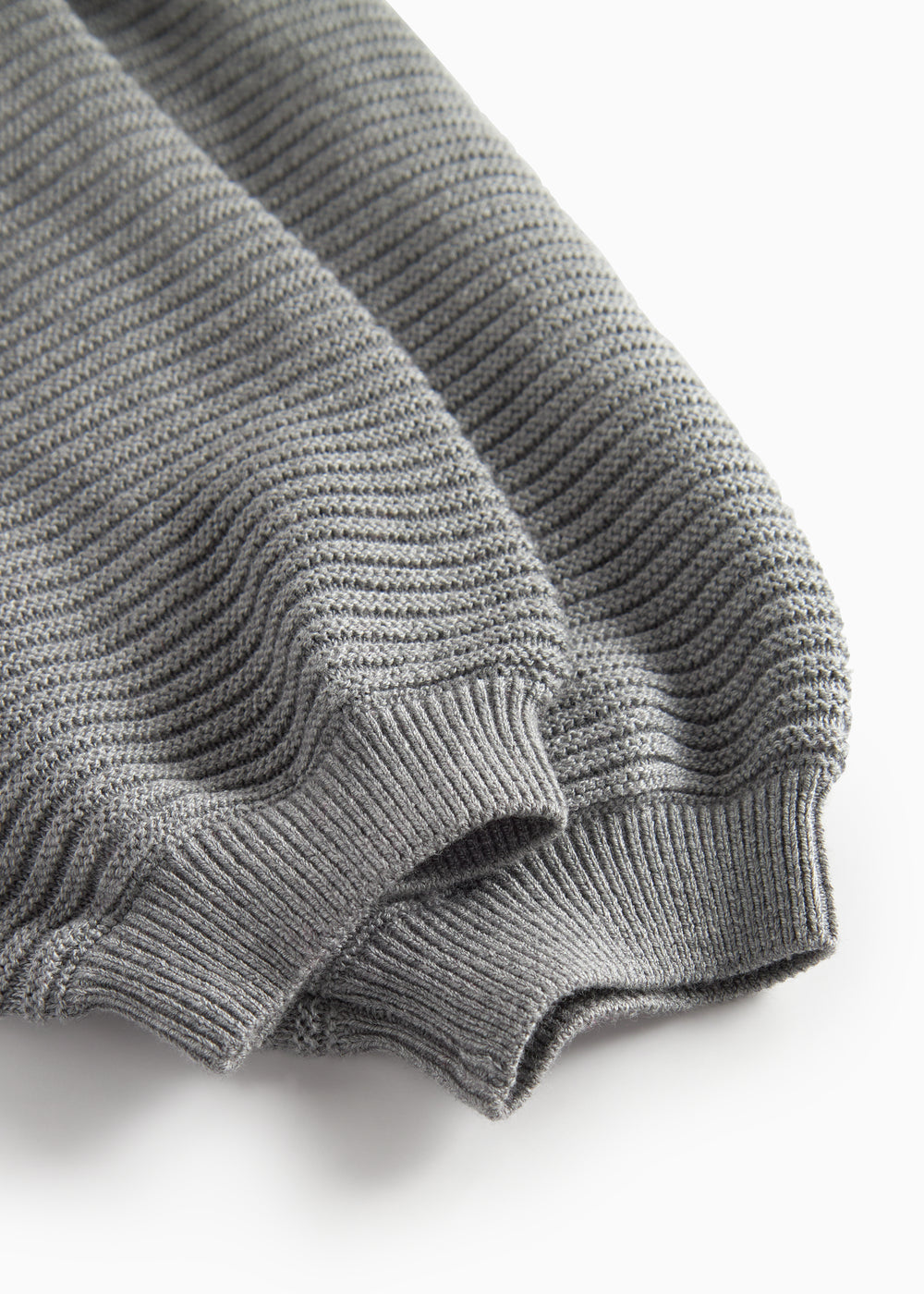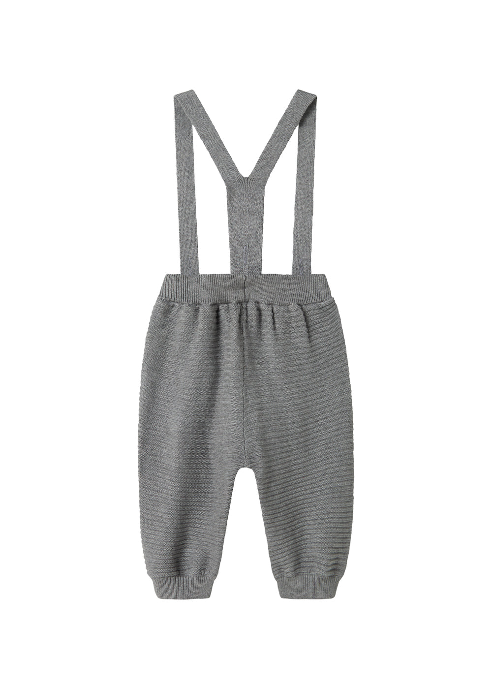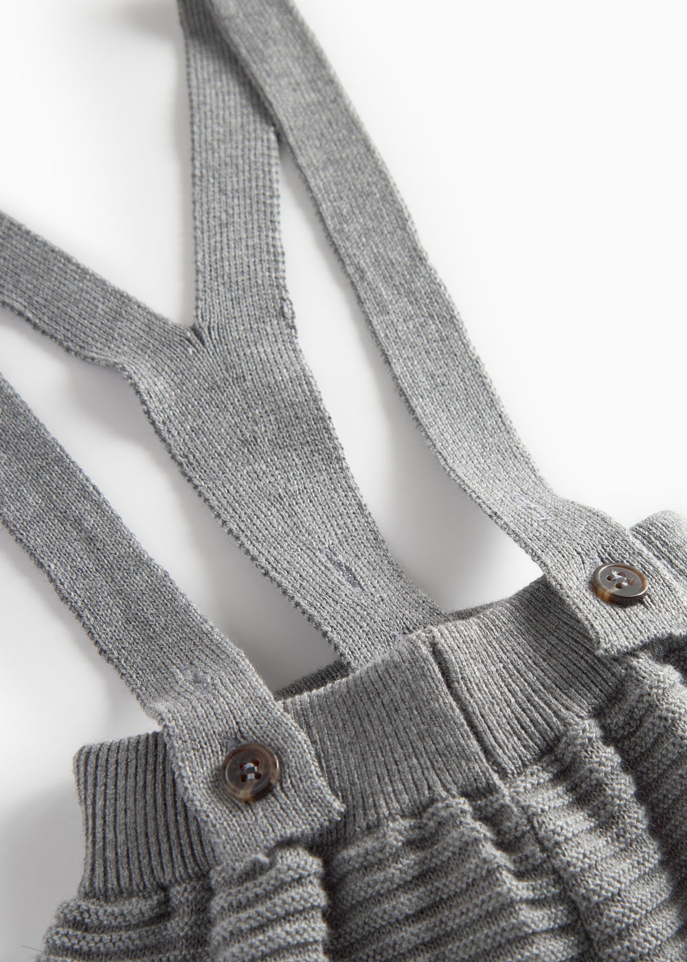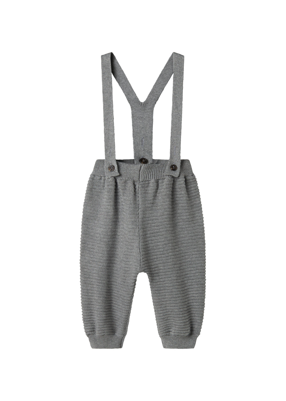 Løstsiddende strik bukser til baby med seler der har to knapluknings muligheder. Bukserne er bløde og behagelige at have på.