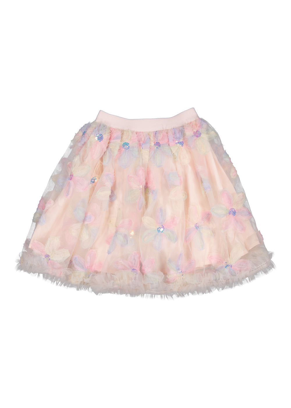 Nederdel i et let og transparent tyl materiale, dekoreret med store blomsterapplikationer i pastelnuancer. Hver blomst er udsmykket med en skinnende paillet i midten, som tilføjer et festligt og legende præg. Nederdelen har en elastisk talje, der giver en behagelig pasform, og kanten afsluttes med en fin tyl flæsekant, der tilføjer elegance og volumen. Et perfekt valg til særlige lejligheder som fødselsdage eller festlige begivenheder. Nederdelens længde går til over knæet