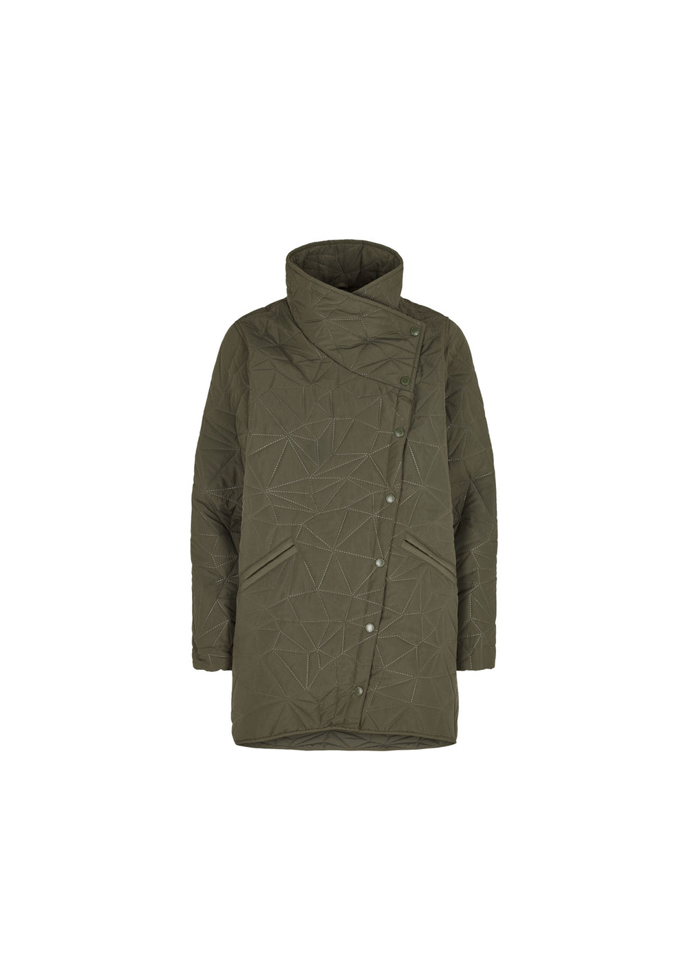 Lang og praktisk termojakke med lommer foran. Jakken har en asymetrisk trykknaplukning og stor krave