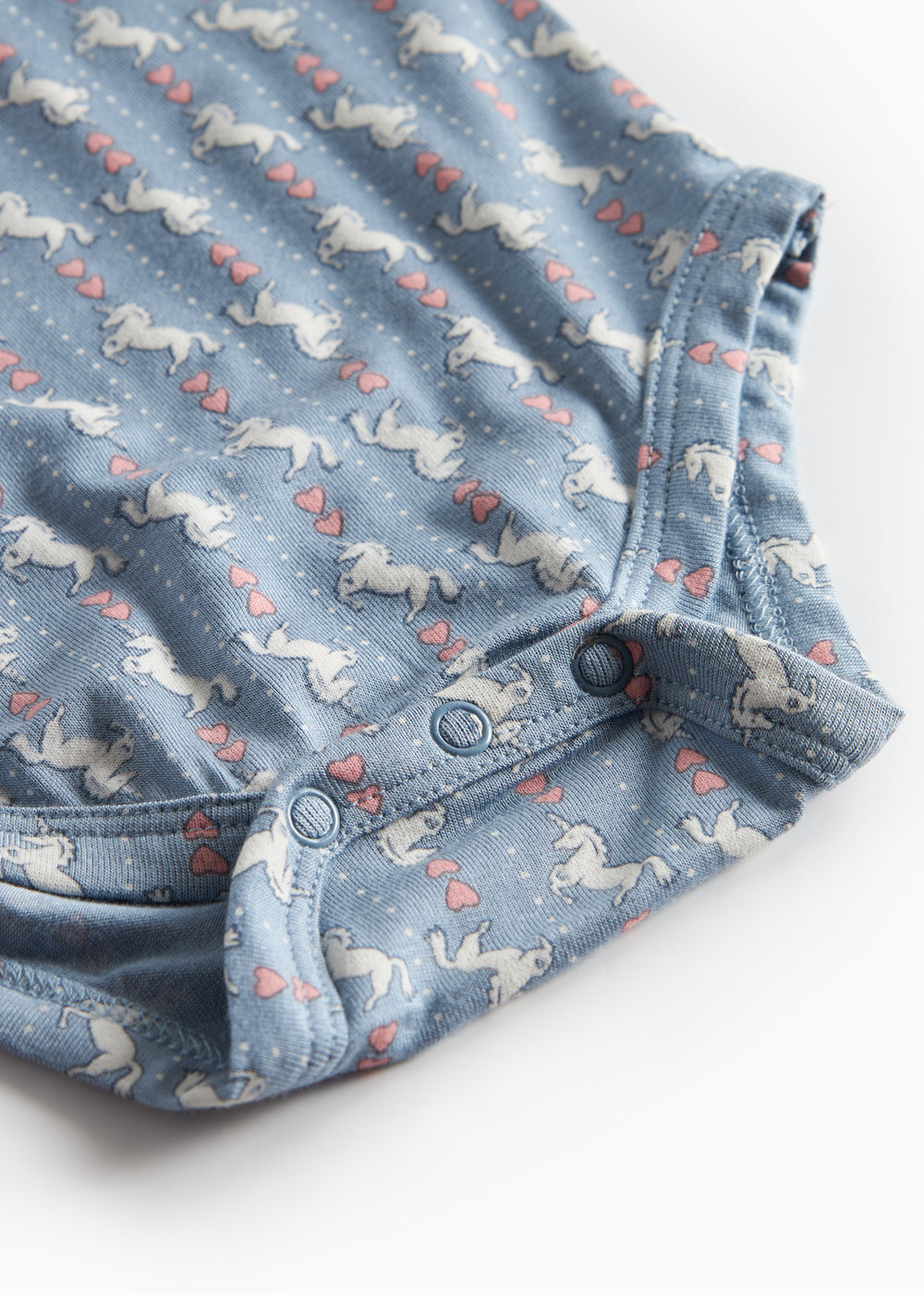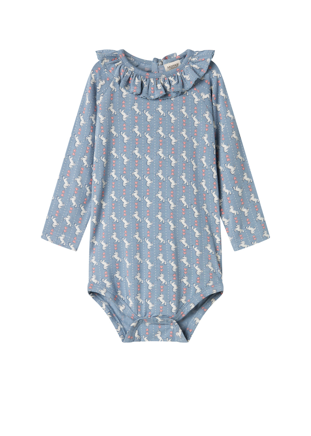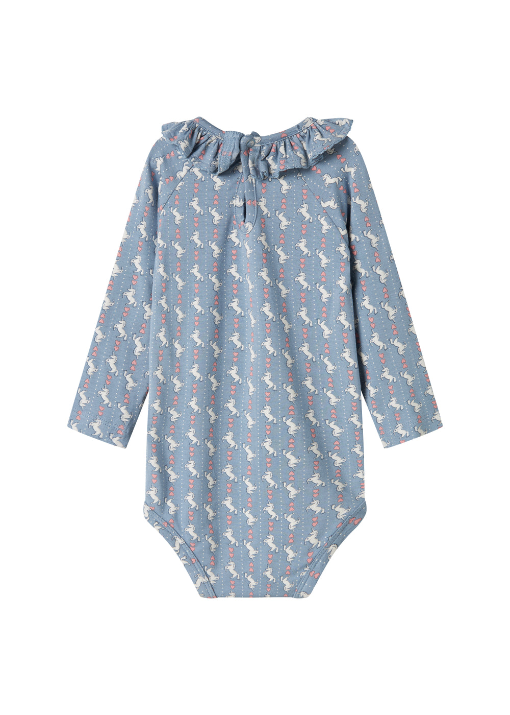 Langærmet baby bodystocking med sødt enhjørning print og flæsekrave med picotkanter. Bodystockingen bliver lukket med trykknapper på ryggen samt mellem benene for nem bleskiftning.