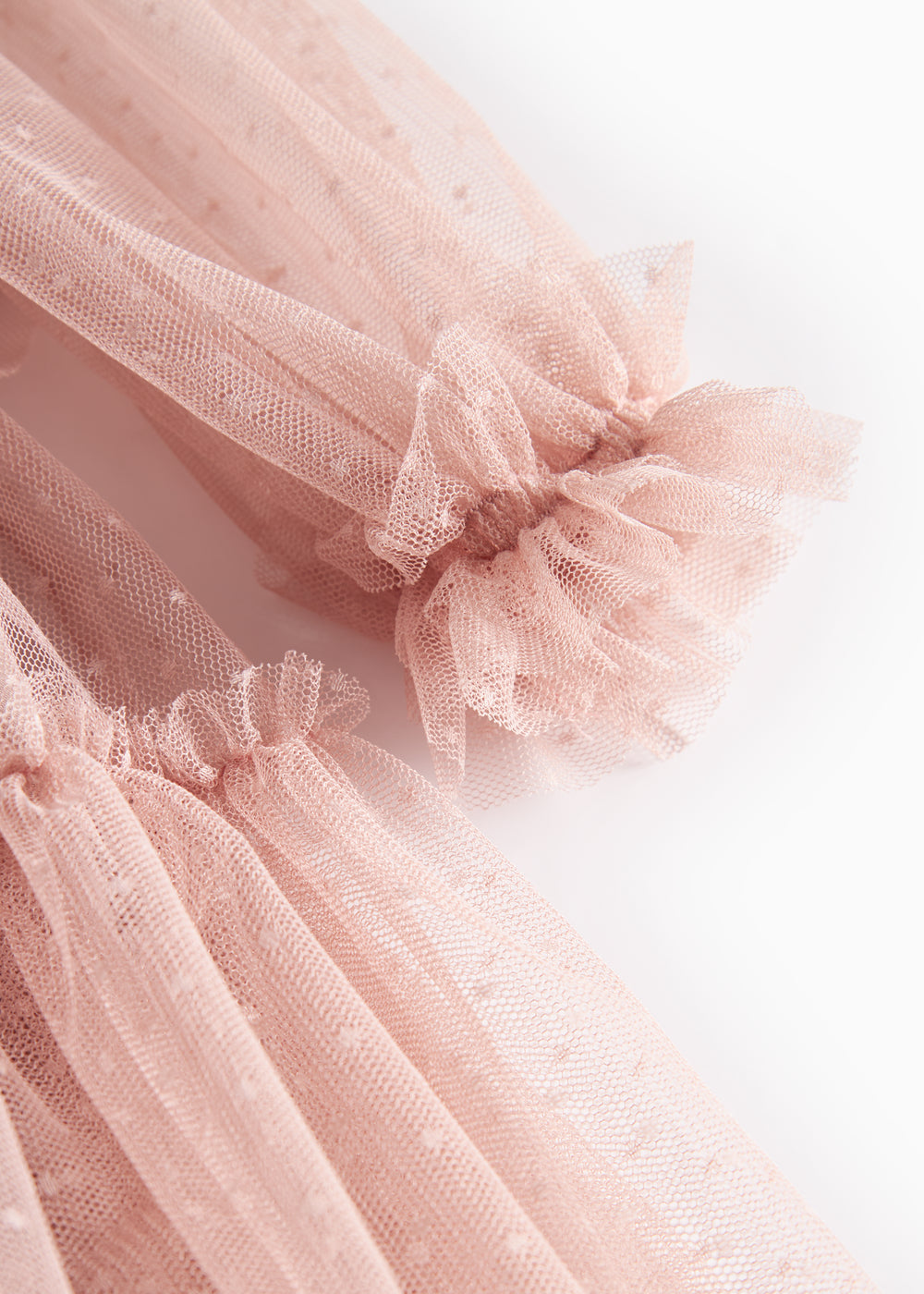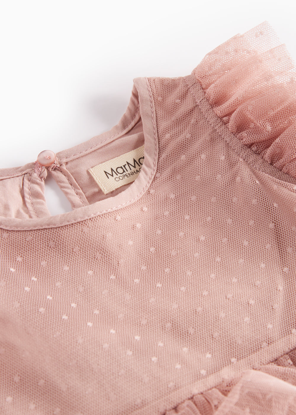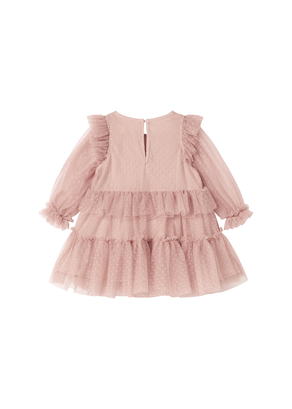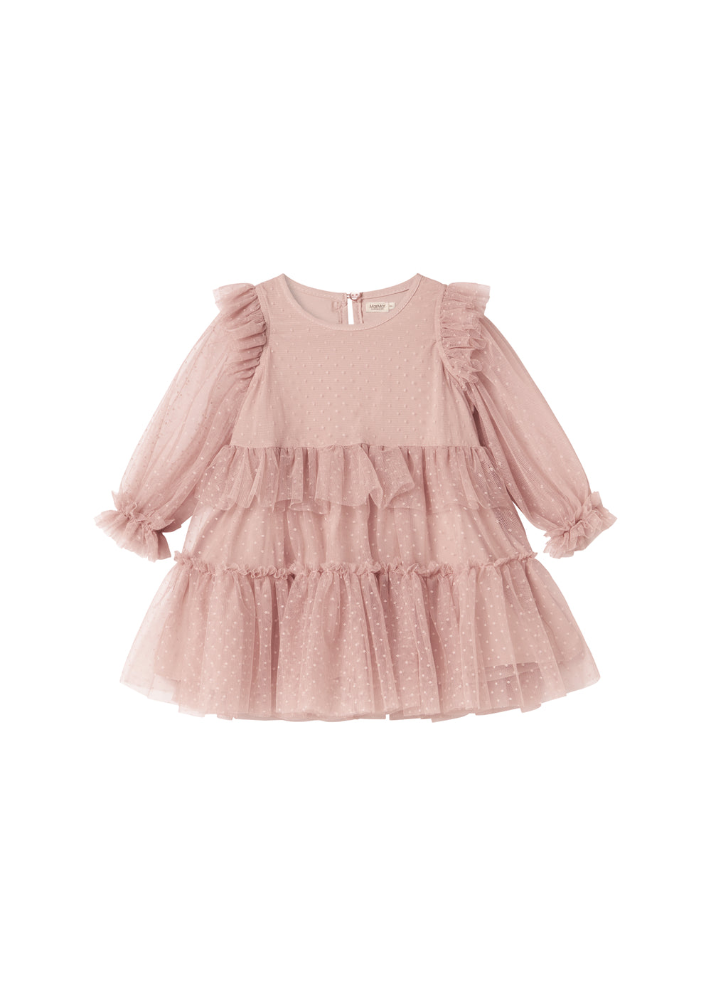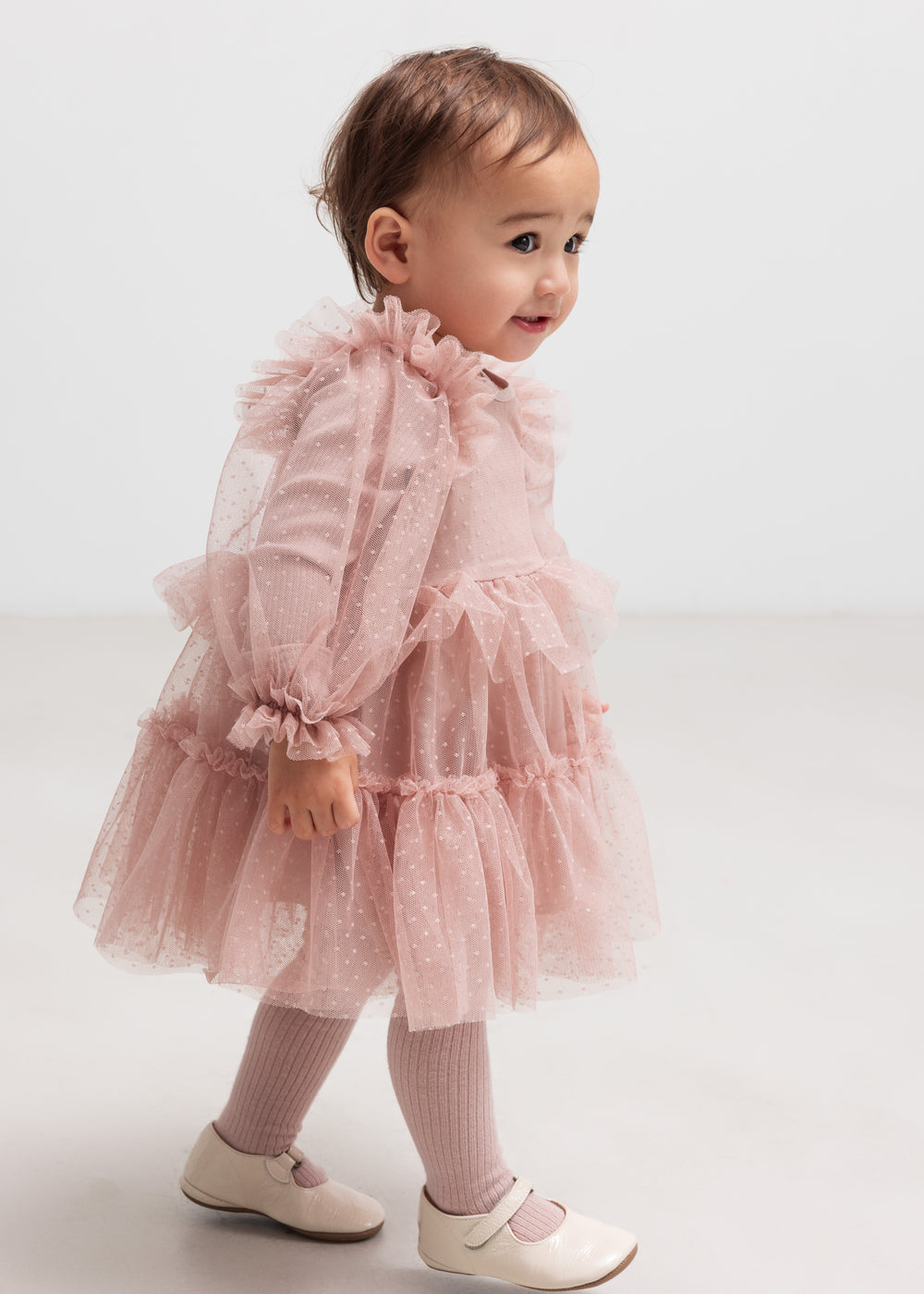 Langærmet kjole til de mindste med masser af volumen og flotte tyl flæser. Kjolen er pyntet med prikker og har knaplukning bagpå. Kjolens længde går til over knæet.