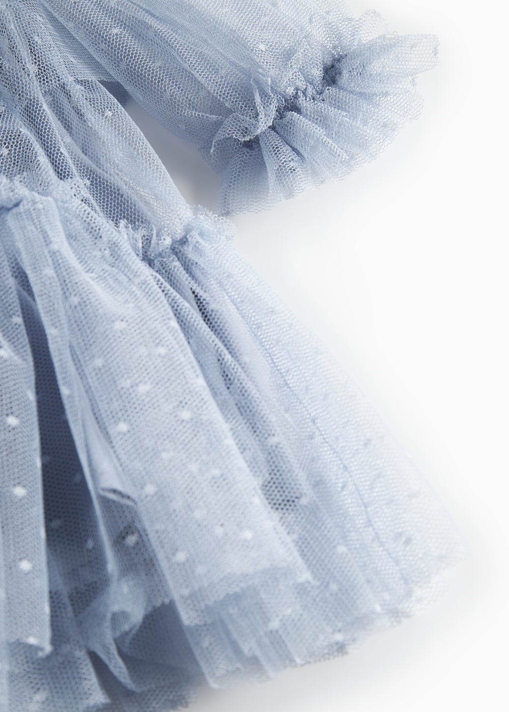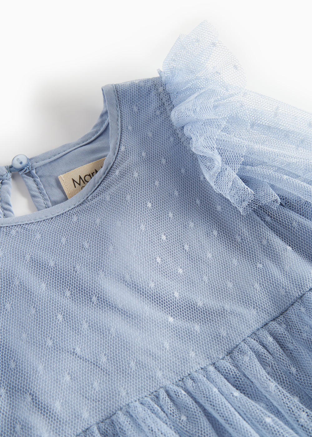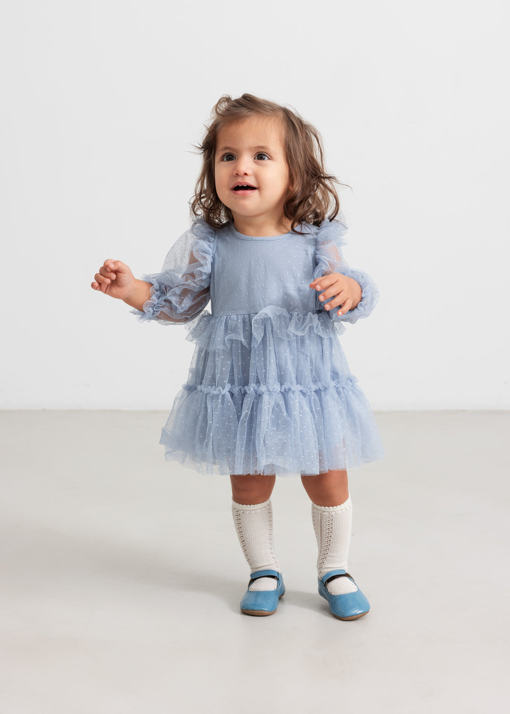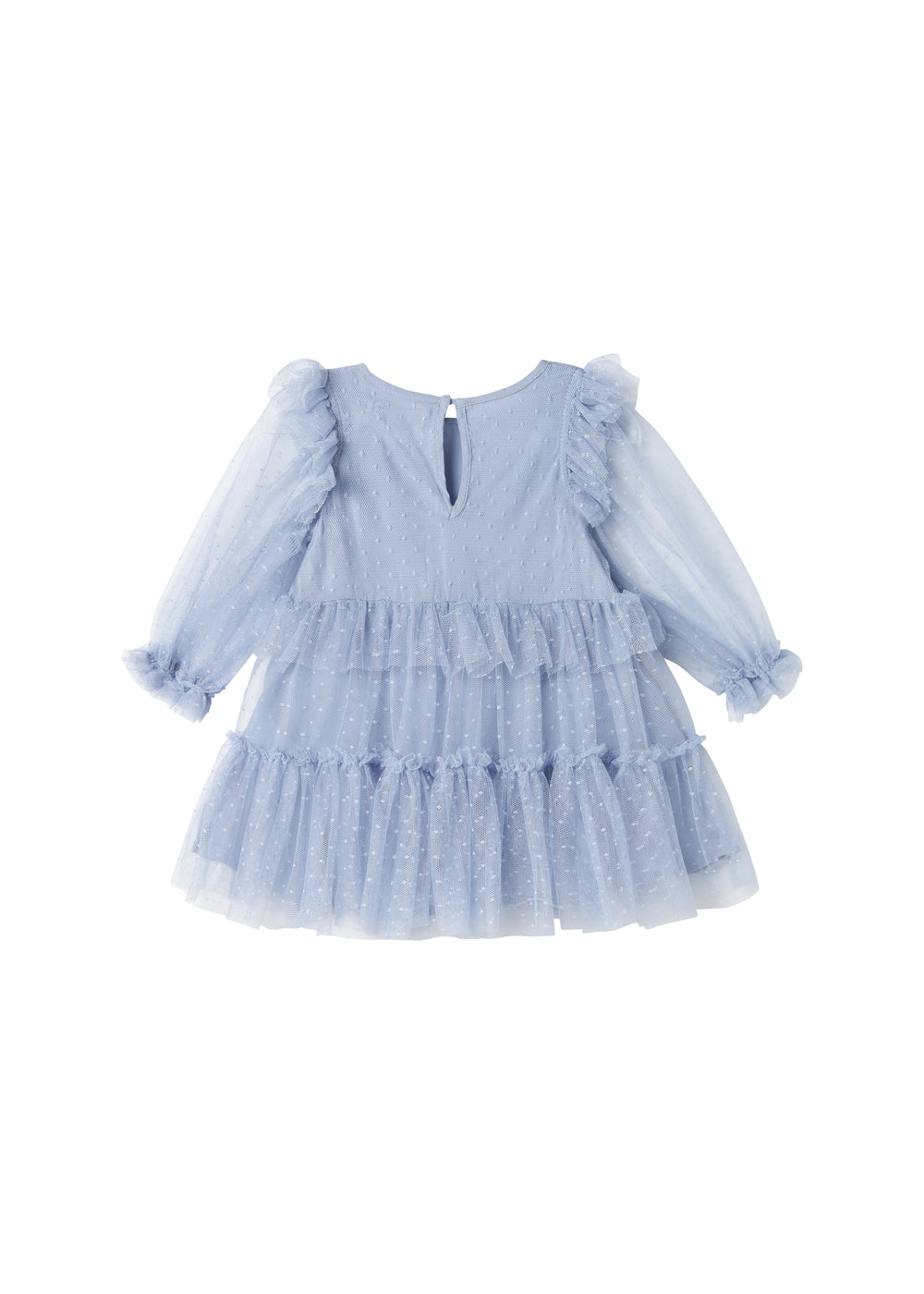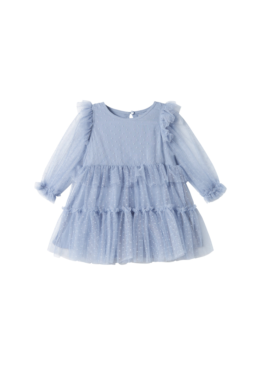 Langærmet kjole til de mindste med masser af volumen og flotte tyl flæser. Kjolen er pyntet med prikker og har knaplukning bagpå. Kjolens længde går til over knæet.