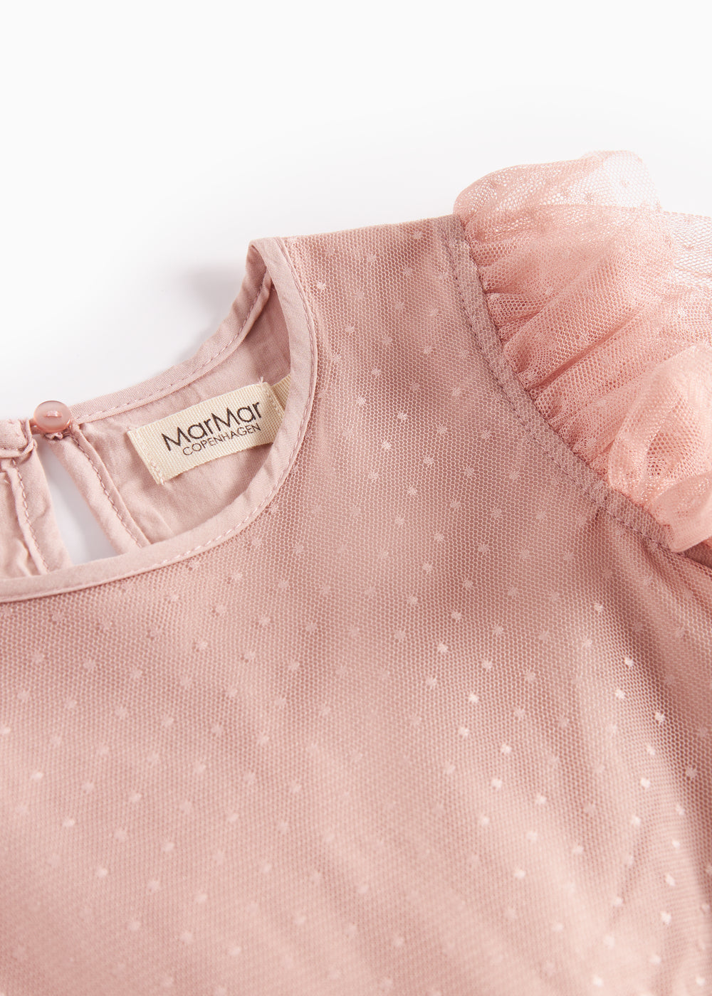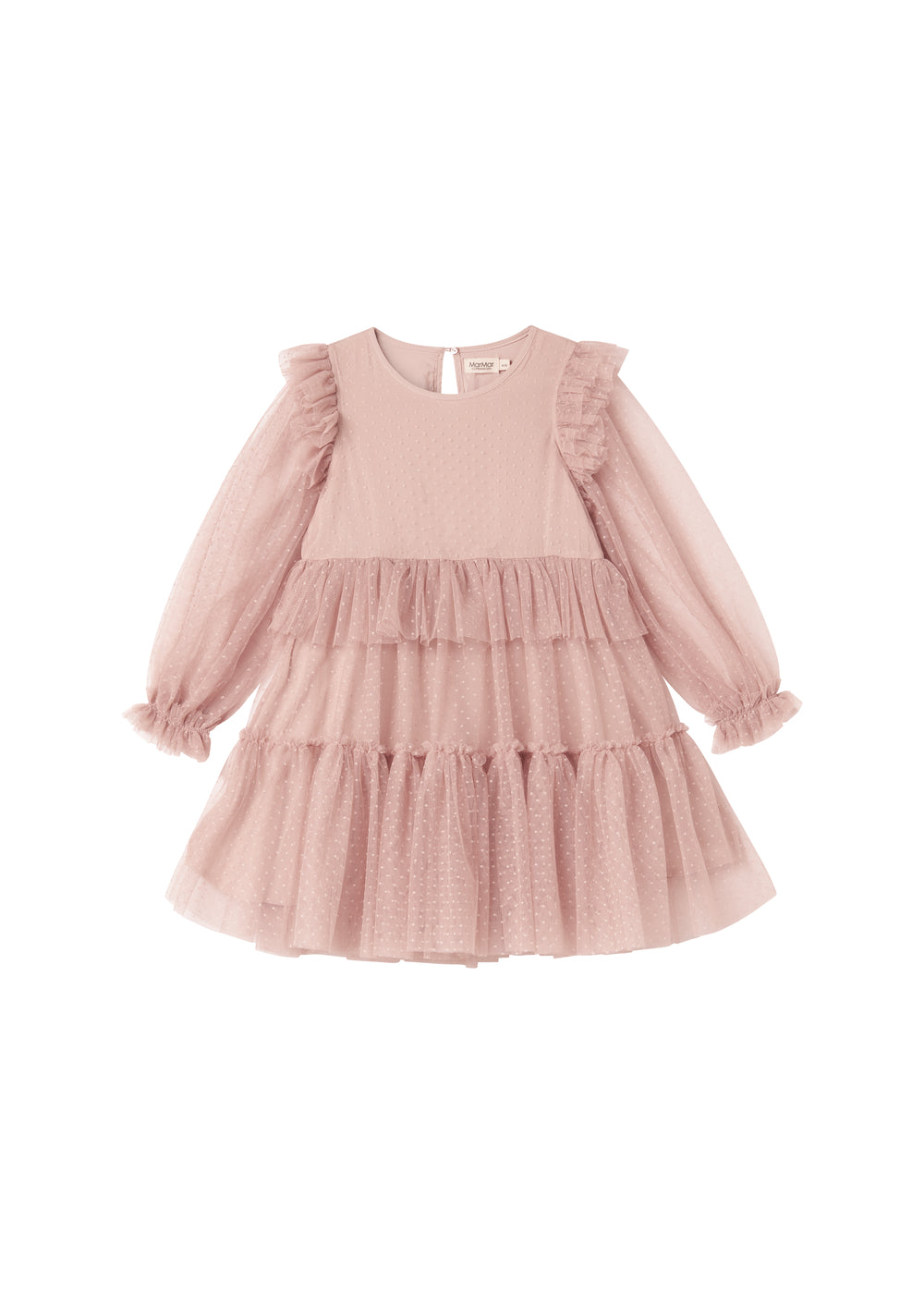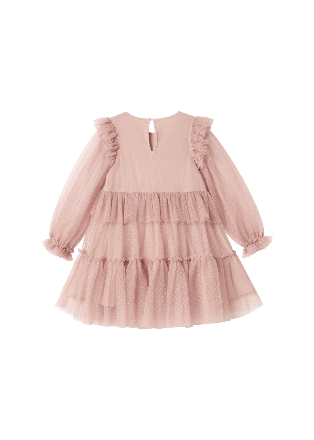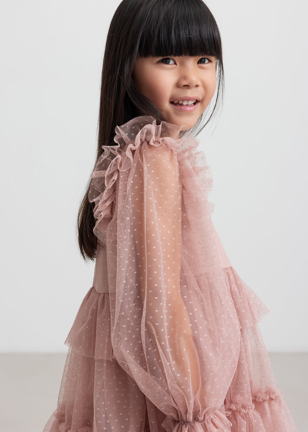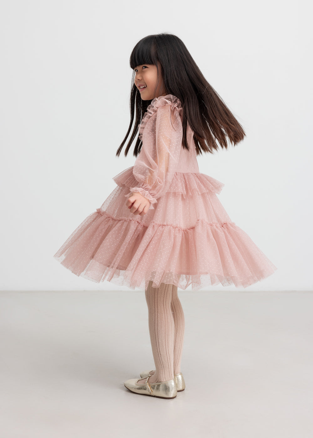 Langærmet kjole til børn med masser af volumen og flotte tyl flæser. Kjolen er pyntet med prikker og har knaplukning bagpå. Kjolens længde går til over knæet.