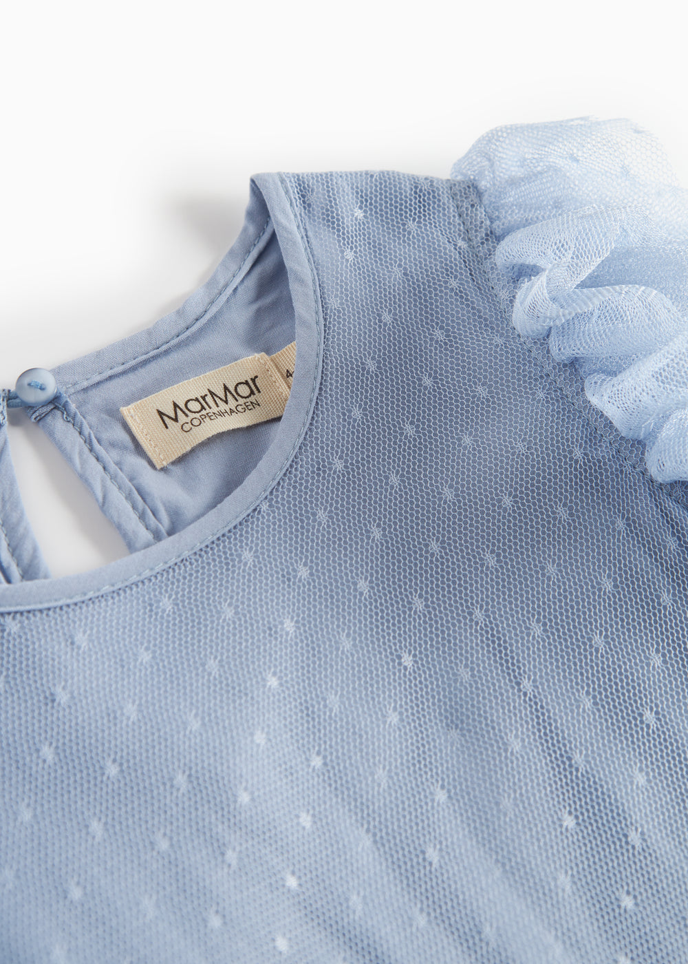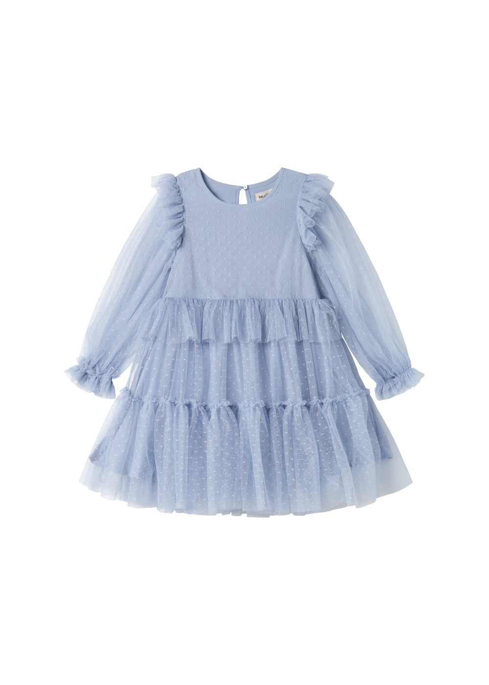 Langærmet kjole til børn med masser af volumen og flotte tyl flæser. Kjolen er pyntet med prikker og har knaplukning bagpå. Kjolens længde går til over knæet.