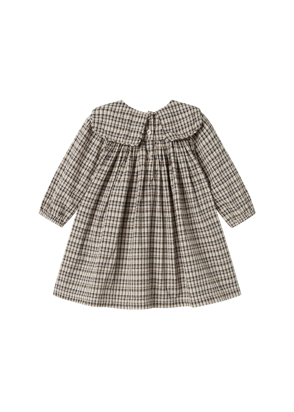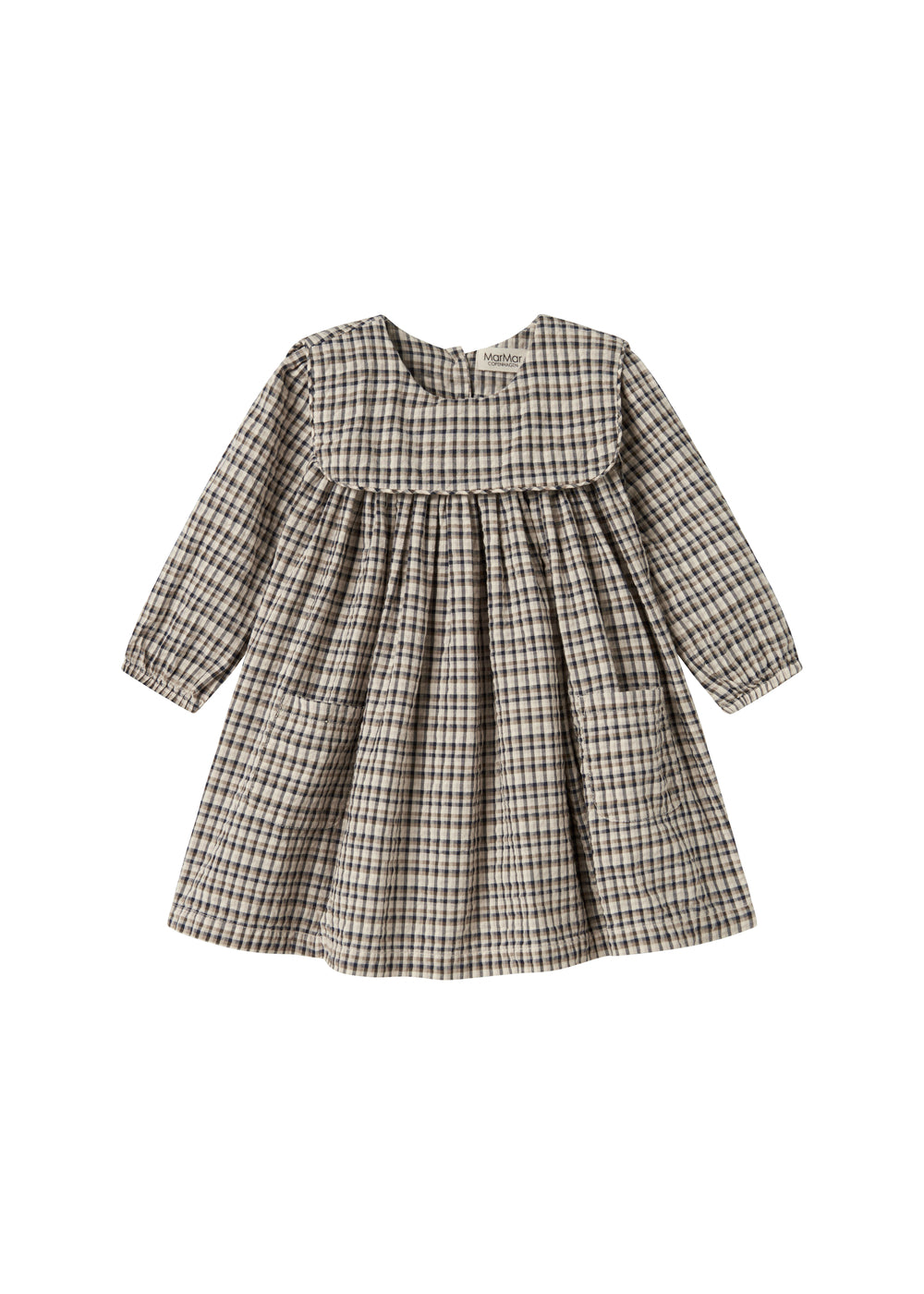 Langærmet kjole til de mindste i crepet bomuld med løs pasform og fin stor dekorativ krave. Kjolen har to lommer foran og knaplukning bagpå. Kjolens længde går til over knæet.