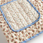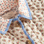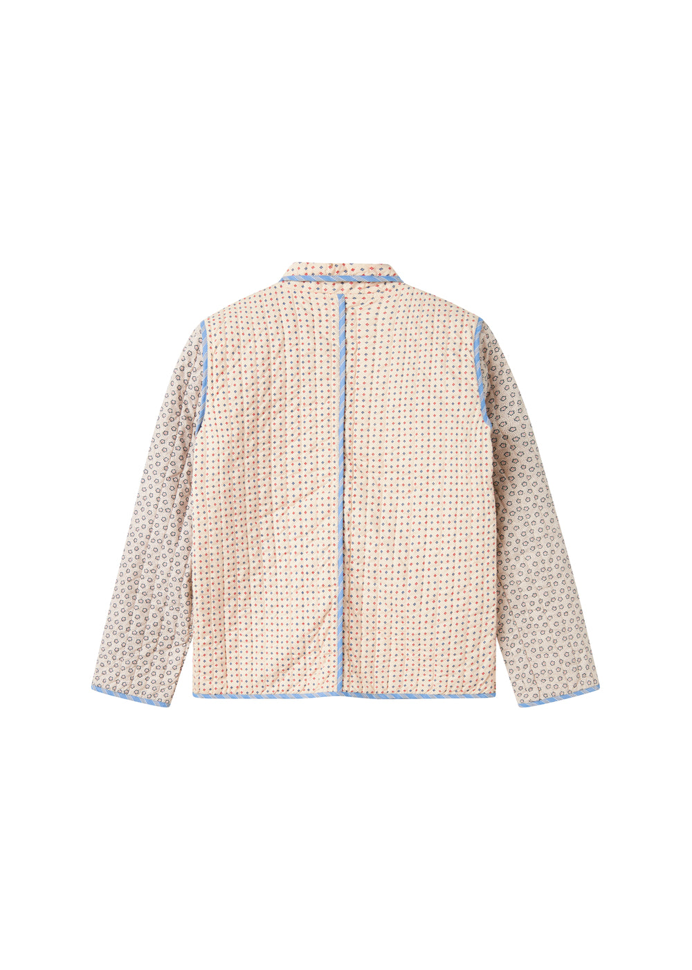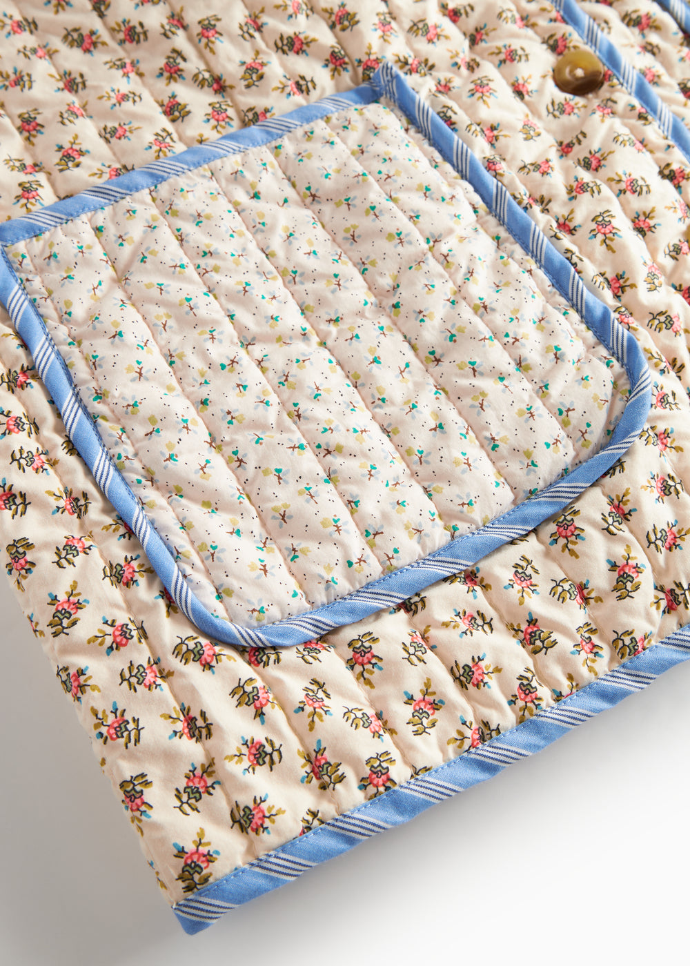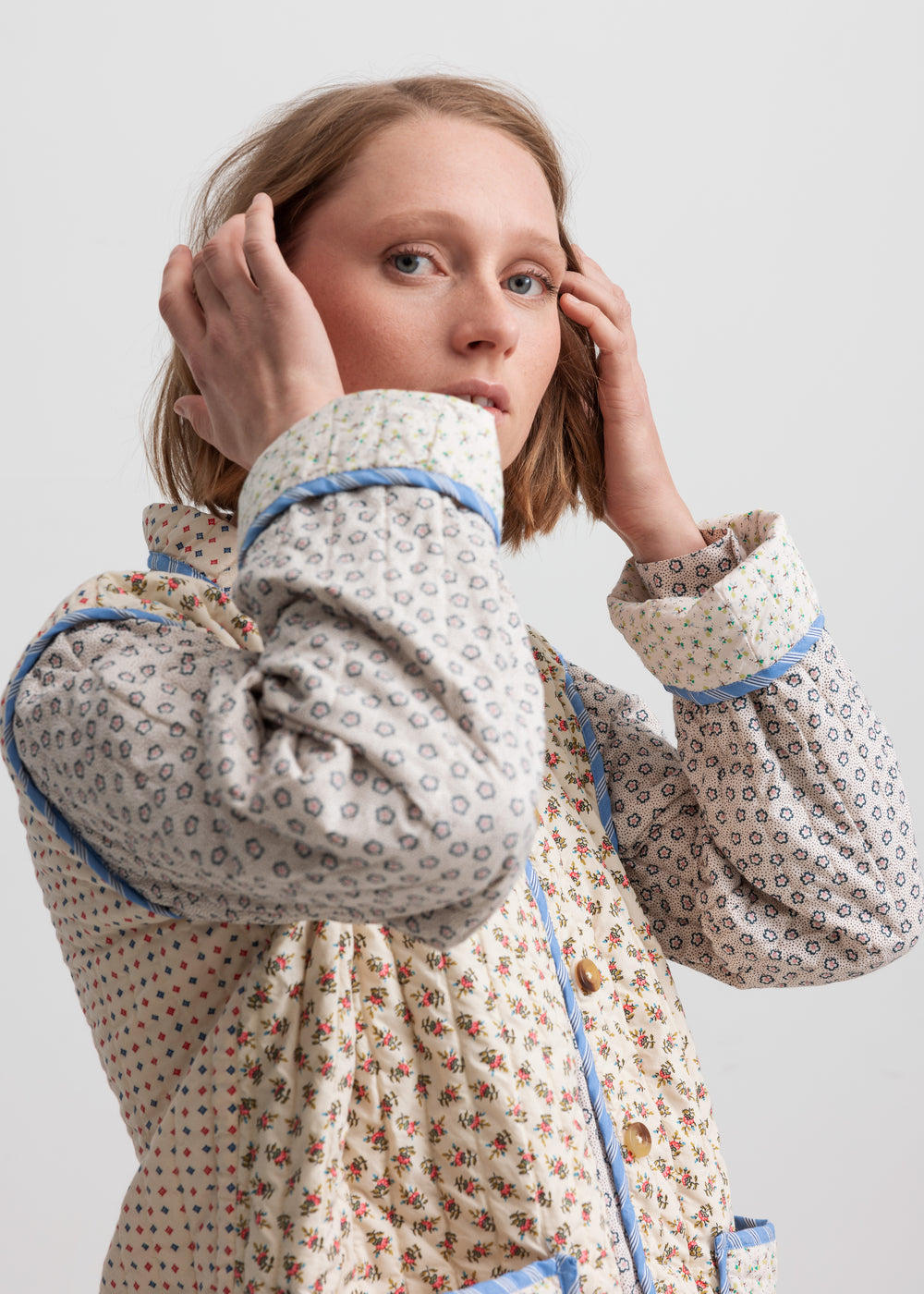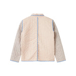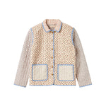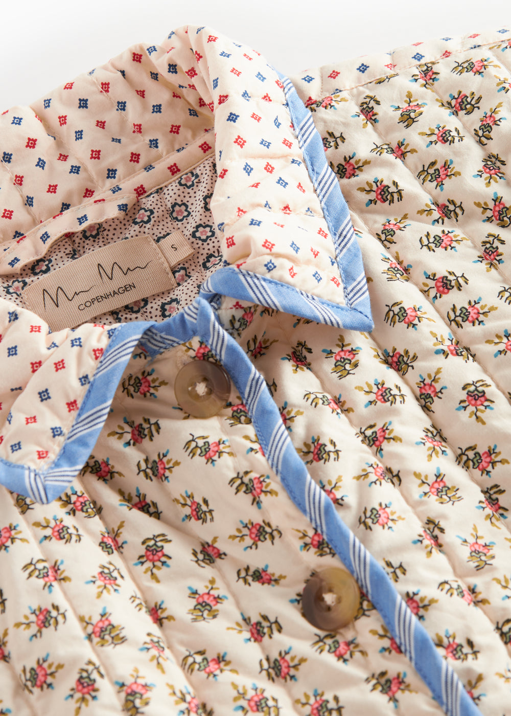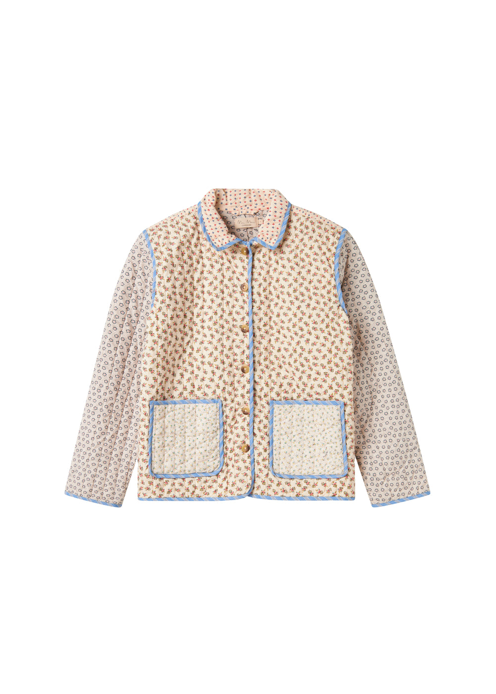 Quiltet jakke til kvinder med forskellige blomstrede mønstre og kontrastfarvet kantbånd. Jakken har krave, to store rummelige lommer og knaplukning foran. Jakken er perfekt til overgangsvejret.
