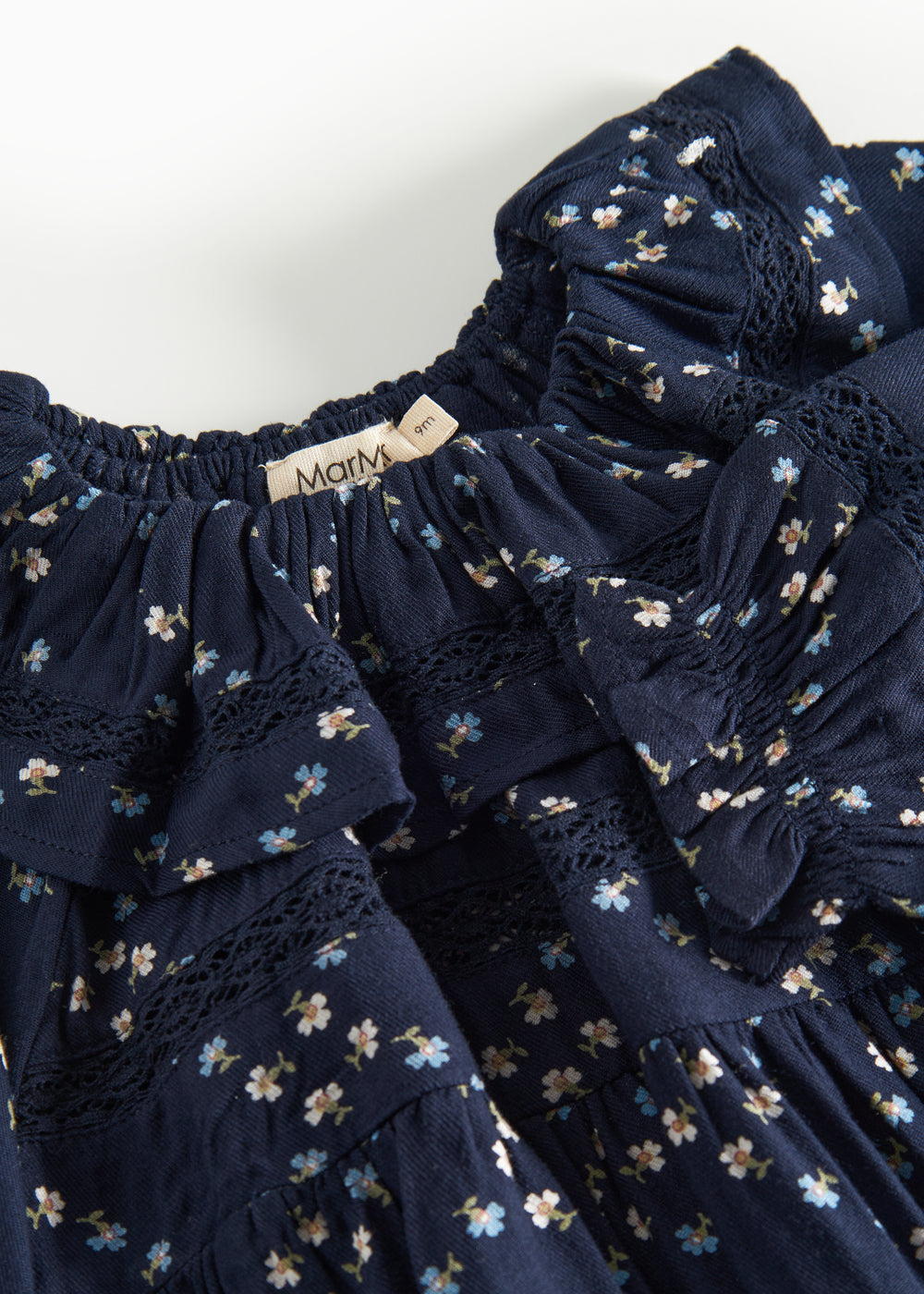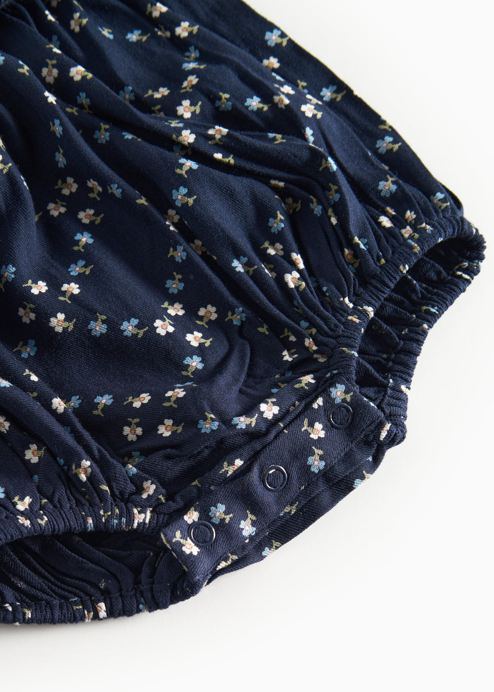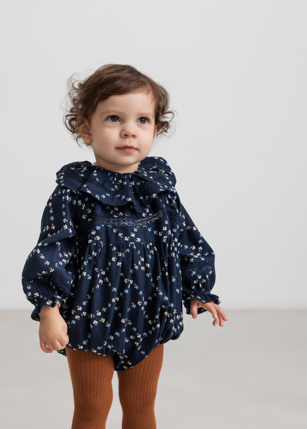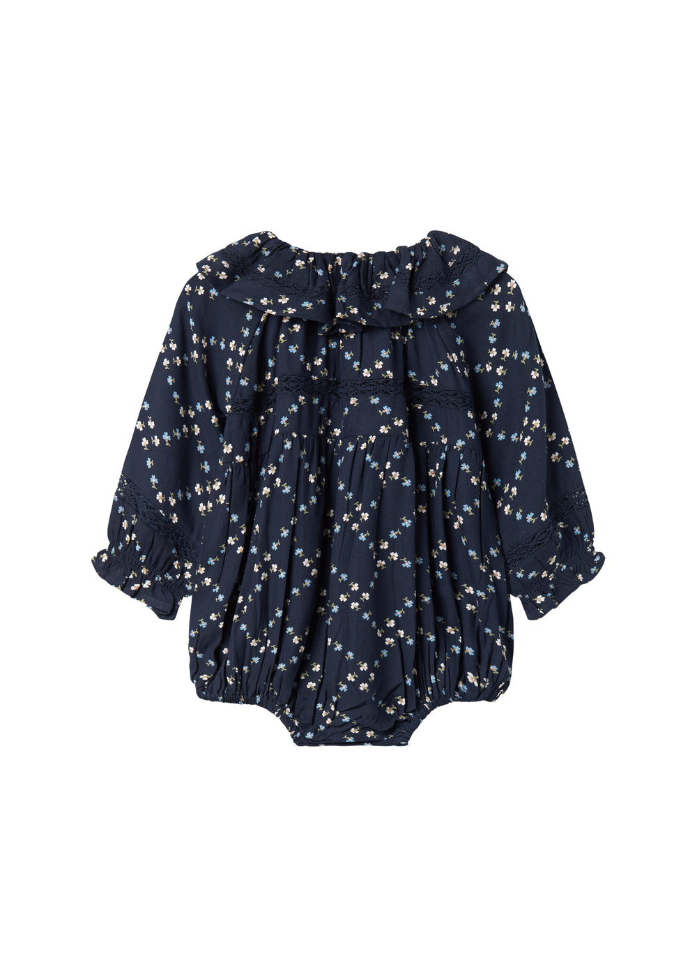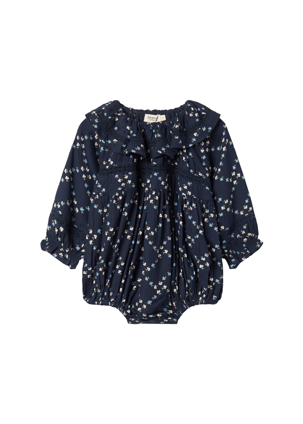 Løstsiddende romper med blomster print i blød viskose med lange ærmer og en fin krave med blonde detaljer. Romperen bliver lukket med trykknapper mellem benene for nem bleskiftning.