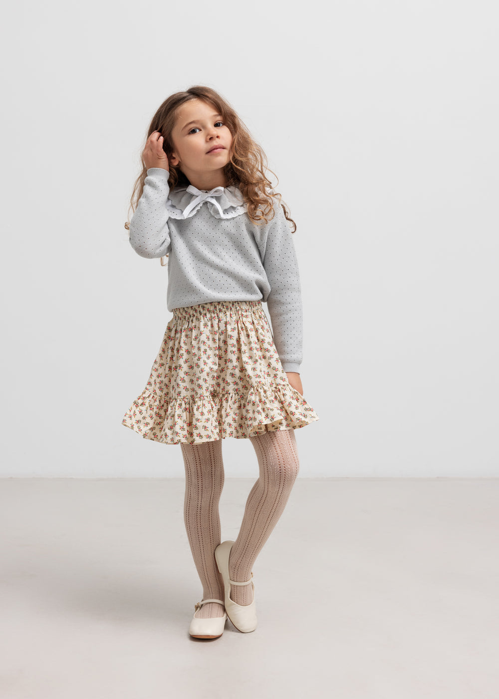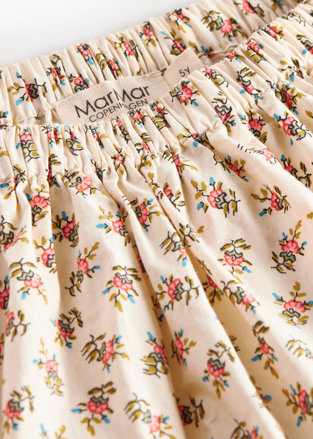 Løstsiddende nederdel med fint håndtegnet blomster print, bred flæsekant forneden og elastik i taljen, der sikre en behagelig pasform. Nederdelens længde går til over knæet. Nederdelen er både behagelig, let og luftig at have på.