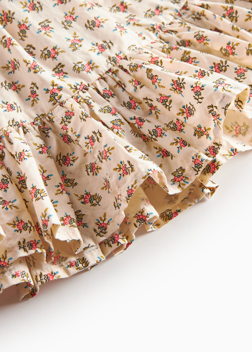 Nærbillede af stof med blomstermønster og flæsekant på nederdel