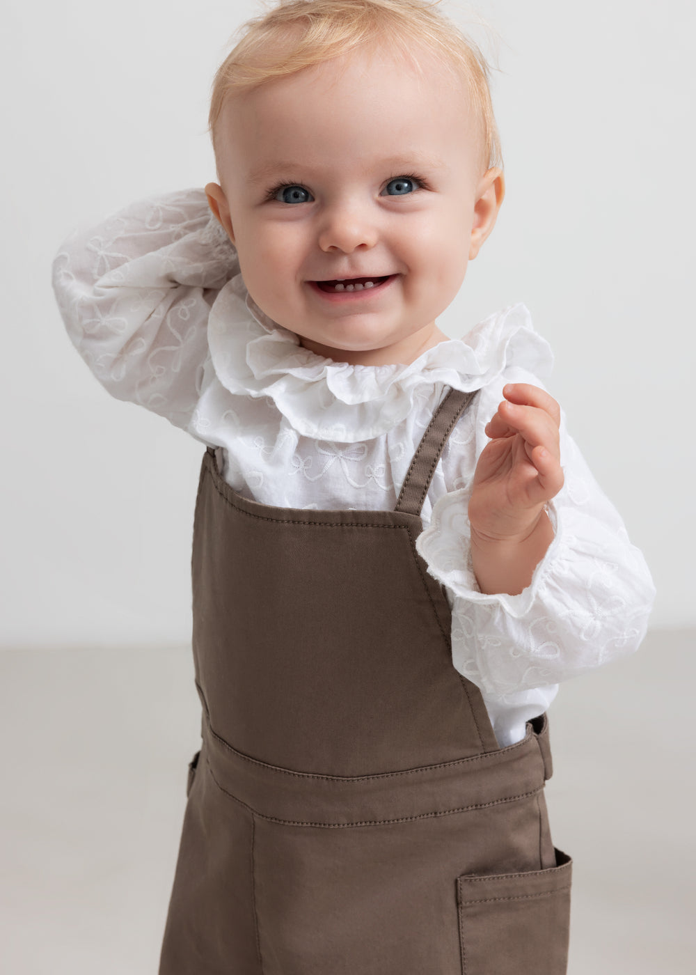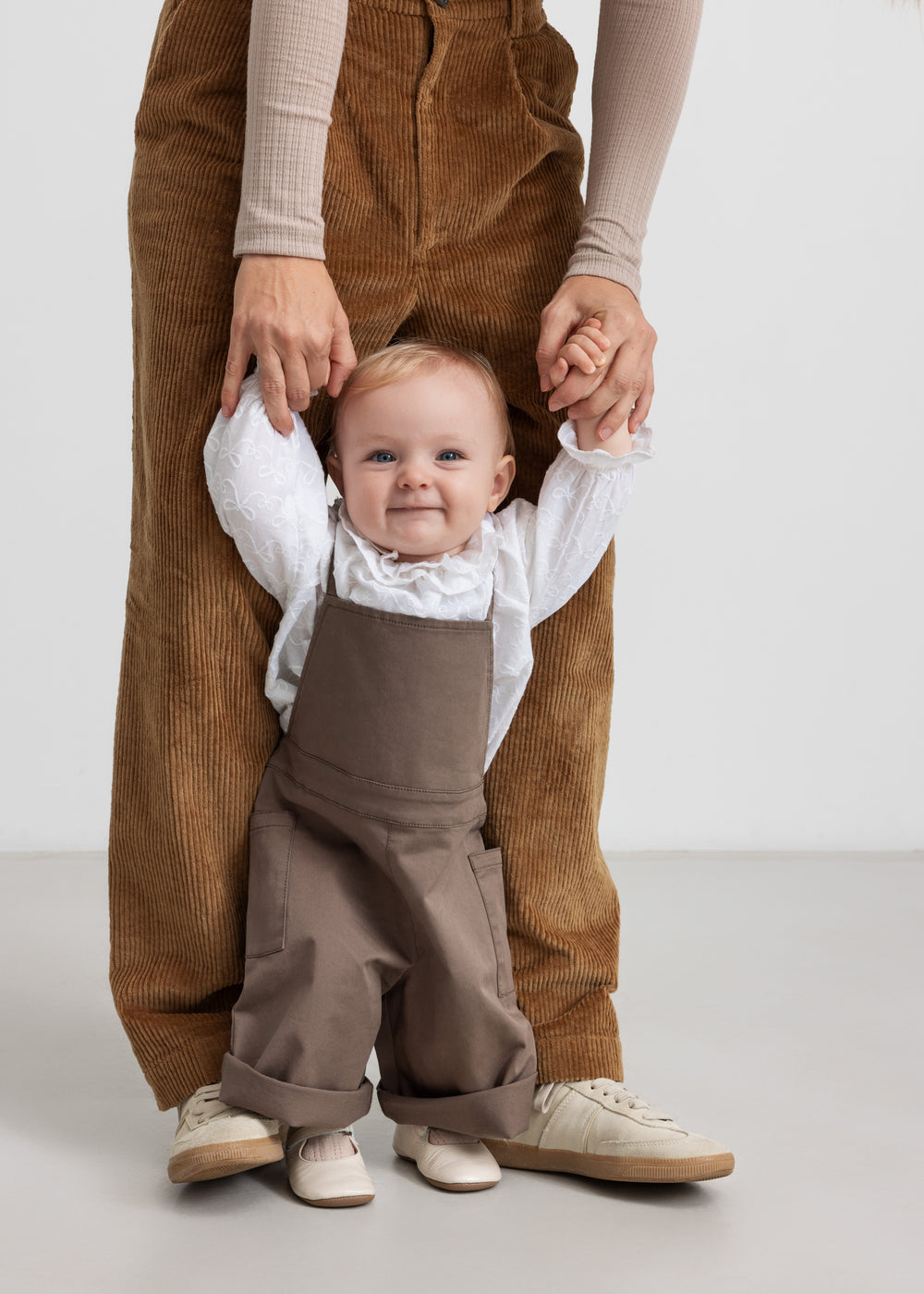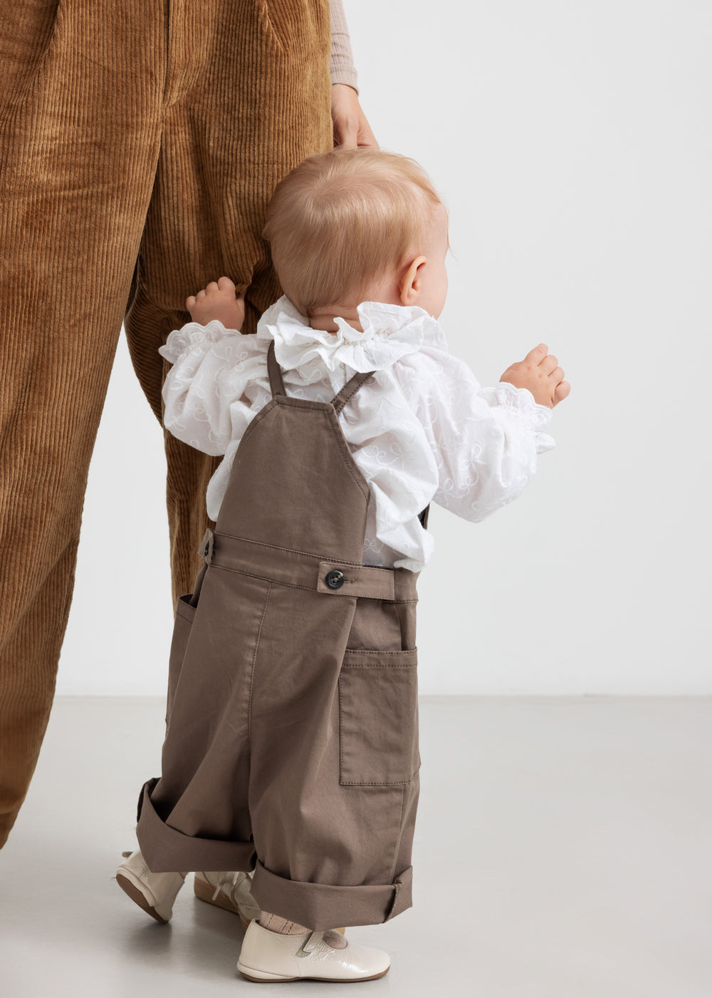 Chino selebukser til de mindste med brede ben for et behageligt look. Selebukserne har to rummelige lommer samt kan justeres i taljen med knapper i hver side. Selebukserne har justerbare stropper med knaplukning.