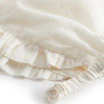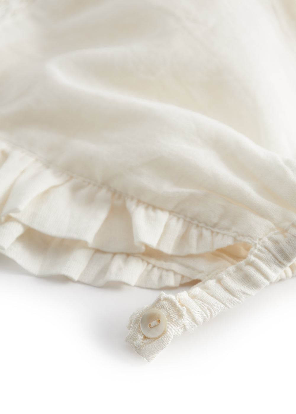 Sød kyse med flæsekant og strop under hagen. Stroppen lukkes med knap i 2 længder.