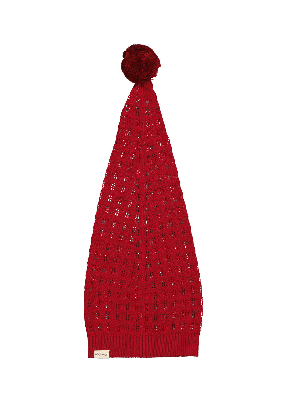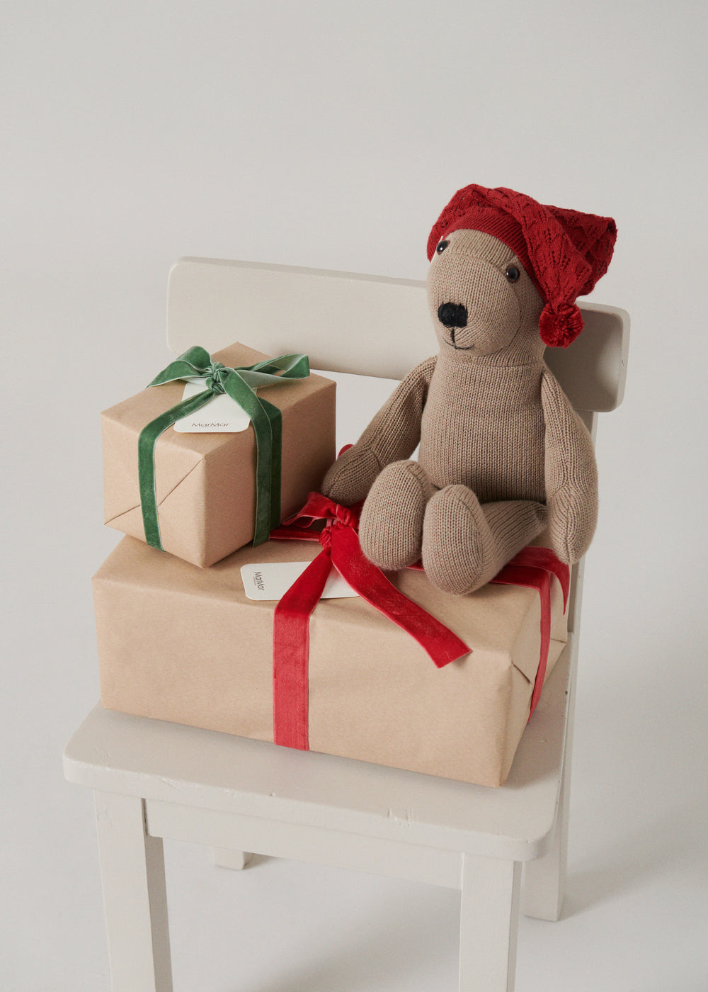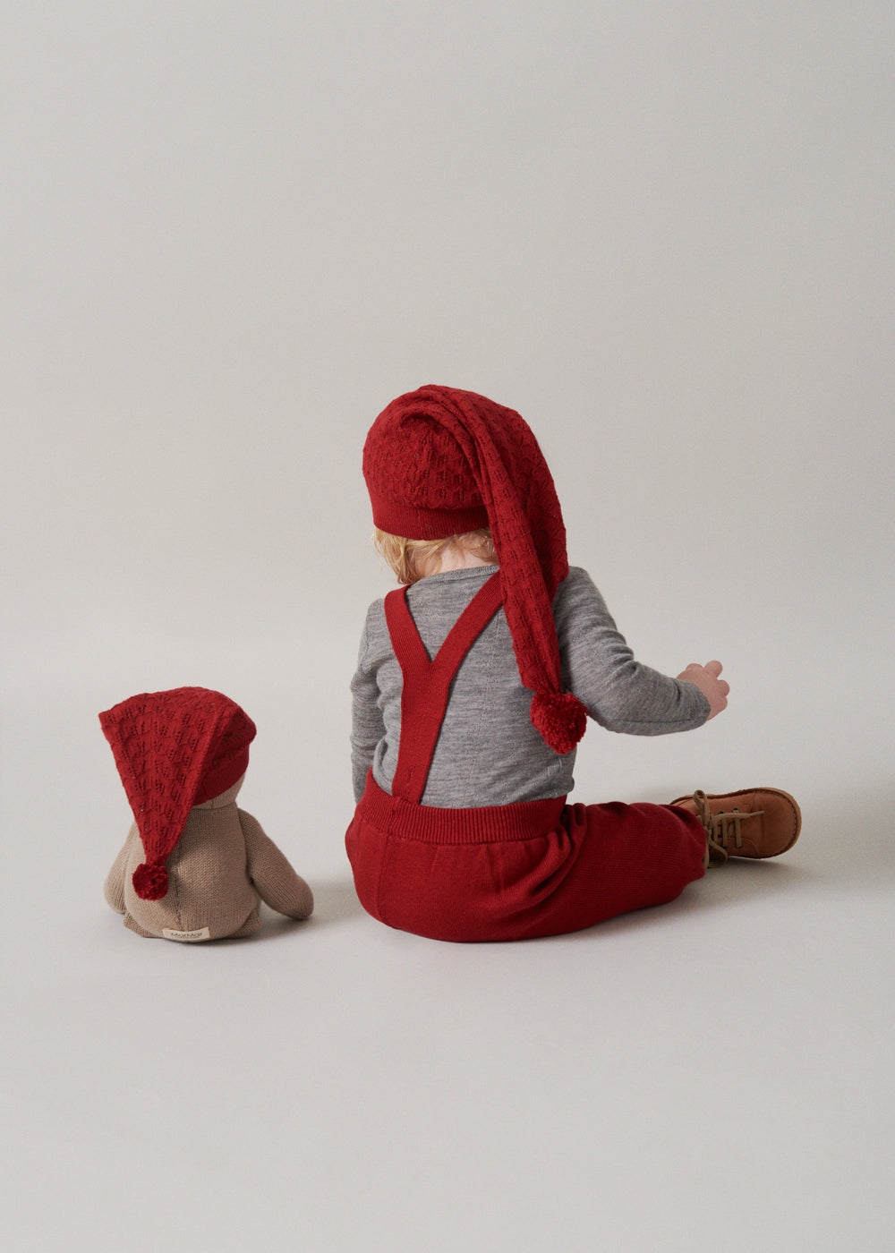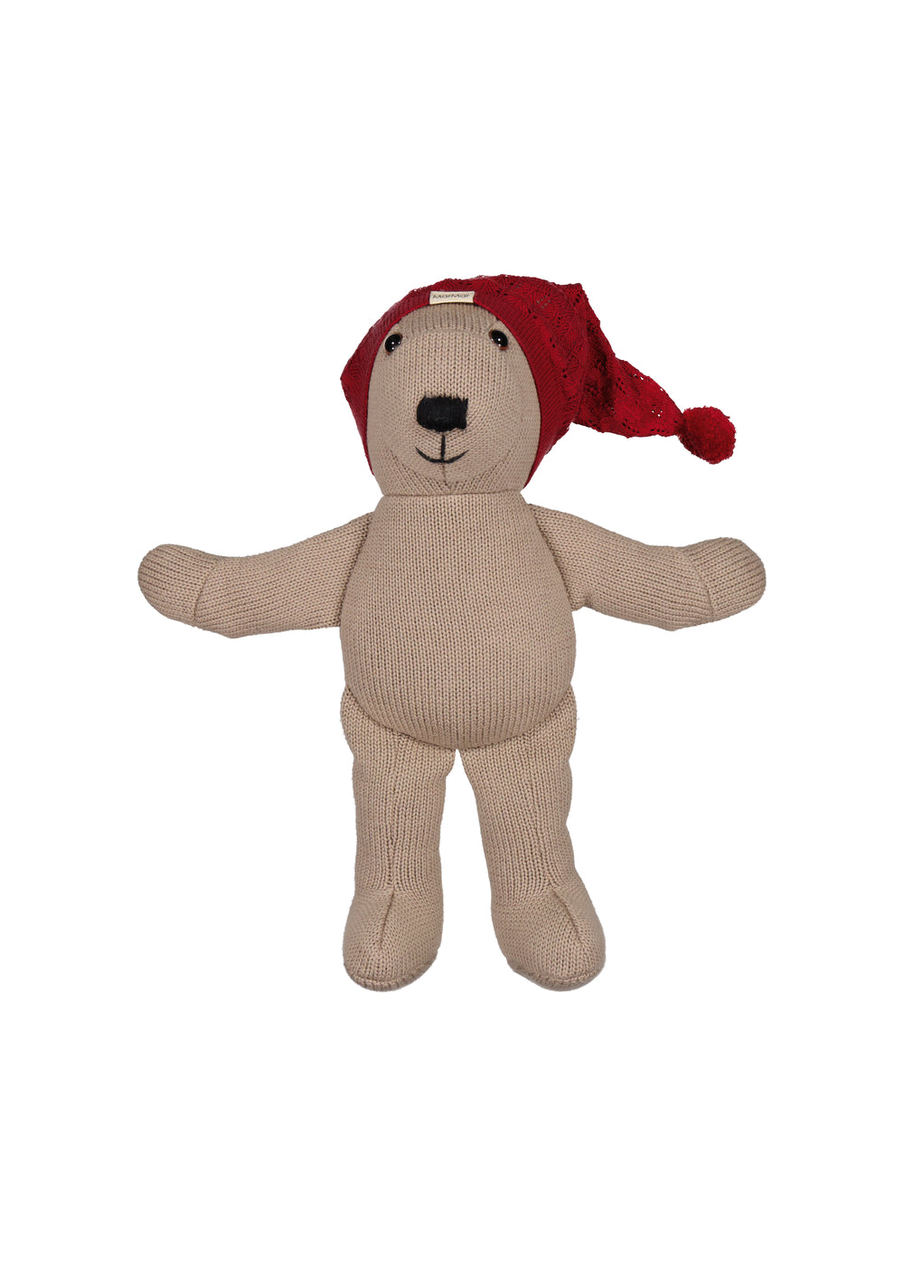 Nissehue til bamse i strik med blonde detaljer. Nissenhuen passer perfekt til vores bløde bamse Teddy. Bemærk at bamsen skal købes for sig selv. Find den her.