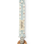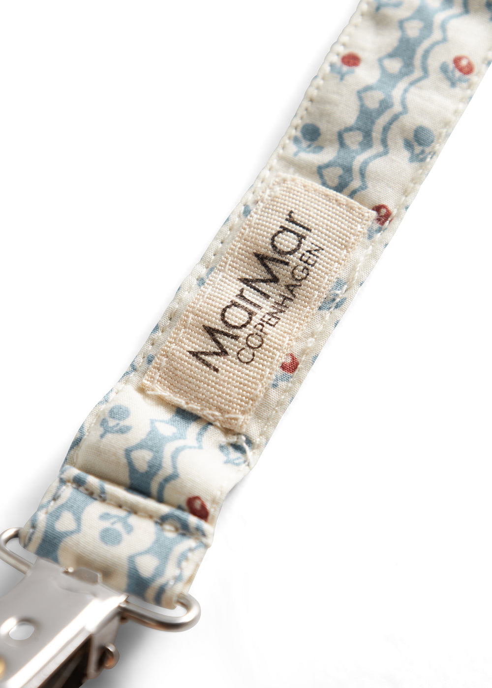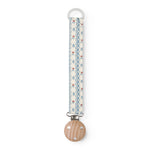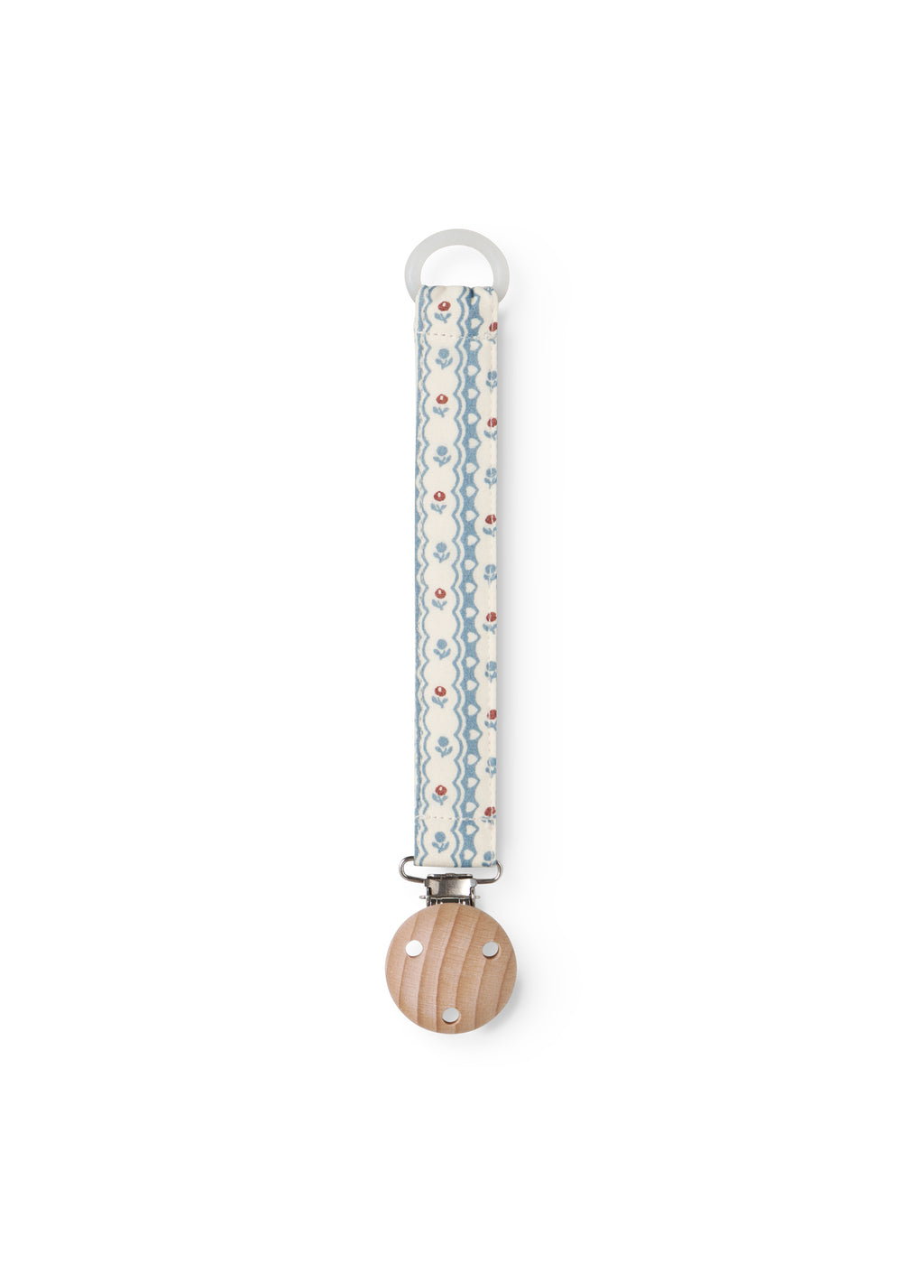 Suttesnor med gummiring og træ/metalklips. Længde på snor 19,5 cm.
