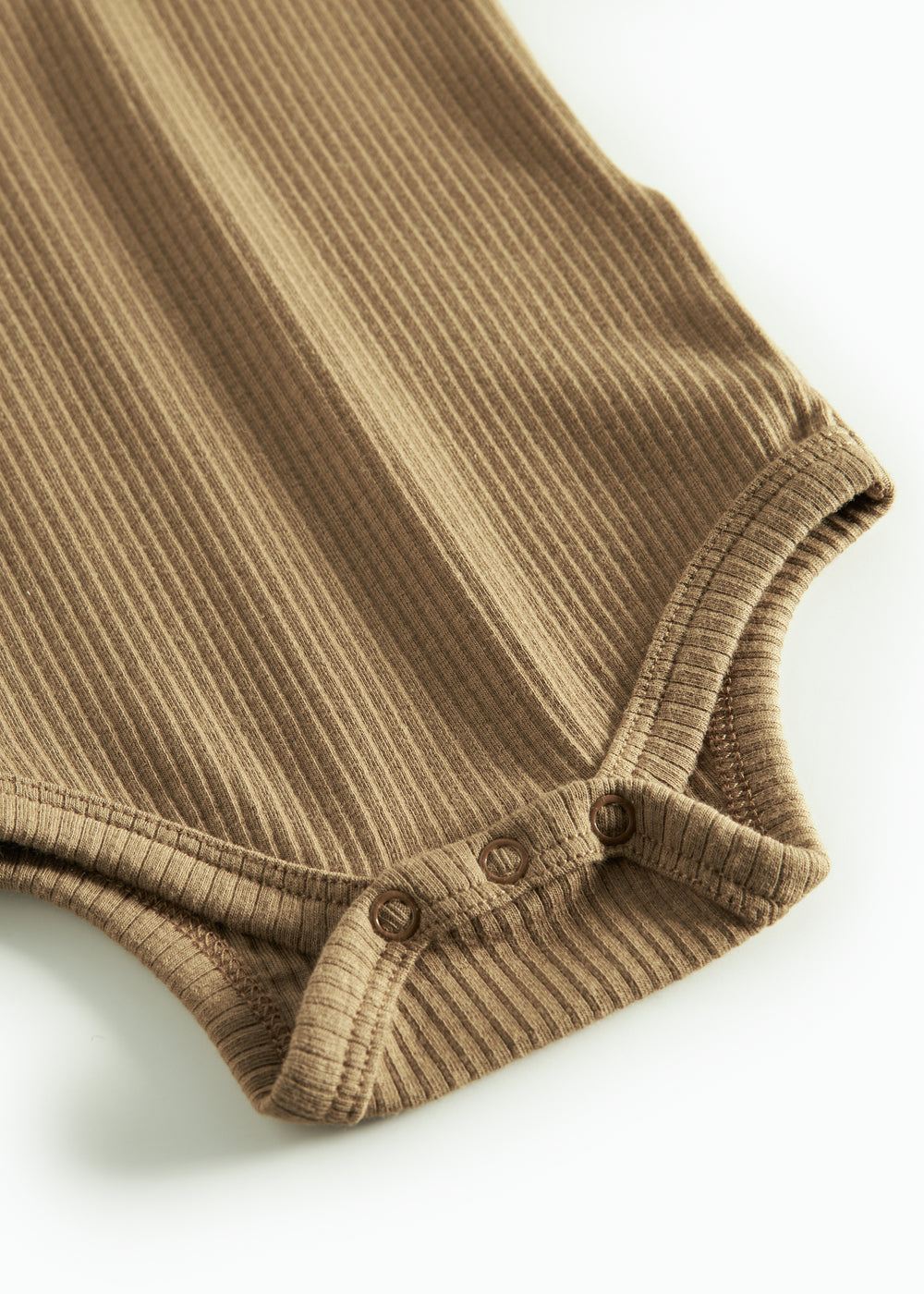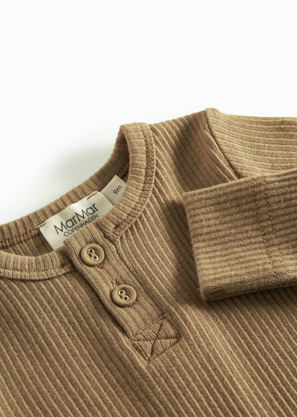 Langærmet baby modal bodystocking med stolpe knaplukning, der bliver lukket med trykknapper mellem benene for nem bleskiftning. Bodystockingen er både ribstrikket, blød, holder form og farve og har elastan i sig som gør den strækbar og behagelig at have på.