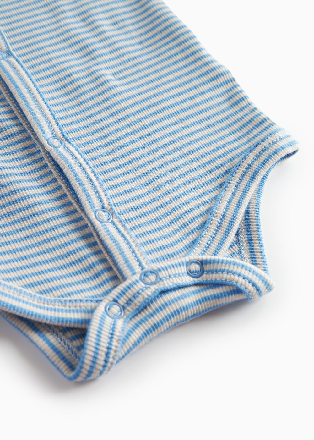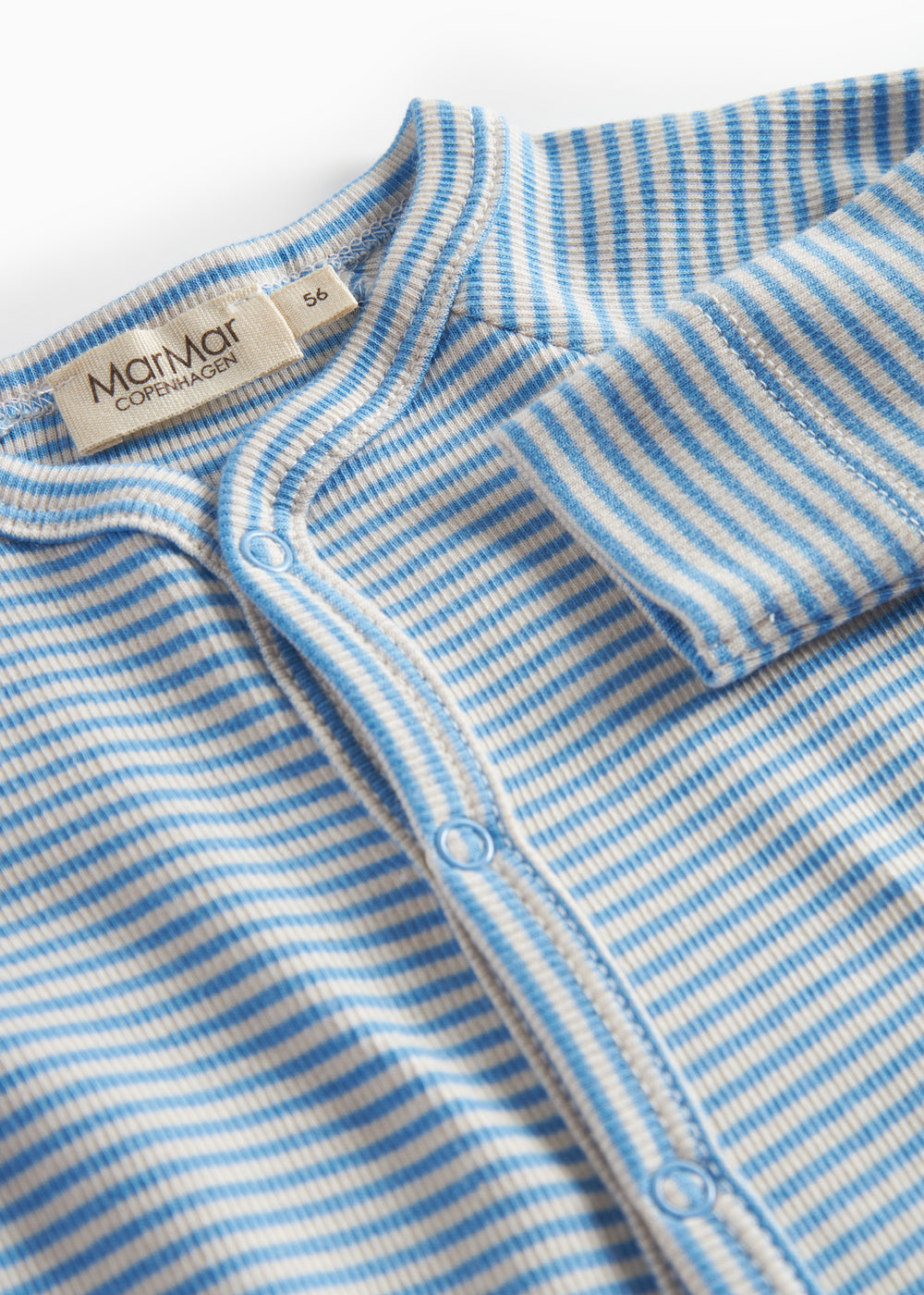 Enkel langærmet bodystocking med striber, der bliver lukket med trykknapper hele vejen ned foran samt mellem benene for nem bleskiftning. Bodystockingen er både blød, holder form og farve og har elastan i sig som gør den strækbar og behagelig at have på.