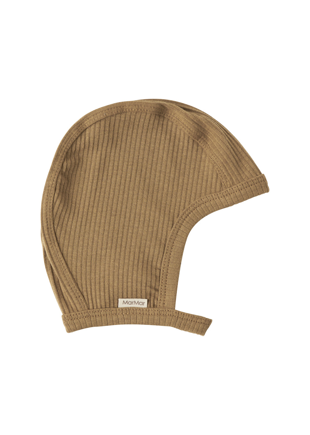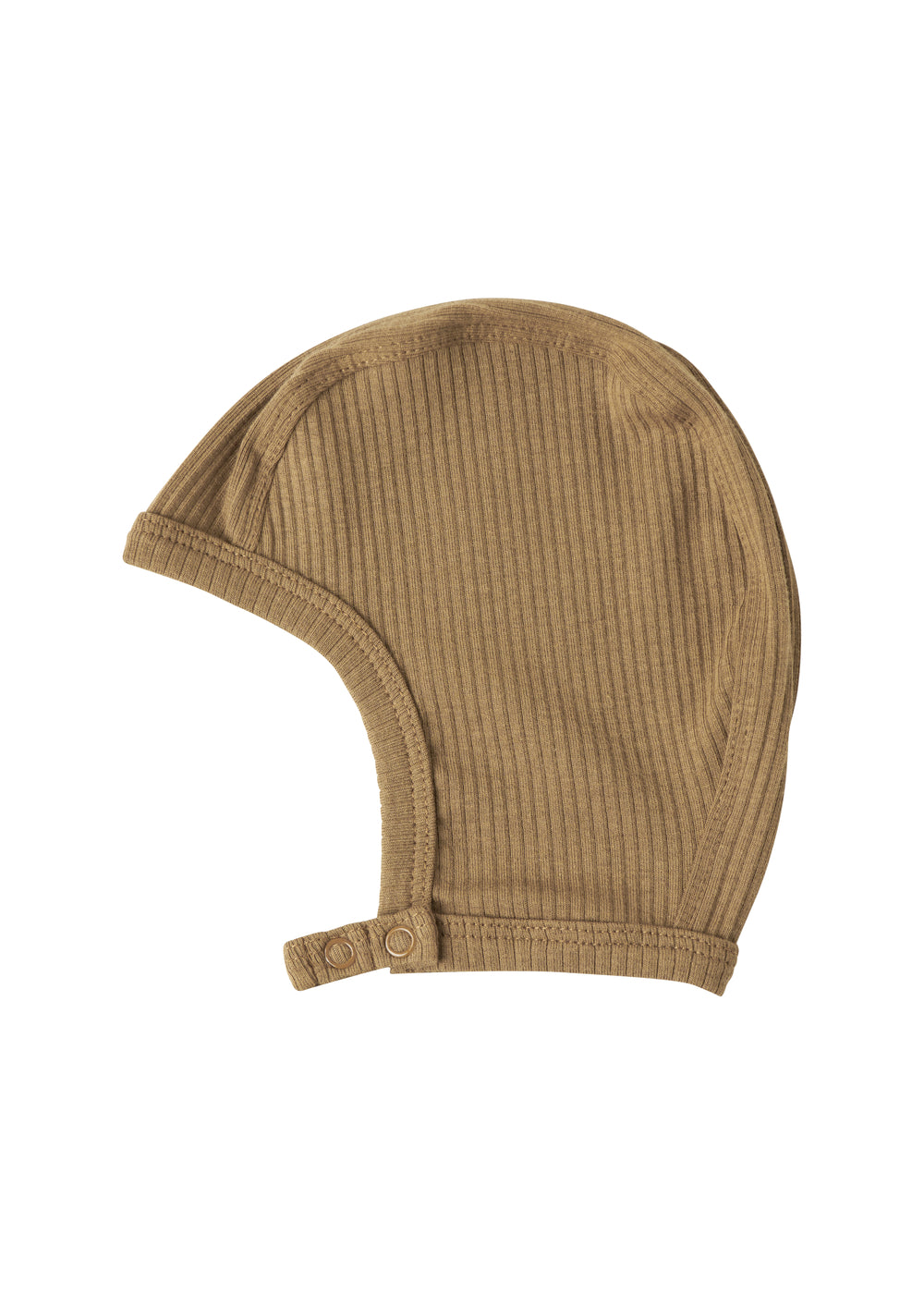 Fin lille baby hjelm som lukkes med trykknap i to længder. Huen er ribstrikket, blød, strækbar og behagelig at have på.