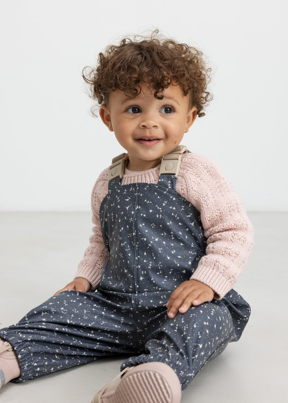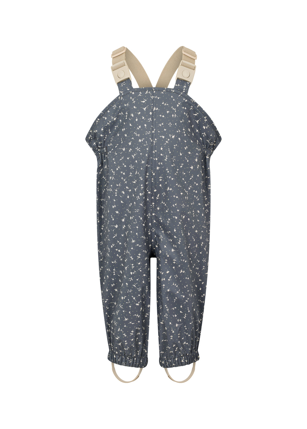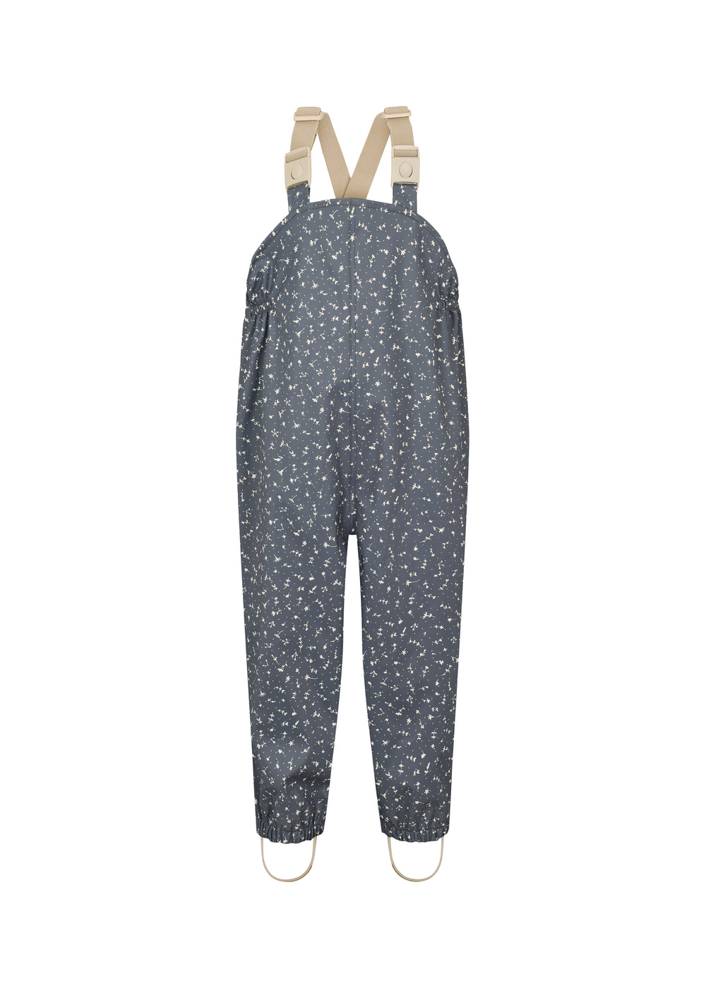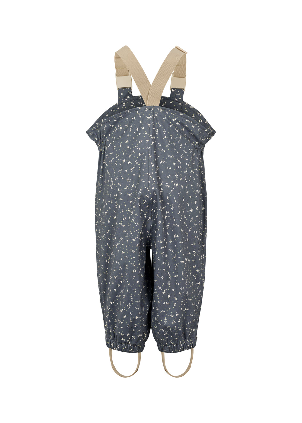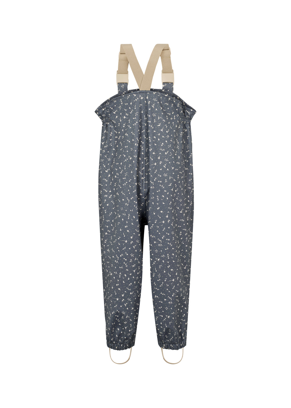 Børne-regnbukser i mørkeblå med små hvide blomster, justerbare seler og fodstropper