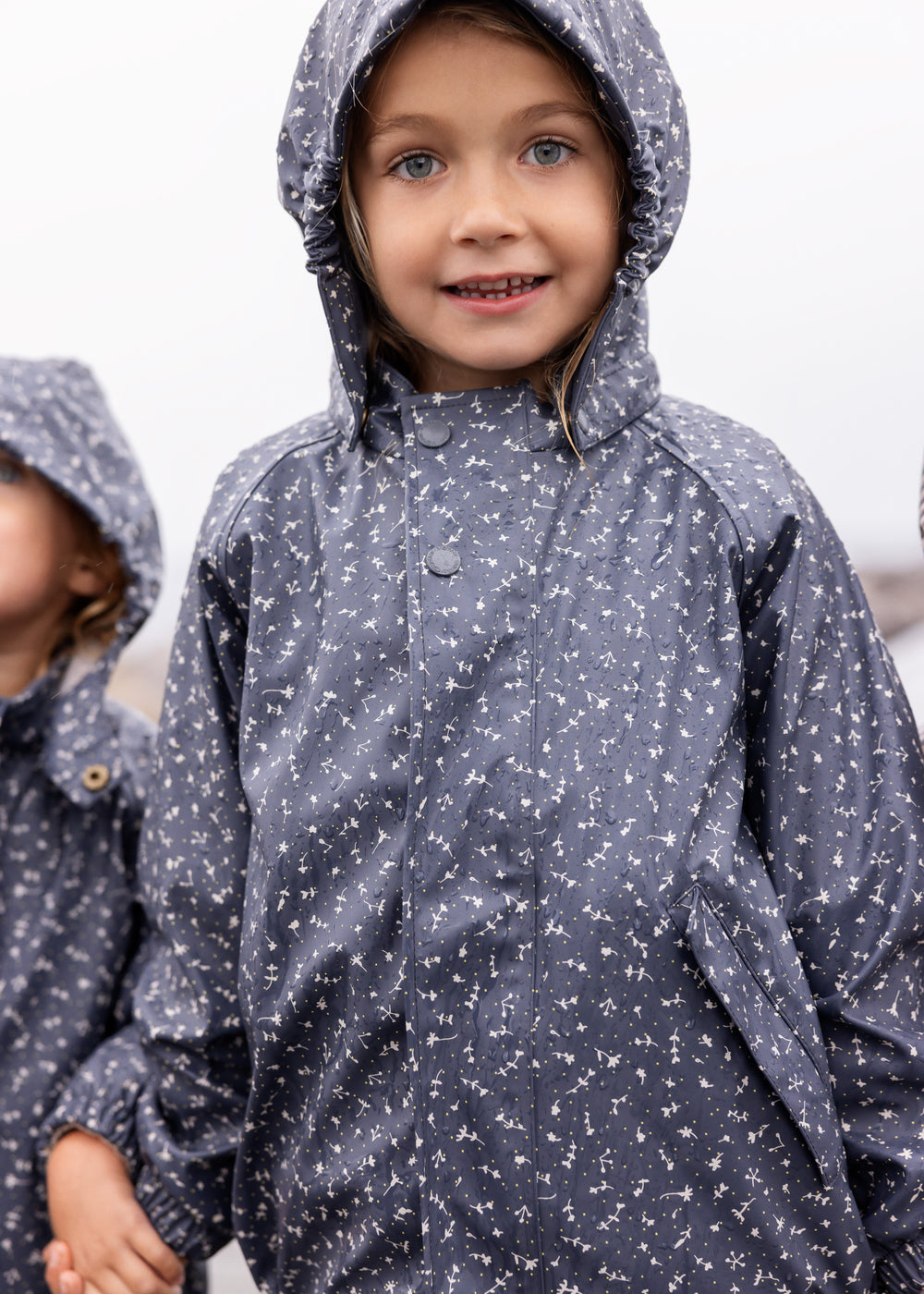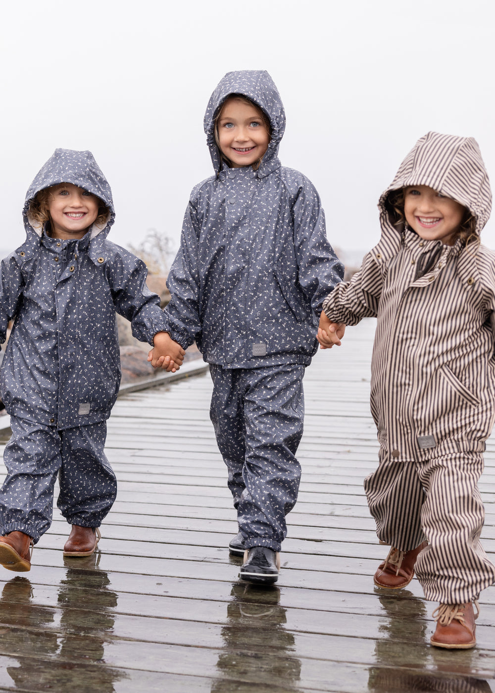 Tre børn i regntøj, midterste barn iført mørkeblåt sæt med print og hætte