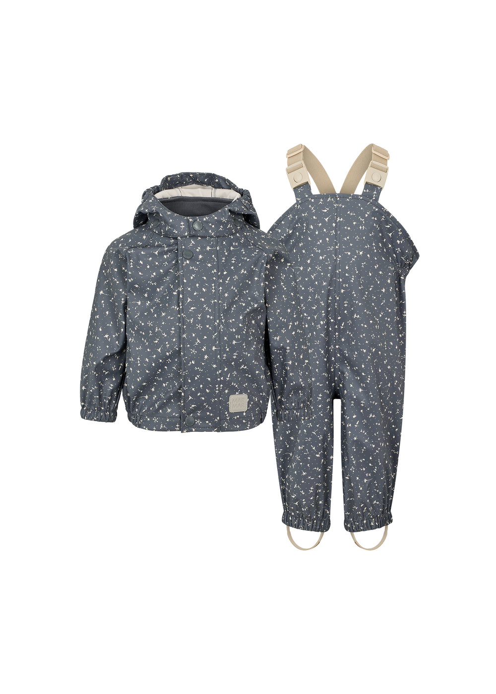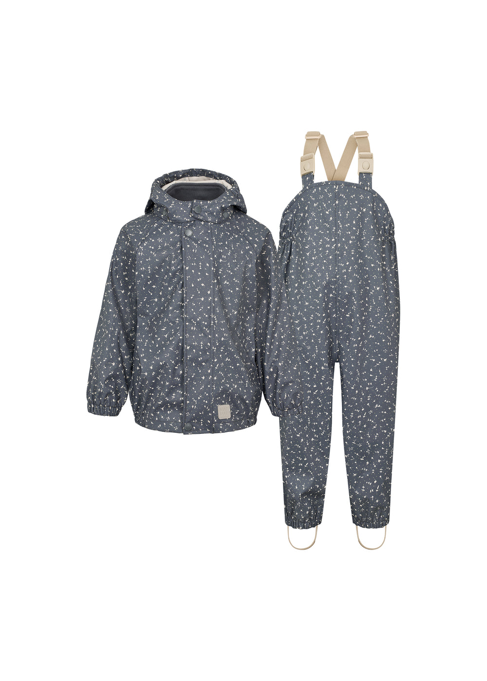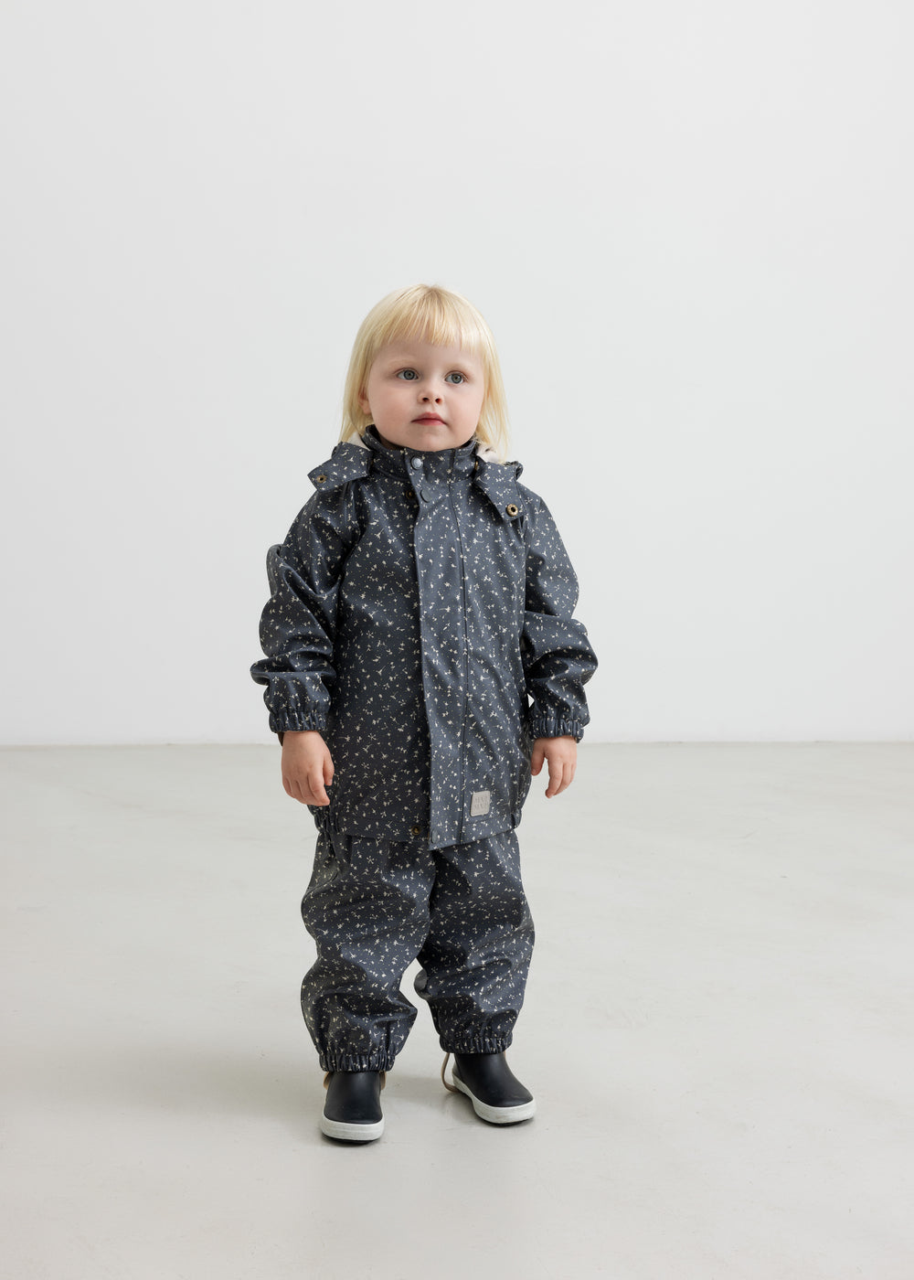 Regnsæt til de mindste. Regnbukserne har justerbare seler og har elastik i siderne for at sikre den bedste pasform. Regnbukserne har praktiske fodstropper som sørger for, at bukserne bliver siddende over støvlerne, så der ikke kommer vand ind. Jakken har en lomme foran og lukkes med lynlås og trykknapper. Jakken har en aftagelig hætte, der kan fjernes efter behov, og elastiske manchetter ved ærmerne, som sikrer en tætsiddende pasform og forhindrer vand i at trænge ind.