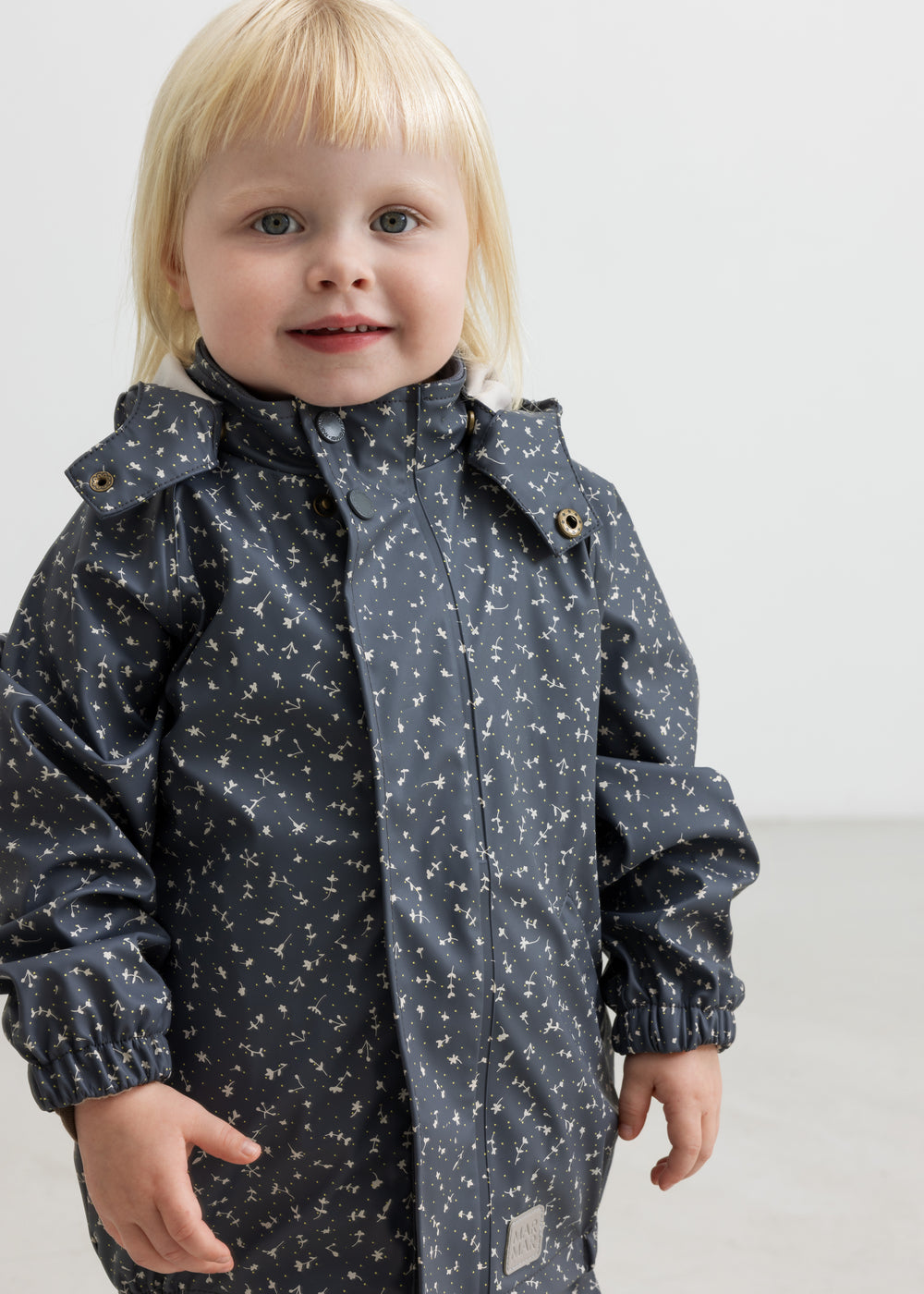 Barn i mørkeblå regnjakke med print og sorte støvler, står rakt op