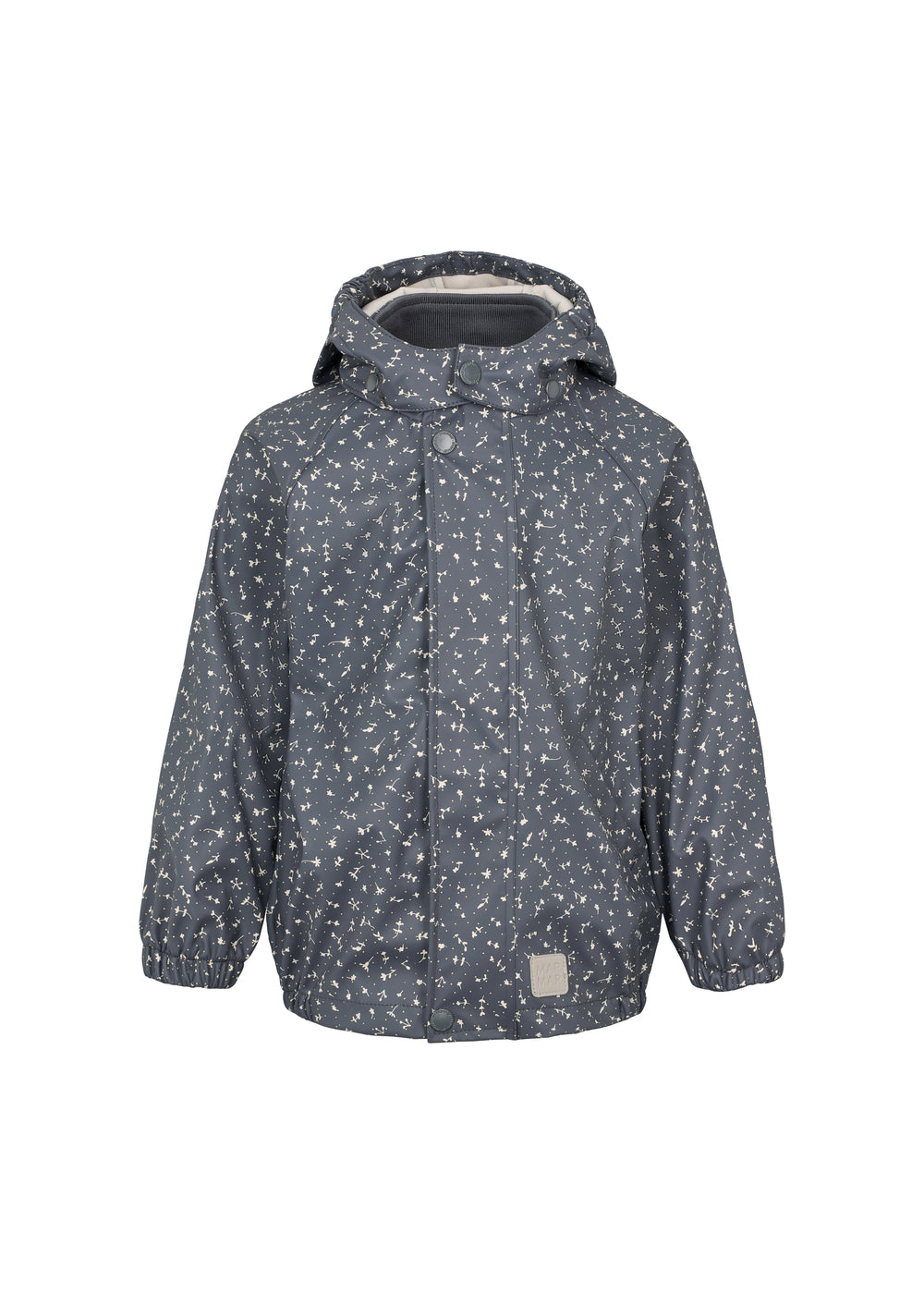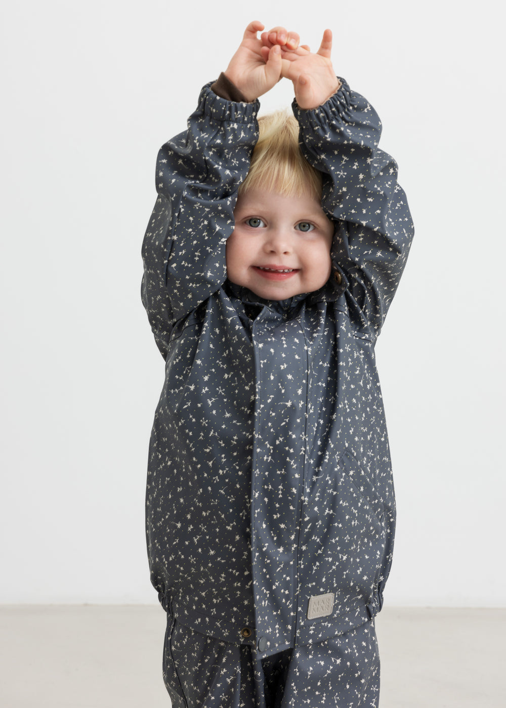 Vores regntøj er designet med mange praktiske detaljer. Det holder ikke bare dit barn tør. Vi har valgt en metervare som er let og behagelig. Den strikkede rib i halsen er blød og behagelig og det samme gælder fleecen indvendigt ved håndleddet.