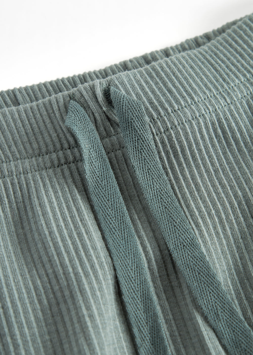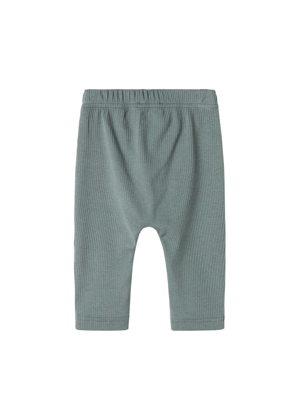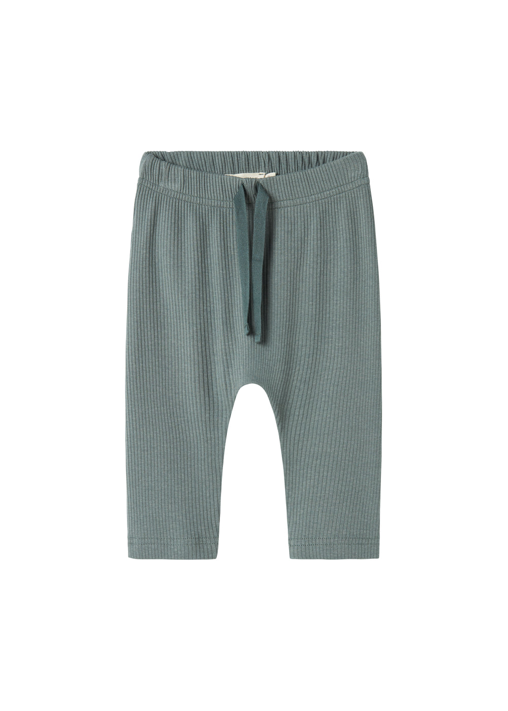 Baby bukser med bred elastik og bindebånd i taljen. Bukserne er ribstrikket, bløde, strækbare og behagelige at have på.