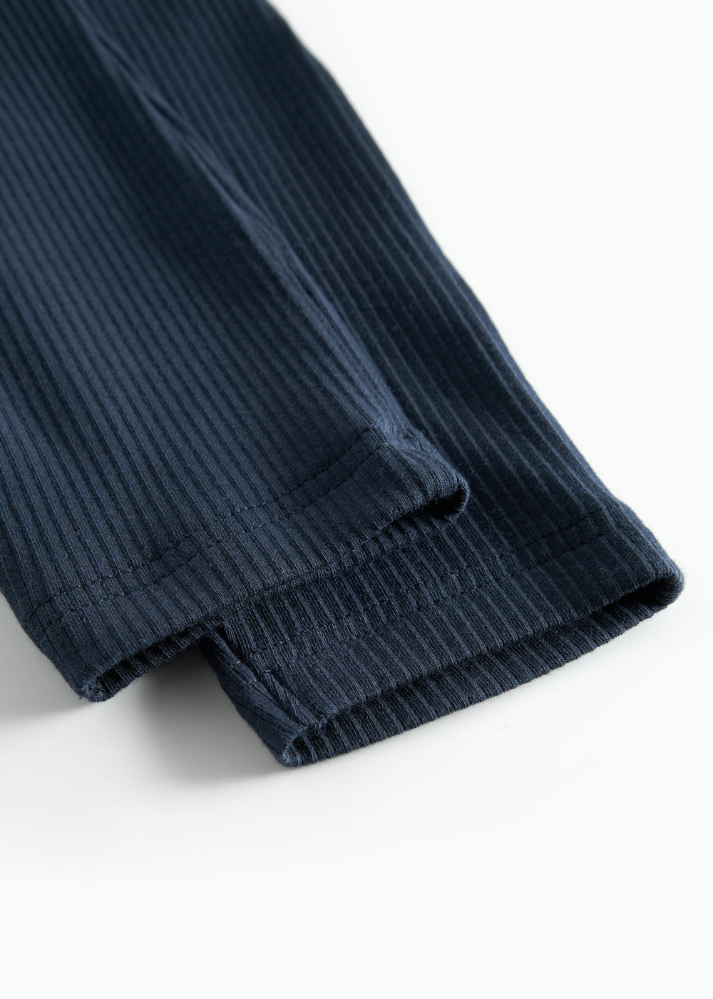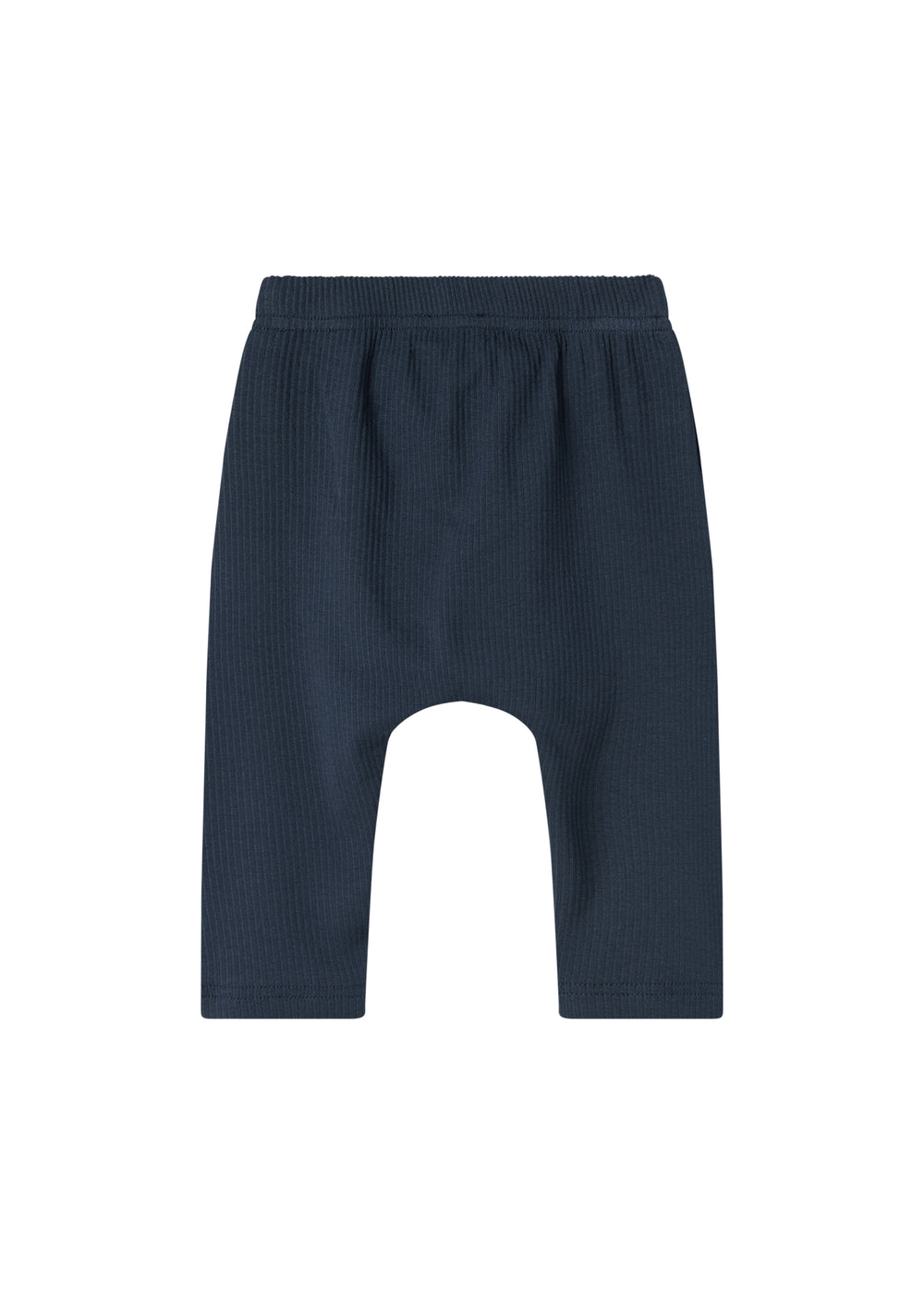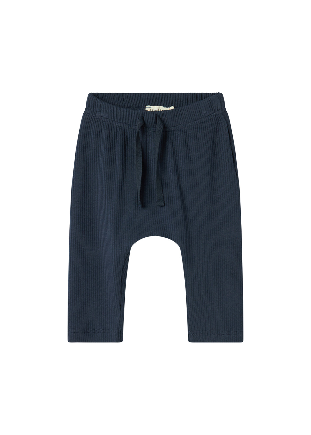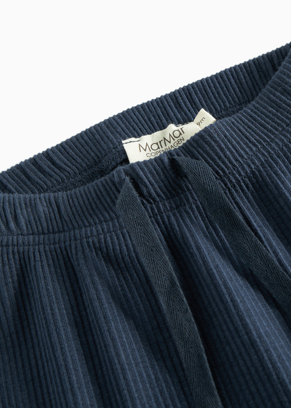 Baby bukser med bred elastik og bindebånd i taljen. Bukserne er ribstrikket, bløde, strækbare og behagelige at have på.