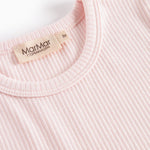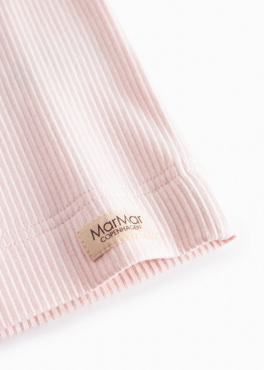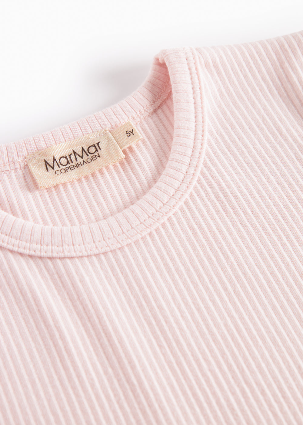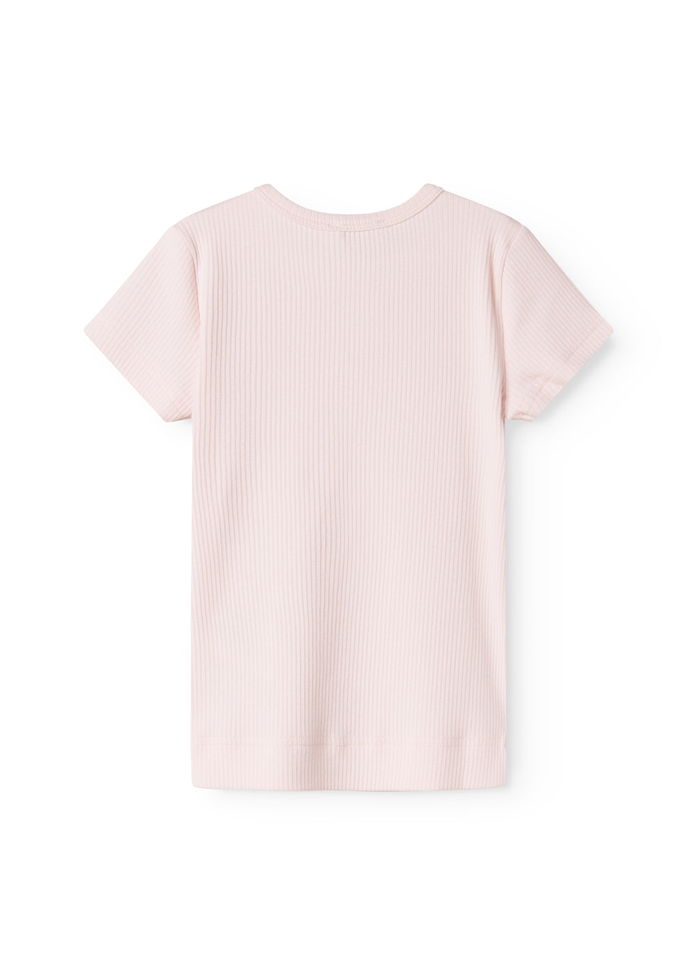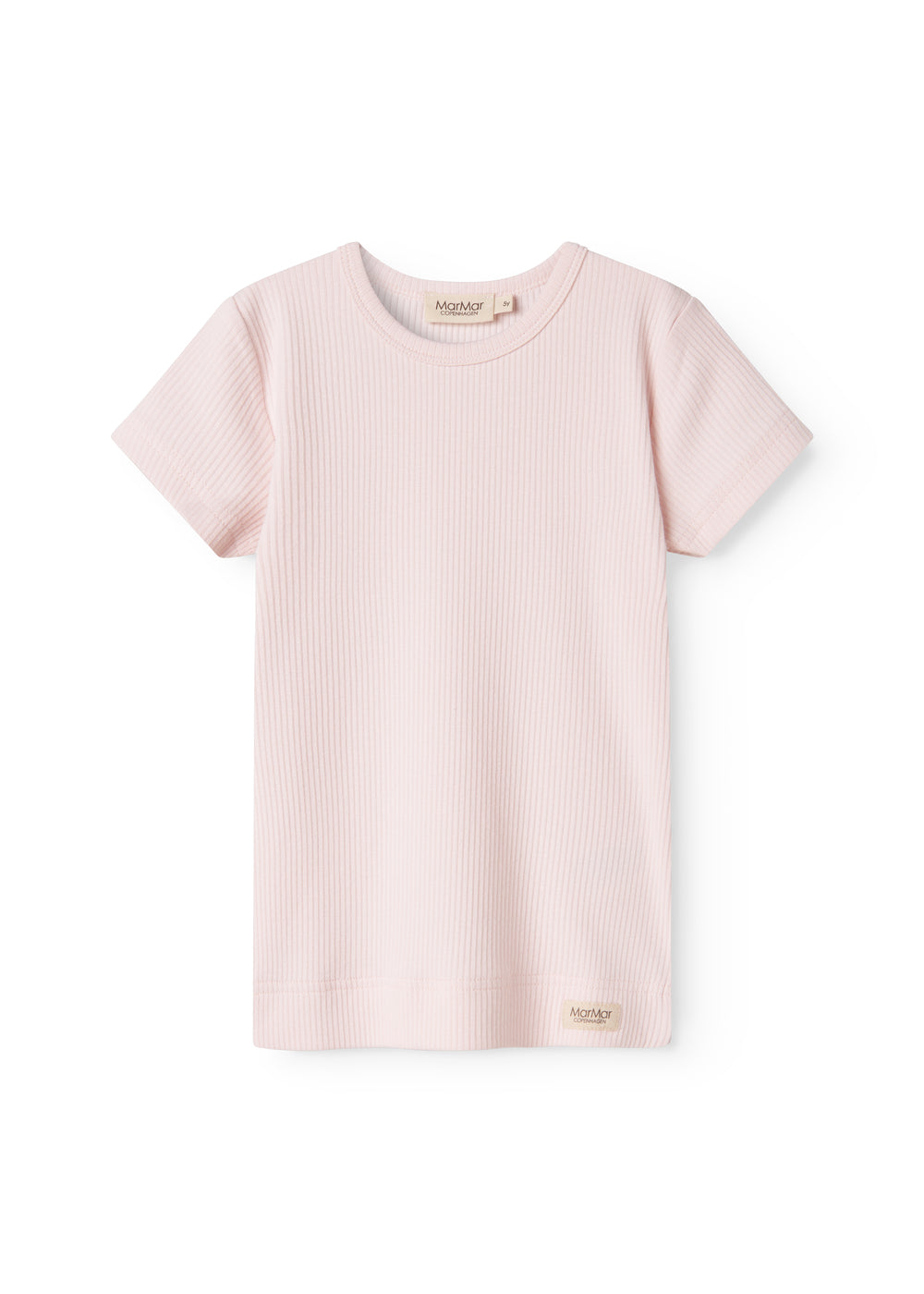 T-shirten er ribstrikket, blød, holder form og farve og har elastan i sig som gør den strækbar og behagelig at have på.