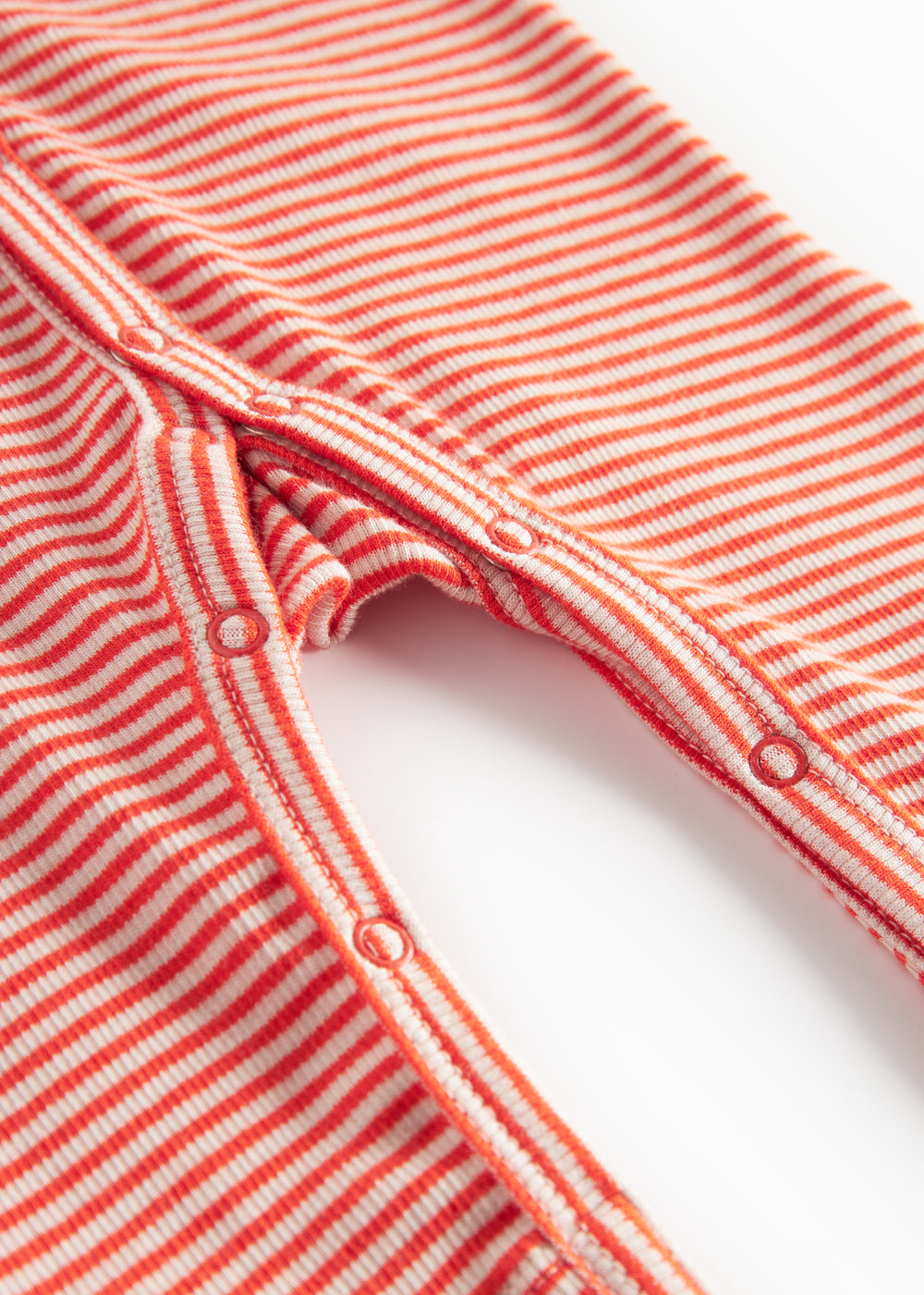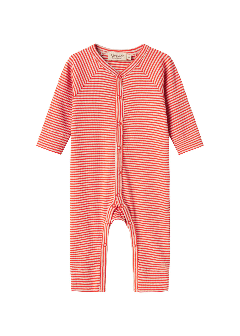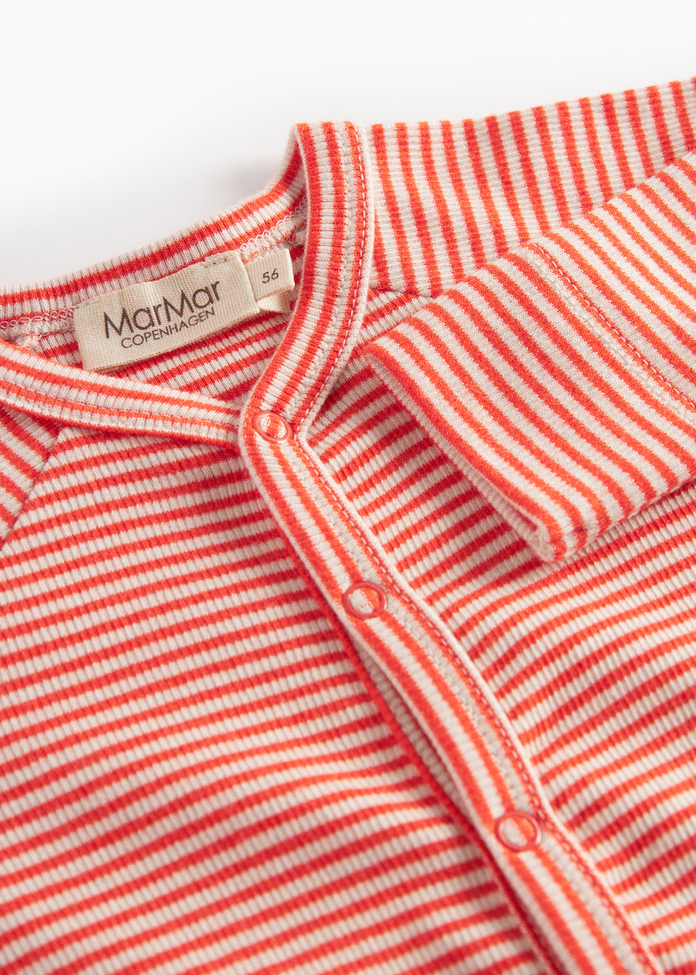 Enkel langærmet heldragt med fine striber, der kan knappes helt fra hals og ned langs begge ben med trykknapper for nem bleskiftning. Heldragten er både blød, holder form og farve og har elastan i sig som gør den strækbar og behagelig at have på.