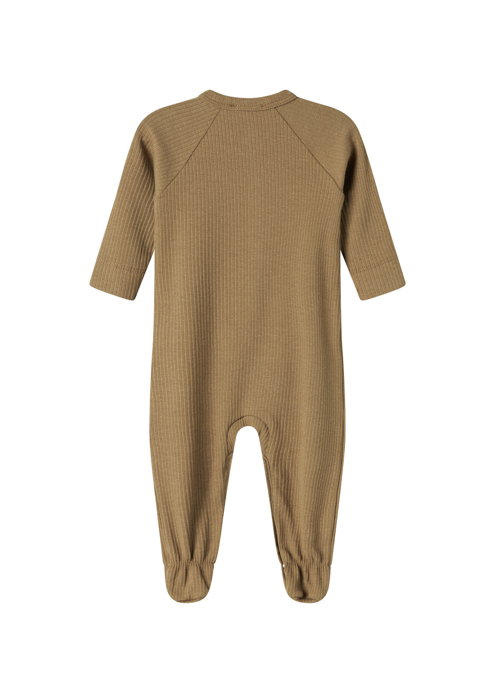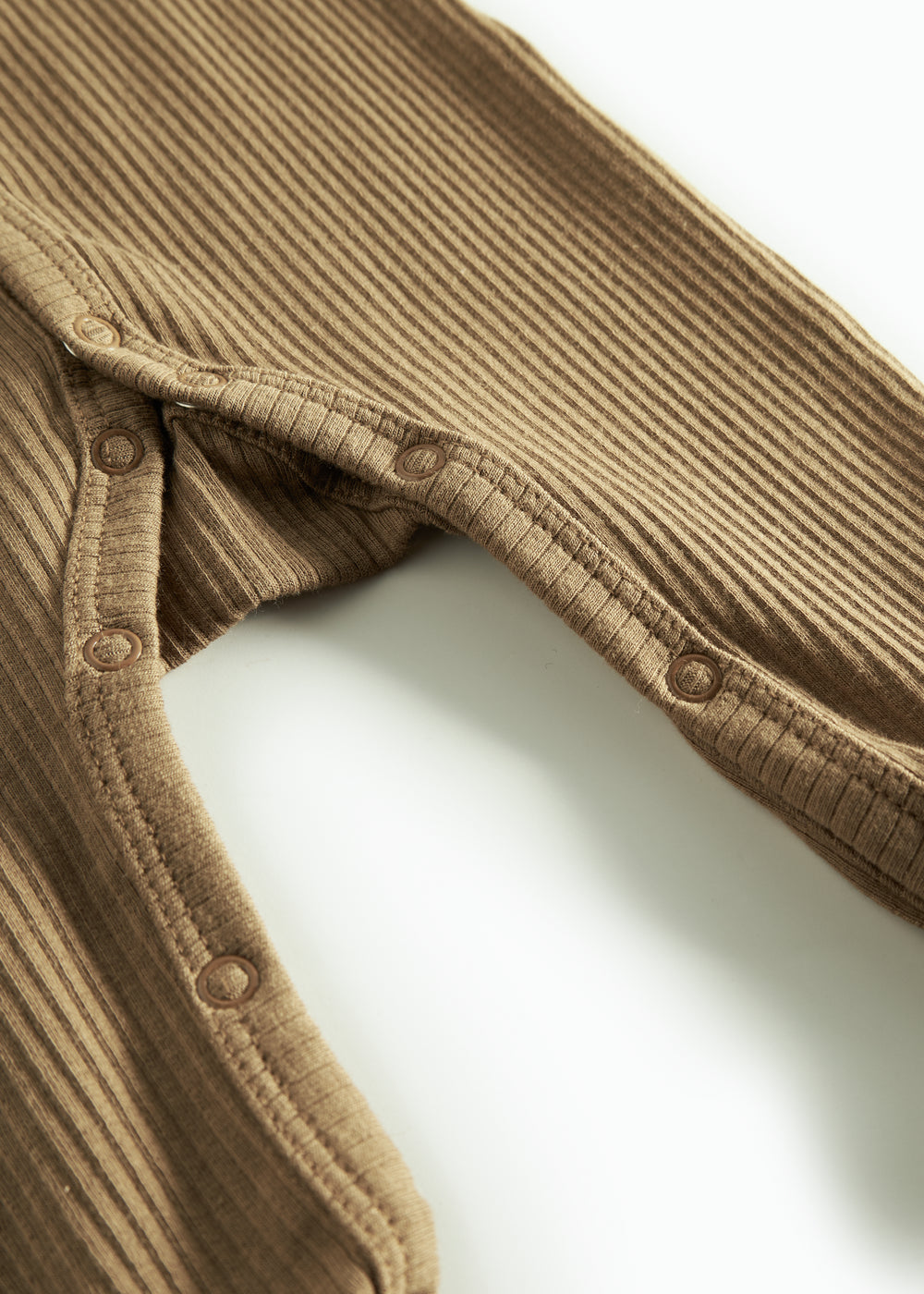 Enkel langærmet heldragt med fødder der kan knappes helt fra hals og ned langs begge ben med trykknapper for nem bleskiftning. Heldragten er både blød, holder form og farve og har elastan i sig som gør den strækbar og behagelig at have på.