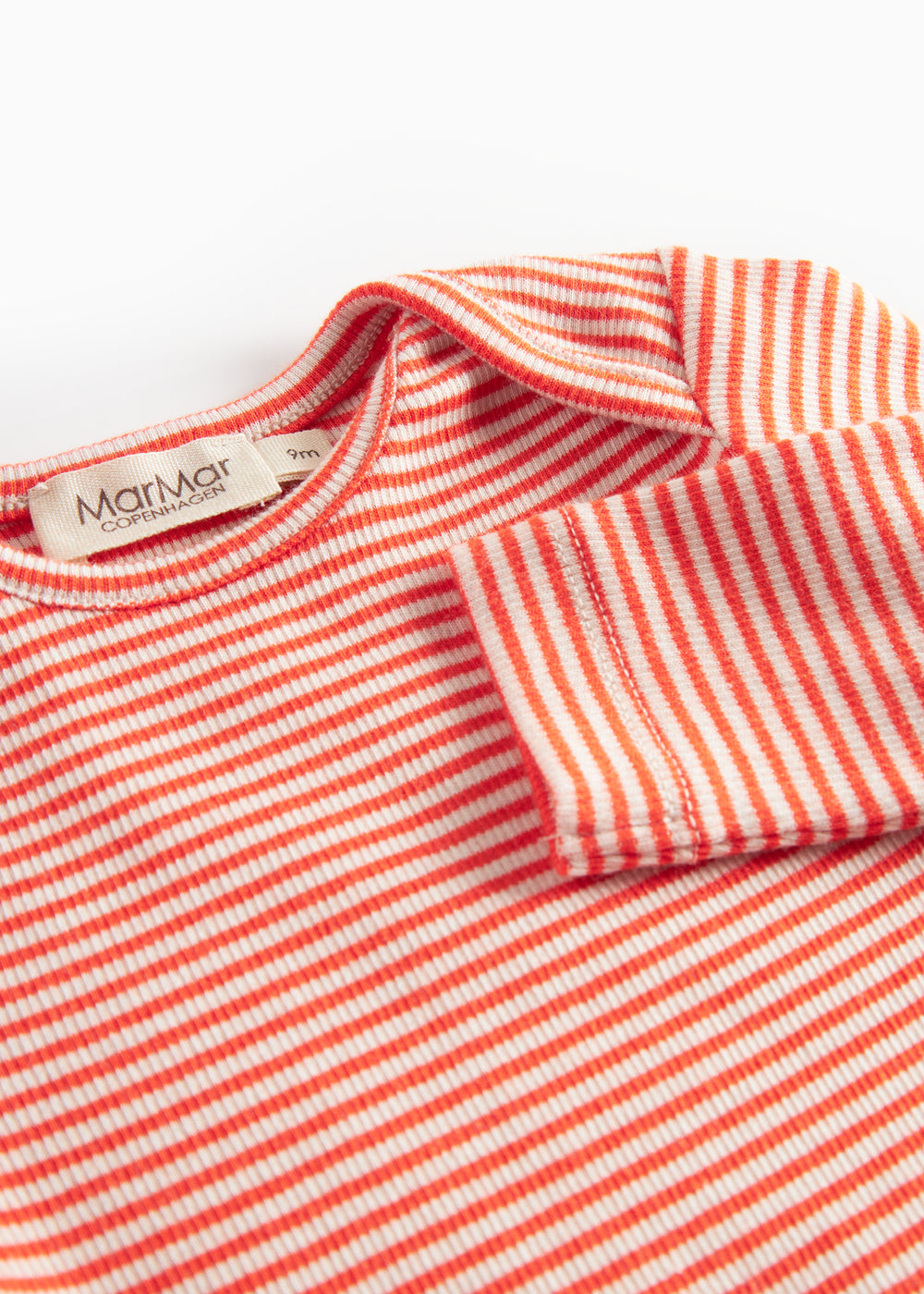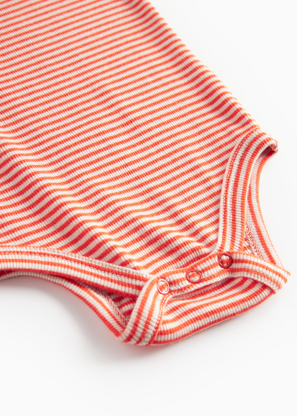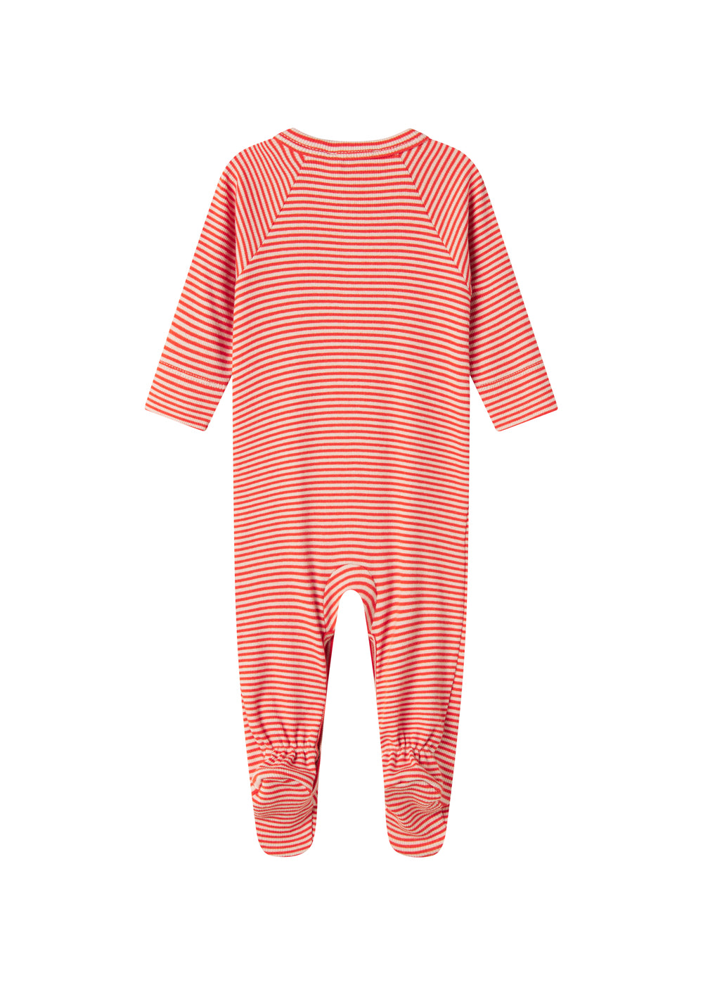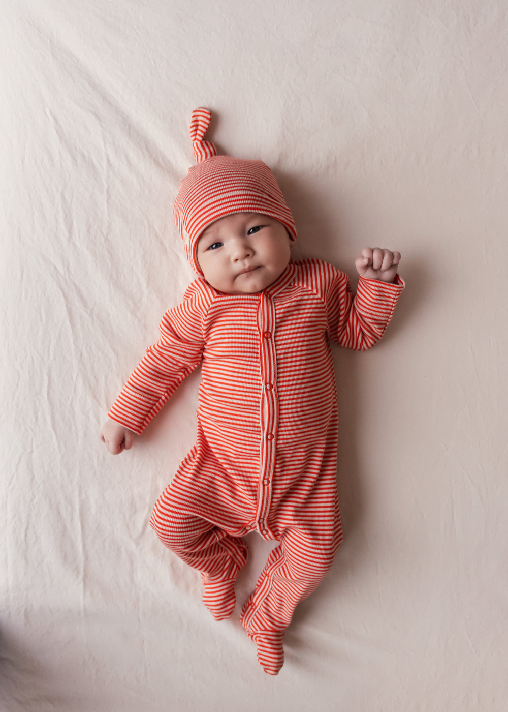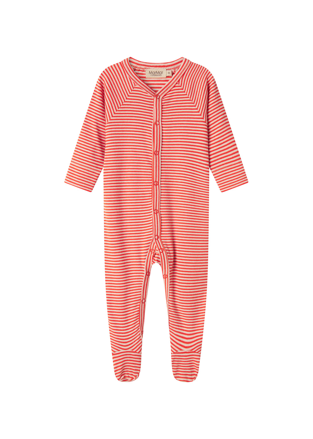 Enkel langærmet heldragt med fødder og fine striber, der kan knappes helt fra hals og ned langs begge ben med trykknapper for nem bleskiftning. Heldragten er både blød, holder form og farve og har elastan i sig som gør den strækbar og behagelig at have på.